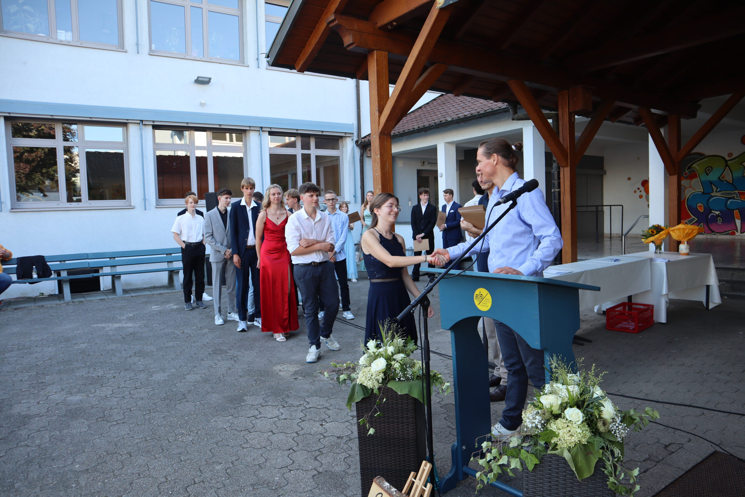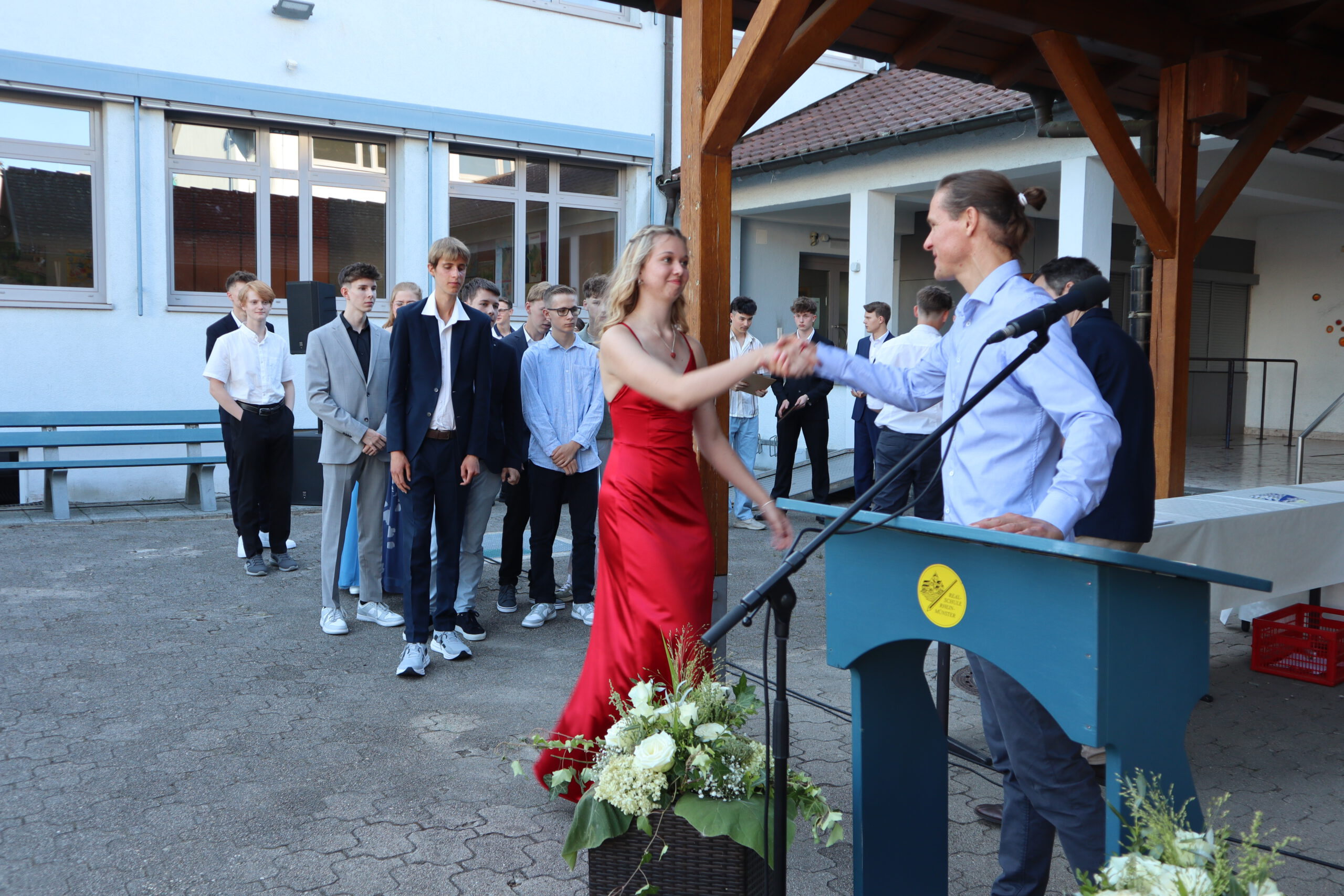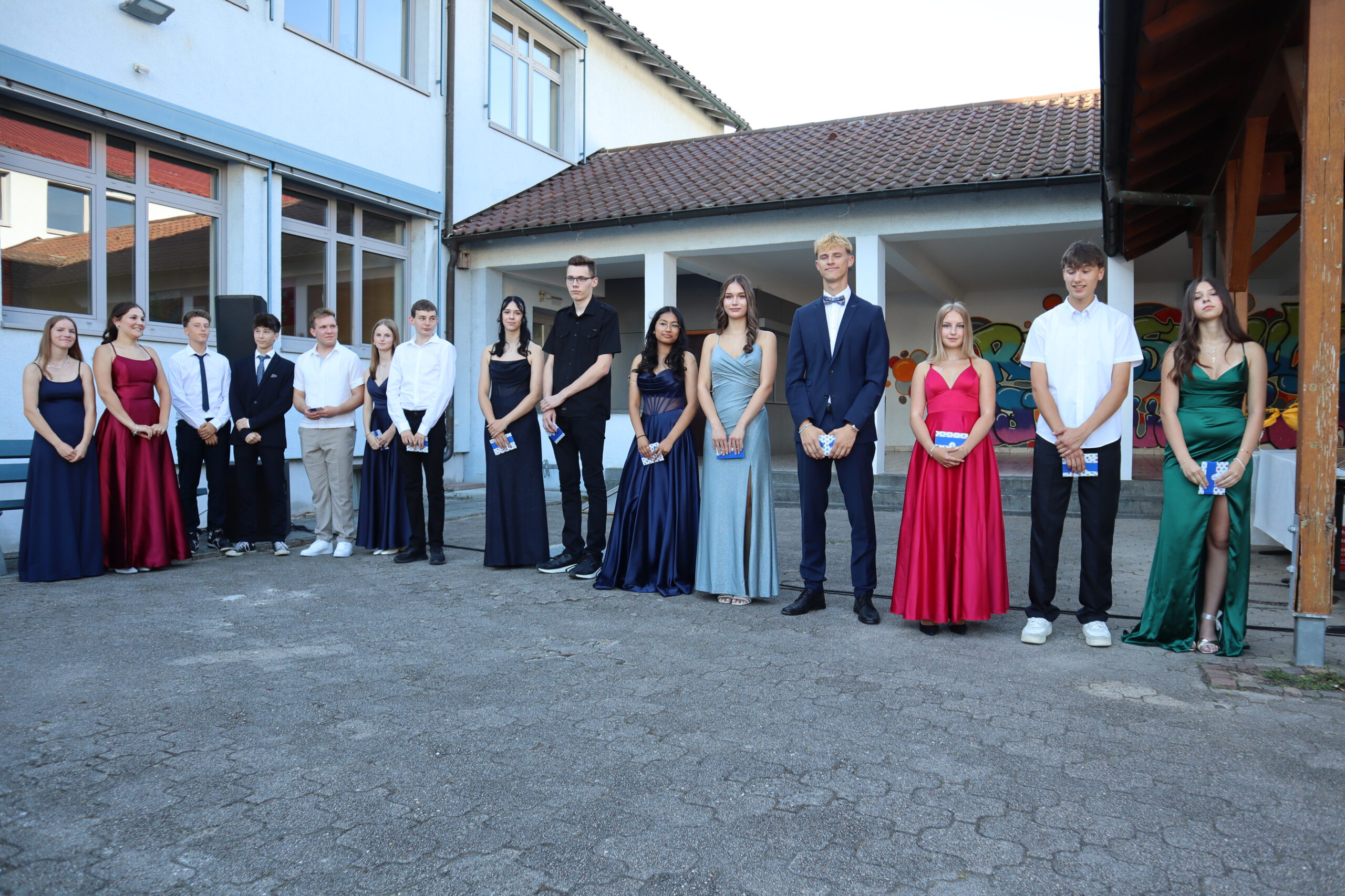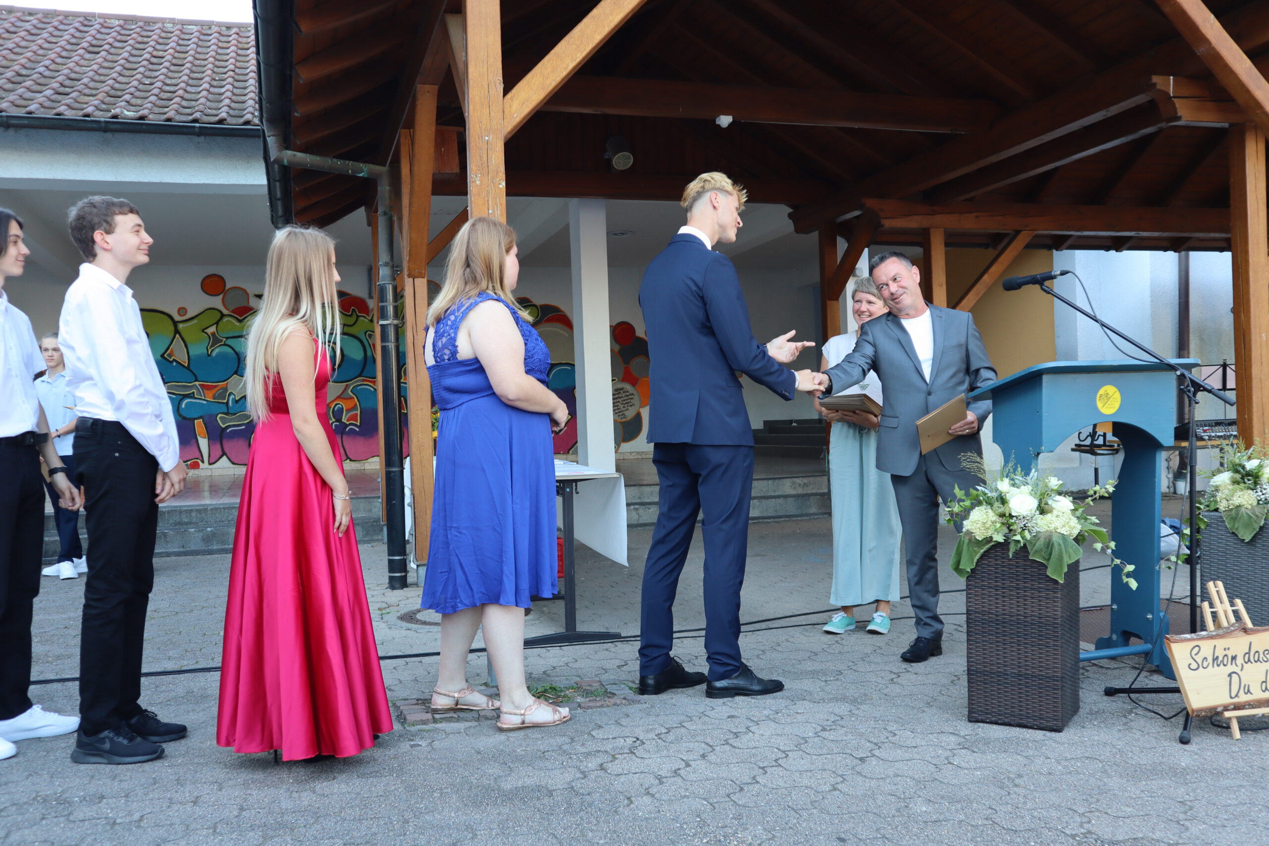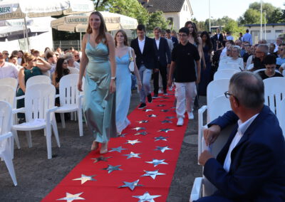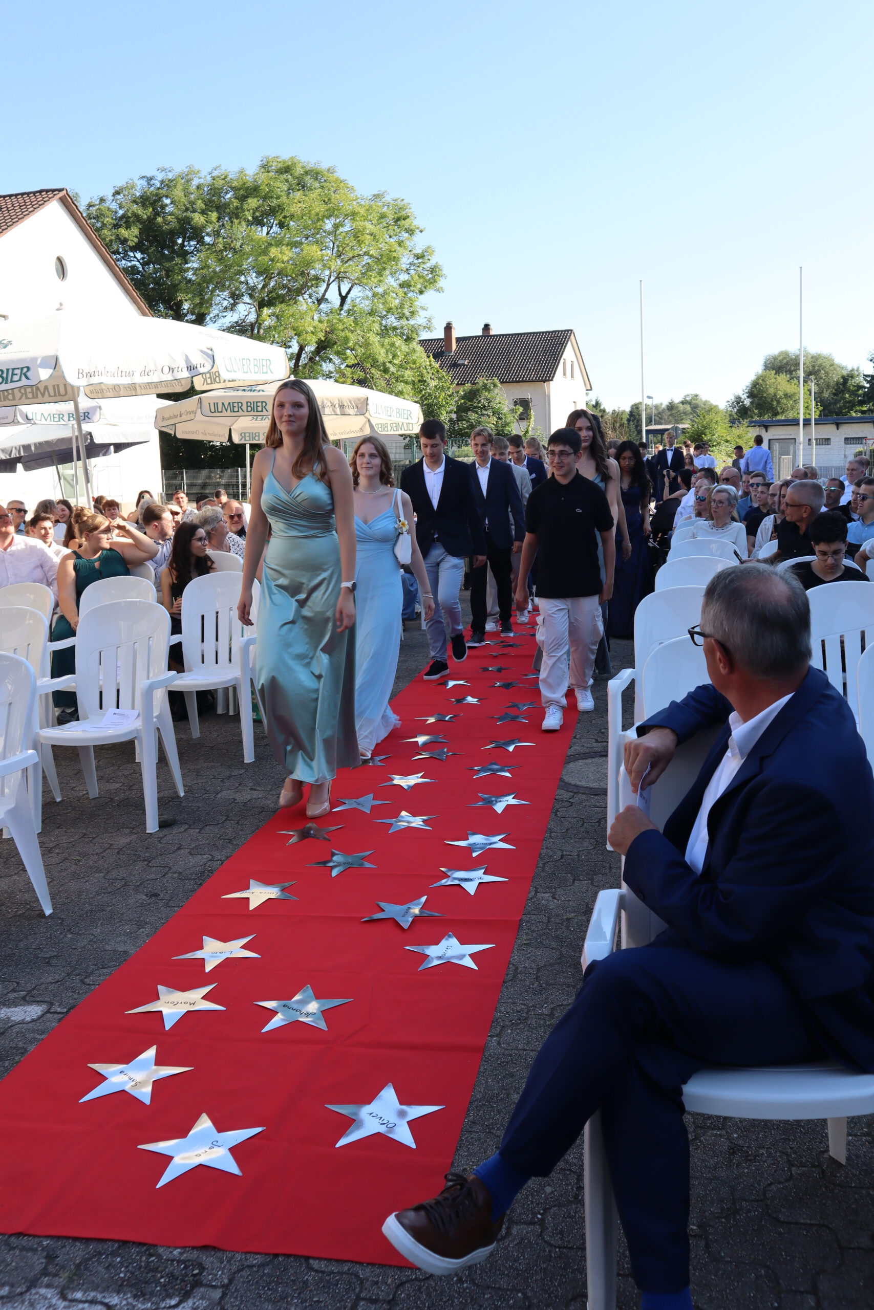 Alle 48 Zehntklässler der Realschule Rheinmünster haben die Prüfungen zur Mittleren Reife bestanden. Mit einer Trilogie aus Feierlichkeiten wurden sie am Freitagabend in einen neuen Lebensabschnitt verabschiedet: Den Auftakt bildete ein ökumenischer Gottesdienst im Schwarzacher Münster, den die Religionslehrer zusammen mit einigen Entlass-Schülern unter dem Motto „Pechvogel & Glückspilz“ liebevoll gestaltet hatten. Weiter ging es bei strahlendem Sommerwetter mit der eigentlichen Abschlussfeier und der Zeugnisausgabe im Schulhof. Über einen mit Sternen geschmückten roten Teppich, der an den Walk of Fame in Hollywood erinnerte, liefen die Absolventinnen und Absolventen ein. Konrektor Thomas Herrmann begrüßte die Ehrengäste, darunter Bürgermeister Thomas Lachnicht sowie die Rektorinnen der umliegenden Grundschulen, die den Werdegang ihrer ehemaligen Schützlinge weiterhin verfolgen. Rektor Rolf Schemel zeigte sich sehr erfreut über den Gesamtnotendurchschnitt von 2,2 und zog in seiner Ansprache Parallelen zur Welt des Fußballs: „Mit 66 Schülern seid ihr vor sechs Jahren hier gestartet, einige Spieler mussten im Laufe der Zeit die ‚Liga‘ wechseln und haben im letzten Jahr schon ihren Hauptschulabschluss hier gemacht, manche schieden in den Vorrunden aus, aber Ihr steht heute hier und habt euer Bestes gegeben.“ Schemel dankte den Eltern, die ihre Kinder – besonders während der Corona-Pandemie – oftmals „von der Seitenlinie aus“ hätten motivieren müssen und bedachte auch die Elternvertreter mit Dankesworten für ihr Engagement. Von den Absolventen beginnen 15 eine duale Berufsausbildung, weitere 15 wechseln auf ein berufliches Gymnasium und ein paar starten ein Freiwilliges Soziales Jahr oder werden eine berufsvorbereitende Fachschule besuchen. Bürgermeister Thomas Lachnicht erinnerte die Anwesenden an seine eigene – damals gänzlich analoge – Schulzeit, ganz ohne WLAN, i-Pad und soziale Netzwerke. Er begrüße die Möglichkeiten und Freiheiten, die all diese Dinge mit sich brächten, mahnte die Entlass-Schüler jedoch auch: „Lasst euch nicht dazu verleiten, euch ständig mit anderen zu vergleichen – jeder Einzelne von euch hat gezeigt, dass er etwas kann!“ Lachnicht oblag es, dem Schulbesten, Hannes Hörig aus Vimbuch, für seinen Gesamtnotenschnitt von 1,1 den Preis der Gemeinde Rheinmünster zu überreichen. Nach den kurzweiligen, humorvollen und emotionalen Rückblicken der beiden Klassenlehrer Olaf Frietsch (10a) und Marcus Lingnau (10b) erhielten die Mittlere-Reife-Geprüften schließlich ihre Zeugnisse.