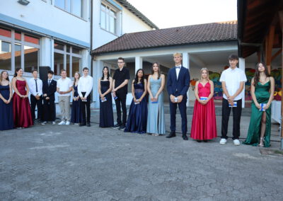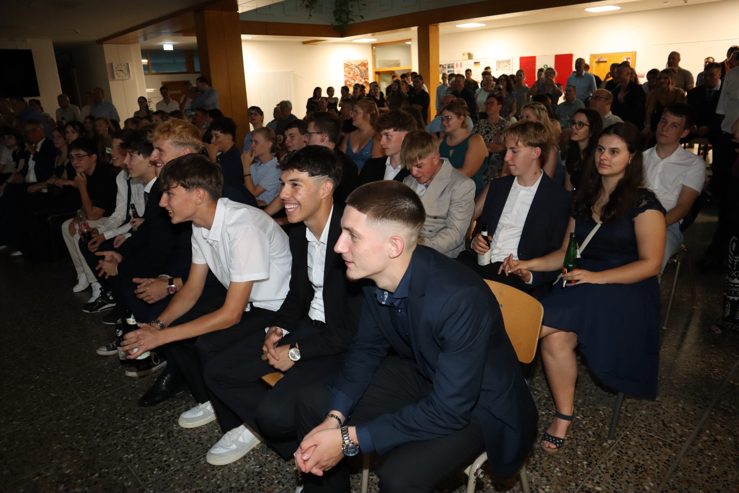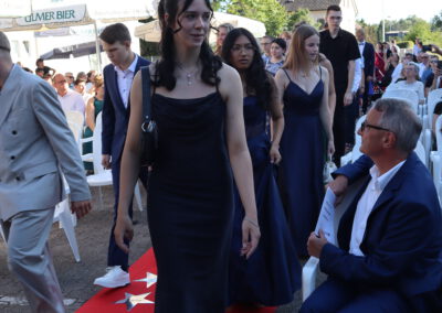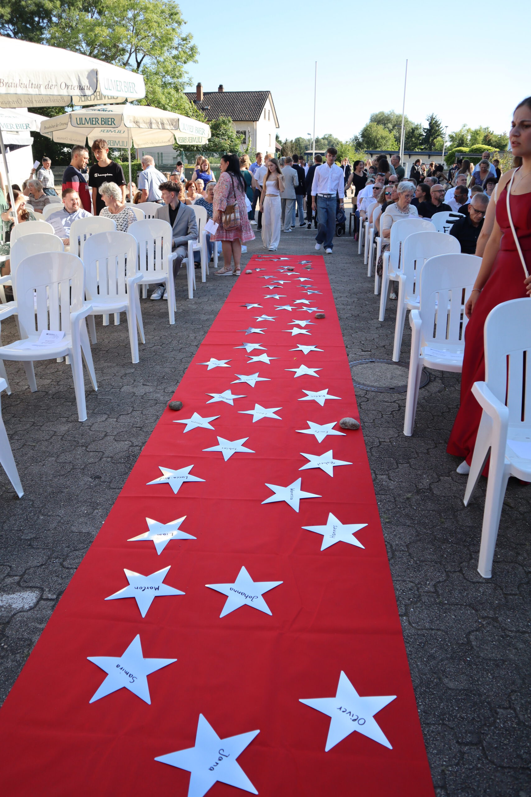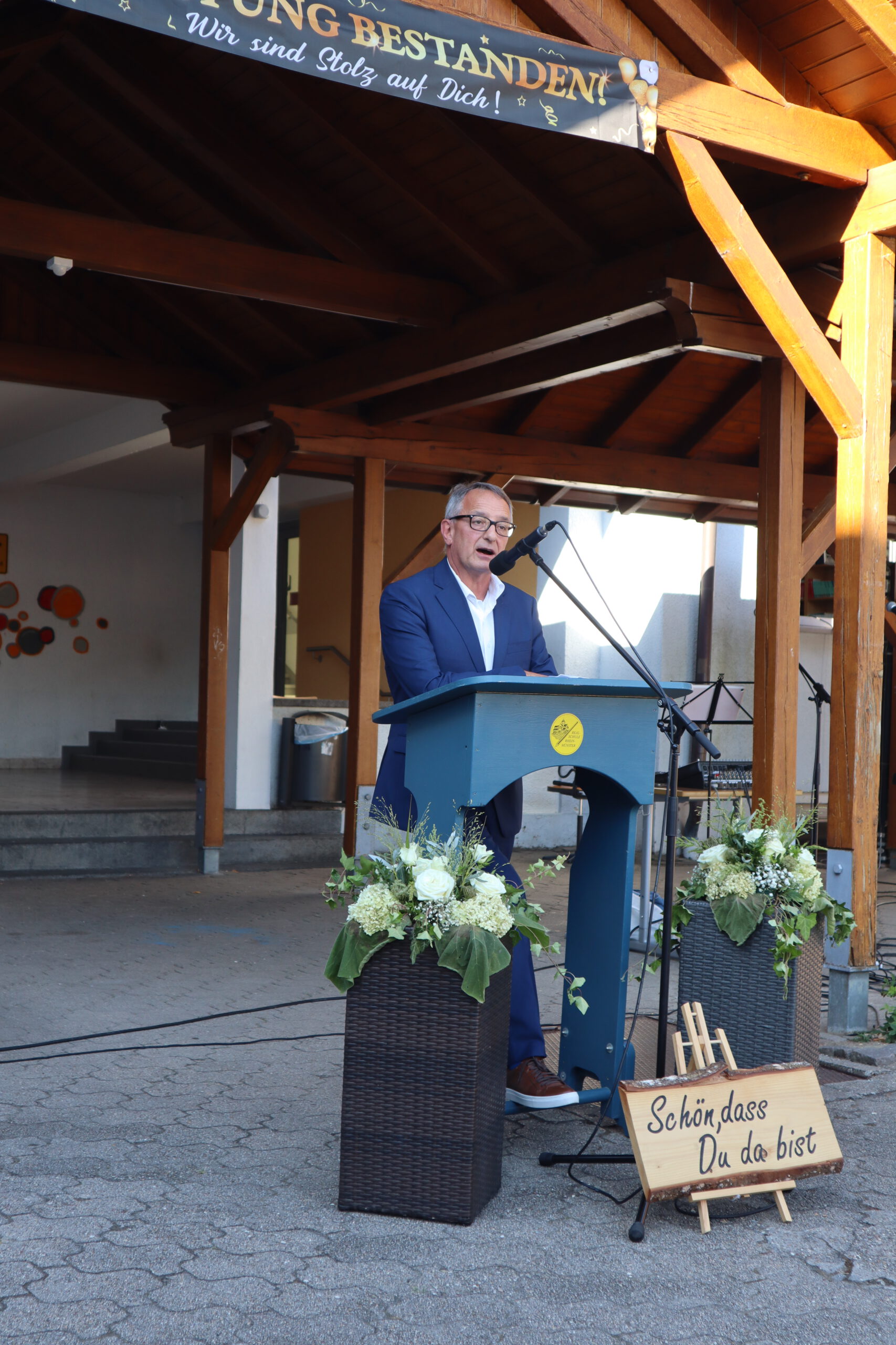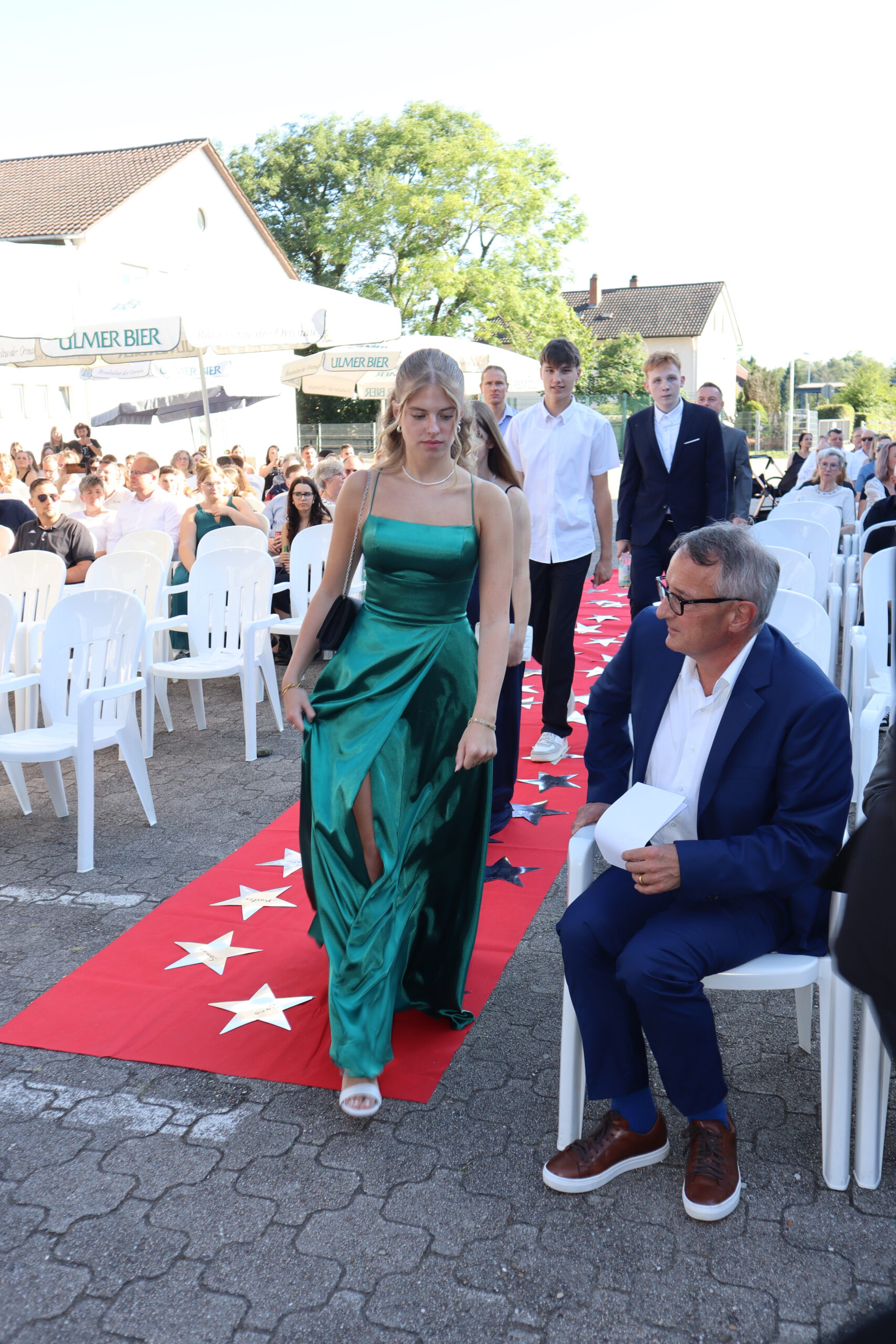 Alle 48 Zehntklässler der Realschule Rheinmünster haben die Prüfungen zur Mittleren Reife bestanden. Mit einer Trilogie aus Feierlichkeiten wurden sie am Freitagabend in einen neuen Lebensabschnitt verabschiedet: Den Auftakt bildete ein ökumenischer Gottesdienst im Schwarzacher Münster, den die Religionslehrer zusammen mit einigen Entlass-Schülern unter dem Motto „Pechvogel & Glückspilz“ liebevoll gestaltet hatten. Weiter ging es bei strahlendem Sommerwetter mit der eigentlichen Abschlussfeier und der Zeugnisausgabe im Schulhof. Über einen mit Sternen geschmückten roten Teppich, der an den Walk of Fame in Hollywood erinnerte, liefen die Absolventinnen und Absolventen ein. Konrektor Thomas Herrmann begrüßte die Ehrengäste, darunter Bürgermeister Thomas Lachnicht sowie die Rektorinnen der umliegenden Grundschulen, die den Werdegang ihrer ehemaligen Schützlinge weiterhin verfolgen. Rektor Rolf Schemel zeigte sich sehr erfreut über den Gesamtnotendurchschnitt von 2,2 und zog in seiner Ansprache Parallelen zur Welt des Fußballs: „Mit 66 Schülern seid ihr vor sechs Jahren hier gestartet, einige Spieler mussten im Laufe der Zeit die ‚Liga‘ wechseln und haben im letzten Jahr schon ihren Hauptschulabschluss hier gemacht, manche schieden in den Vorrunden aus, aber Ihr steht heute hier und habt euer Bestes gegeben.“ Schemel dankte den Eltern, die ihre Kinder – besonders während der Corona-Pandemie – oftmals „von der Seitenlinie aus“ hätten motivieren müssen und bedachte auch die Elternvertreter mit Dankesworten für ihr Engagement. Von den Absolventen beginnen 15 eine duale Berufsausbildung, weitere 15 wechseln auf ein berufliches Gymnasium und ein paar starten ein Freiwilliges Soziales Jahr oder werden eine berufsvorbereitende Fachschule besuchen. Bürgermeister Thomas Lachnicht erinnerte die Anwesenden an seine eigene – damals gänzlich analoge – Schulzeit, ganz ohne WLAN, i-Pad und soziale Netzwerke. Er begrüße die Möglichkeiten und Freiheiten, die all diese Dinge mit sich brächten, mahnte die Entlass-Schüler jedoch auch: „Lasst euch nicht dazu verleiten, euch ständig mit anderen zu vergleichen – jeder Einzelne von euch hat gezeigt, dass er etwas kann!“ Lachnicht oblag es, dem Schulbesten, Hannes Hörig aus Vimbuch, für seinen Gesamtnotenschnitt von 1,1 den Preis der Gemeinde Rheinmünster zu überreichen. Nach den kurzweiligen, humorvollen und emotionalen Rückblicken der beiden Klassenlehrer Olaf Frietsch (10a) und Marcus Lingnau (10b) erhielten die Mittlere-Reife-Geprüften schließlich ihre Zeugnisse.