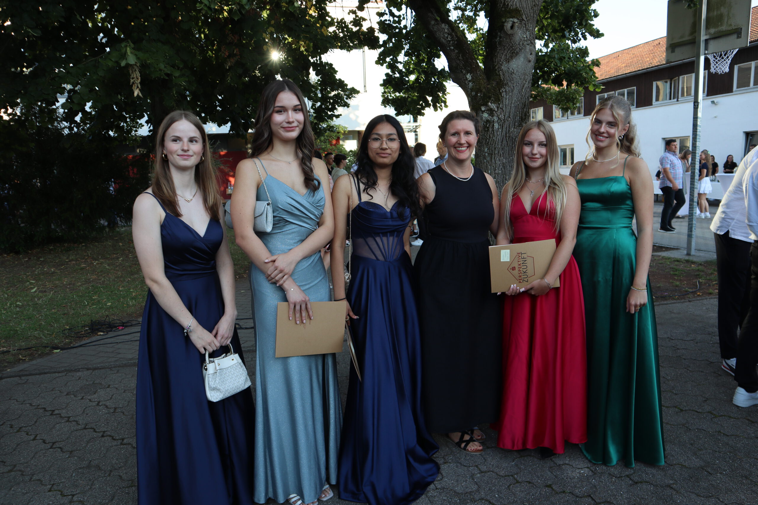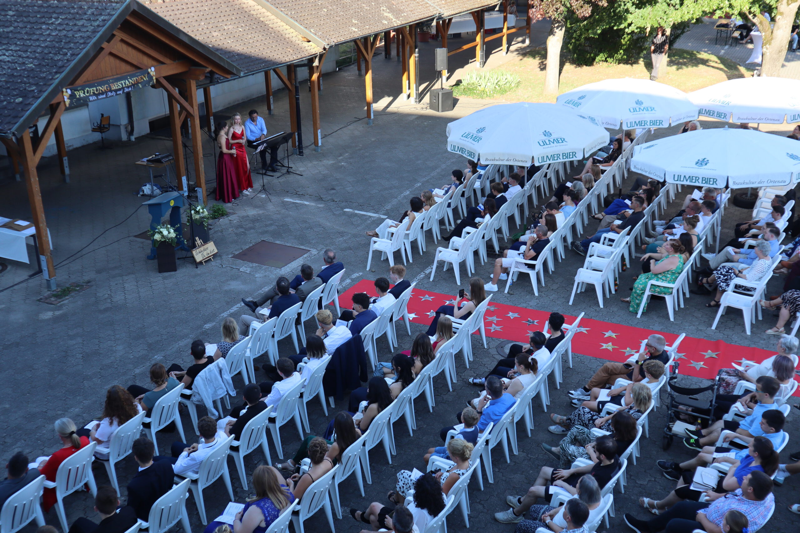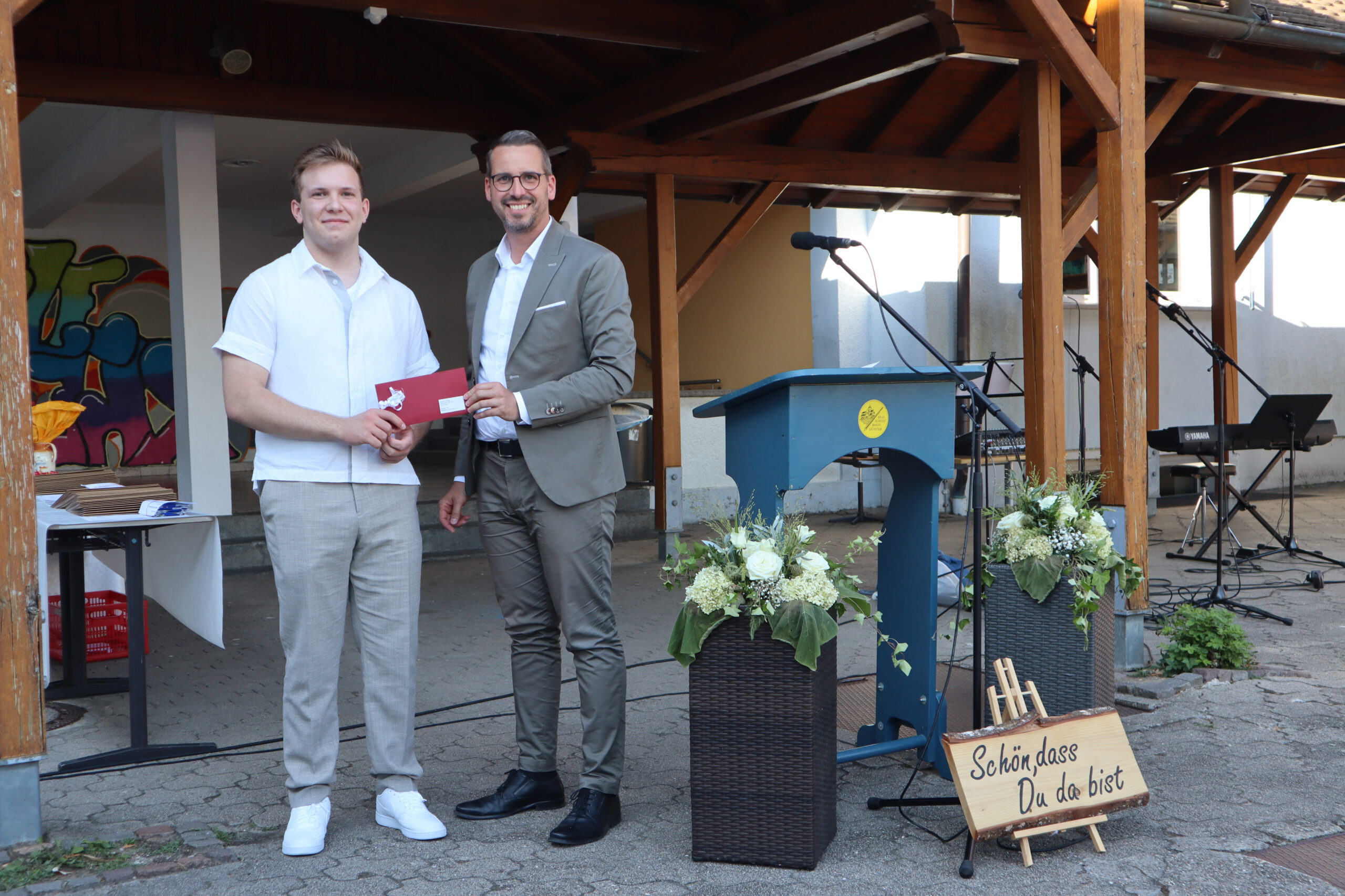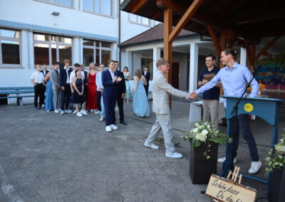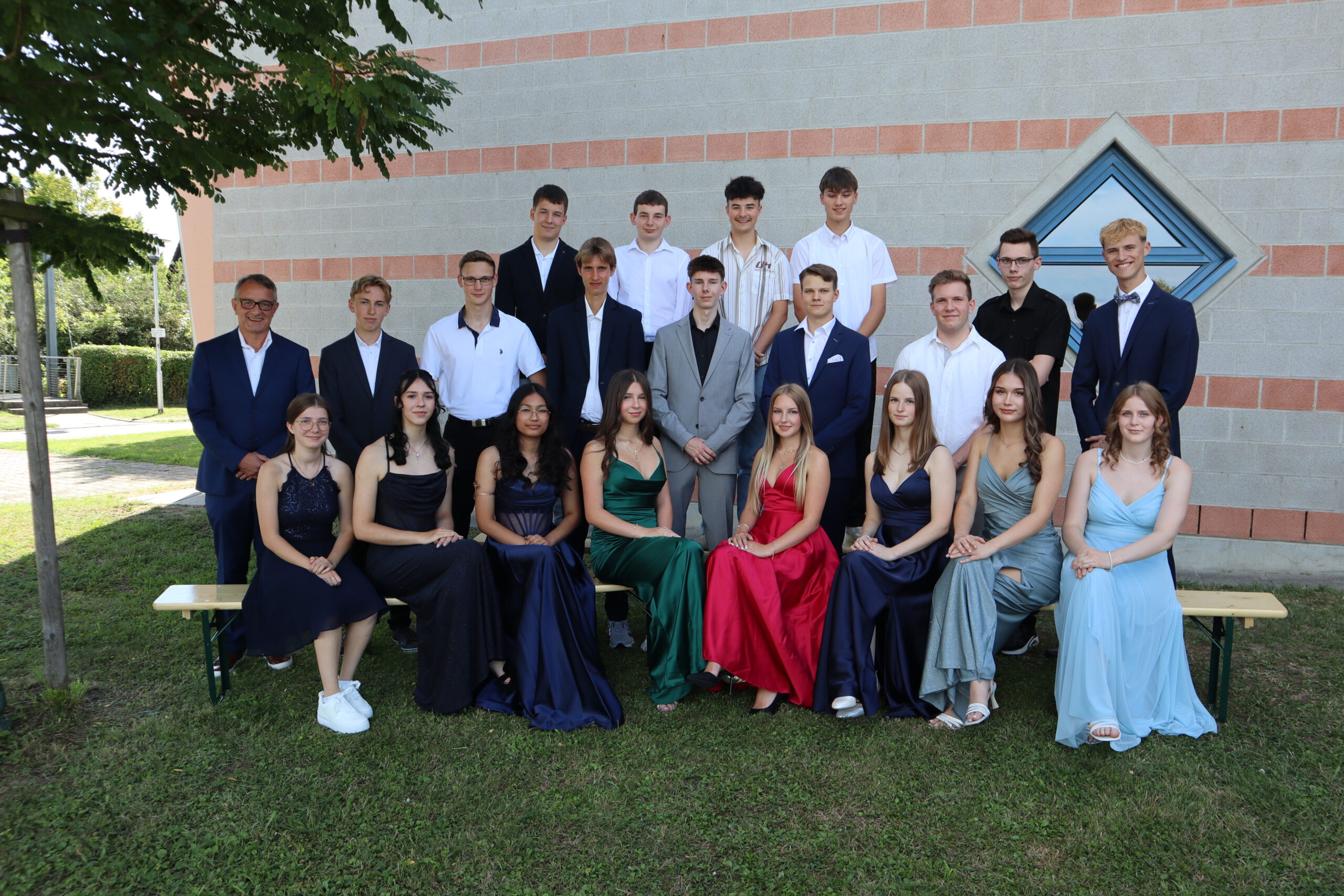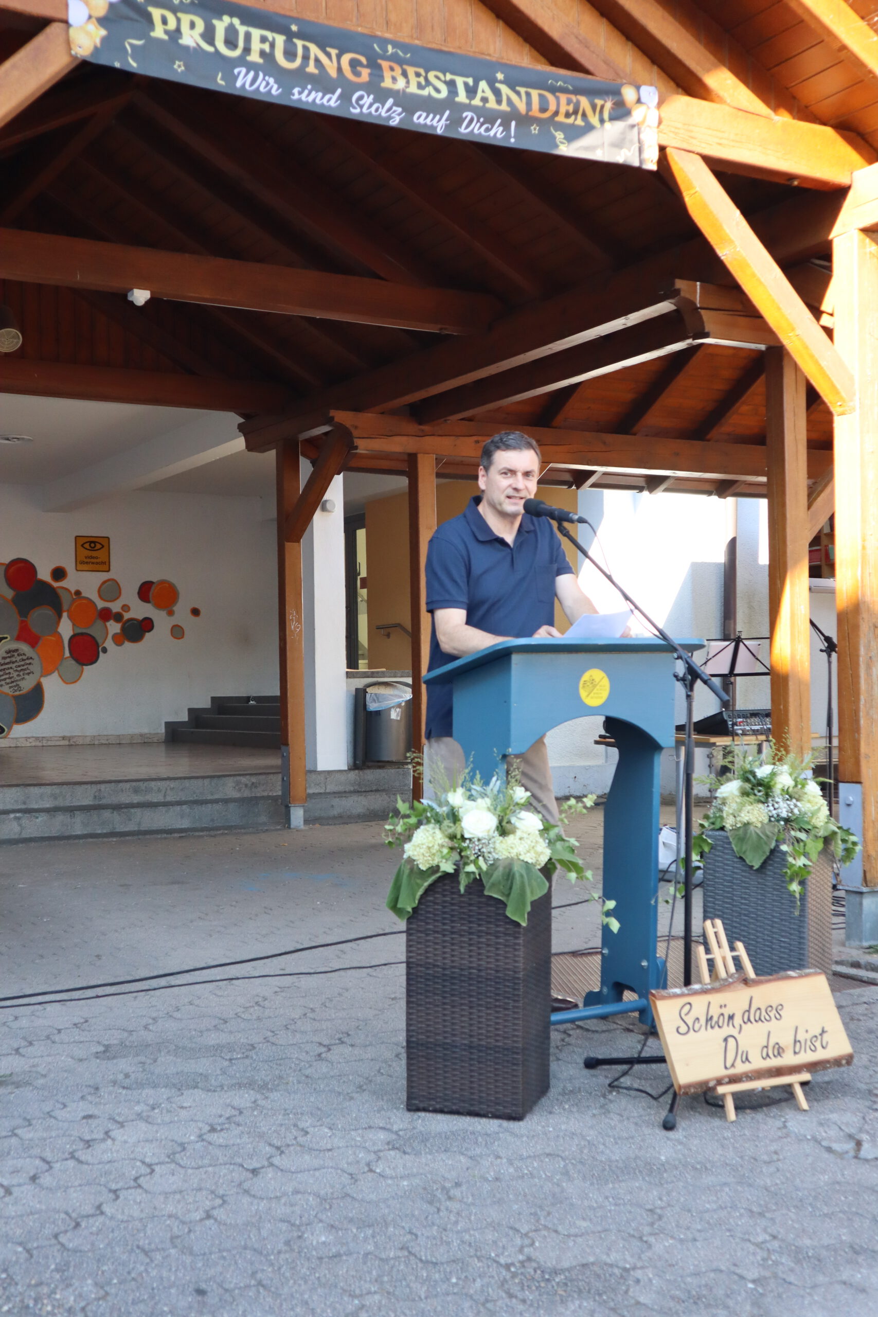 Alle 48 Zehntklässler der Realschule Rheinmünster haben die Prüfungen zur Mittleren Reife bestanden. Mit einer Trilogie aus Feierlichkeiten wurden sie am Freitagabend in einen neuen Lebensabschnitt verabschiedet: Den Auftakt bildete ein ökumenischer Gottesdienst im Schwarzacher Münster, den die Religionslehrer zusammen mit einigen Entlass-Schülern unter dem Motto „Pechvogel & Glückspilz“ liebevoll gestaltet hatten. Weiter ging es bei strahlendem Sommerwetter mit der eigentlichen Abschlussfeier und der Zeugnisausgabe im Schulhof. Über einen mit Sternen geschmückten roten Teppich, der an den Walk of Fame in Hollywood erinnerte, liefen die Absolventinnen und Absolventen ein. Konrektor Thomas Herrmann begrüßte die Ehrengäste, darunter Bürgermeister Thomas Lachnicht sowie die Rektorinnen der umliegenden Grundschulen, die den Werdegang ihrer ehemaligen Schützlinge weiterhin verfolgen. Rektor Rolf Schemel zeigte sich sehr erfreut über den Gesamtnotendurchschnitt von 2,2 und zog in seiner Ansprache Parallelen zur Welt des Fußballs: „Mit 66 Schülern seid ihr vor sechs Jahren hier gestartet, einige Spieler mussten im Laufe der Zeit die ‚Liga‘ wechseln und haben im letzten Jahr schon ihren Hauptschulabschluss hier gemacht, manche schieden in den Vorrunden aus, aber Ihr steht heute hier und habt euer Bestes gegeben.“ Schemel dankte den Eltern, die ihre Kinder – besonders während der Corona-Pandemie – oftmals „von der Seitenlinie aus“ hätten motivieren müssen und bedachte auch die Elternvertreter mit Dankesworten für ihr Engagement. Von den Absolventen beginnen 15 eine duale Berufsausbildung, weitere 15 wechseln auf ein berufliches Gymnasium und ein paar starten ein Freiwilliges Soziales Jahr oder werden eine berufsvorbereitende Fachschule besuchen. Bürgermeister Thomas Lachnicht erinnerte die Anwesenden an seine eigene – damals gänzlich analoge – Schulzeit, ganz ohne WLAN, i-Pad und soziale Netzwerke. Er begrüße die Möglichkeiten und Freiheiten, die all diese Dinge mit sich brächten, mahnte die Entlass-Schüler jedoch auch: „Lasst euch nicht dazu verleiten, euch ständig mit anderen zu vergleichen – jeder Einzelne von euch hat gezeigt, dass er etwas kann!“ Lachnicht oblag es, dem Schulbesten, Hannes Hörig aus Vimbuch, für seinen Gesamtnotenschnitt von 1,1 den Preis der Gemeinde Rheinmünster zu überreichen. Nach den kurzweiligen, humorvollen und emotionalen Rückblicken der beiden Klassenlehrer Olaf Frietsch (10a) und Marcus Lingnau (10b) erhielten die Mittlere-Reife-Geprüften schließlich ihre Zeugnisse.