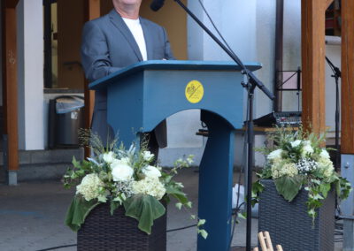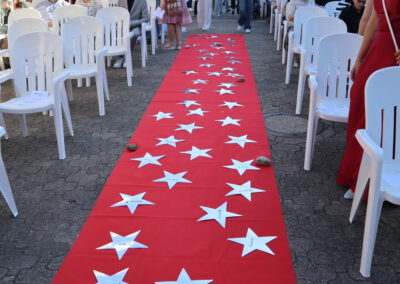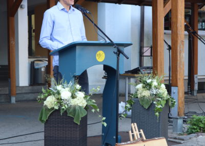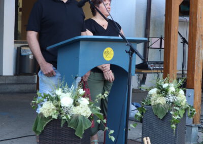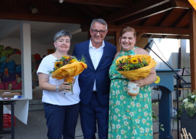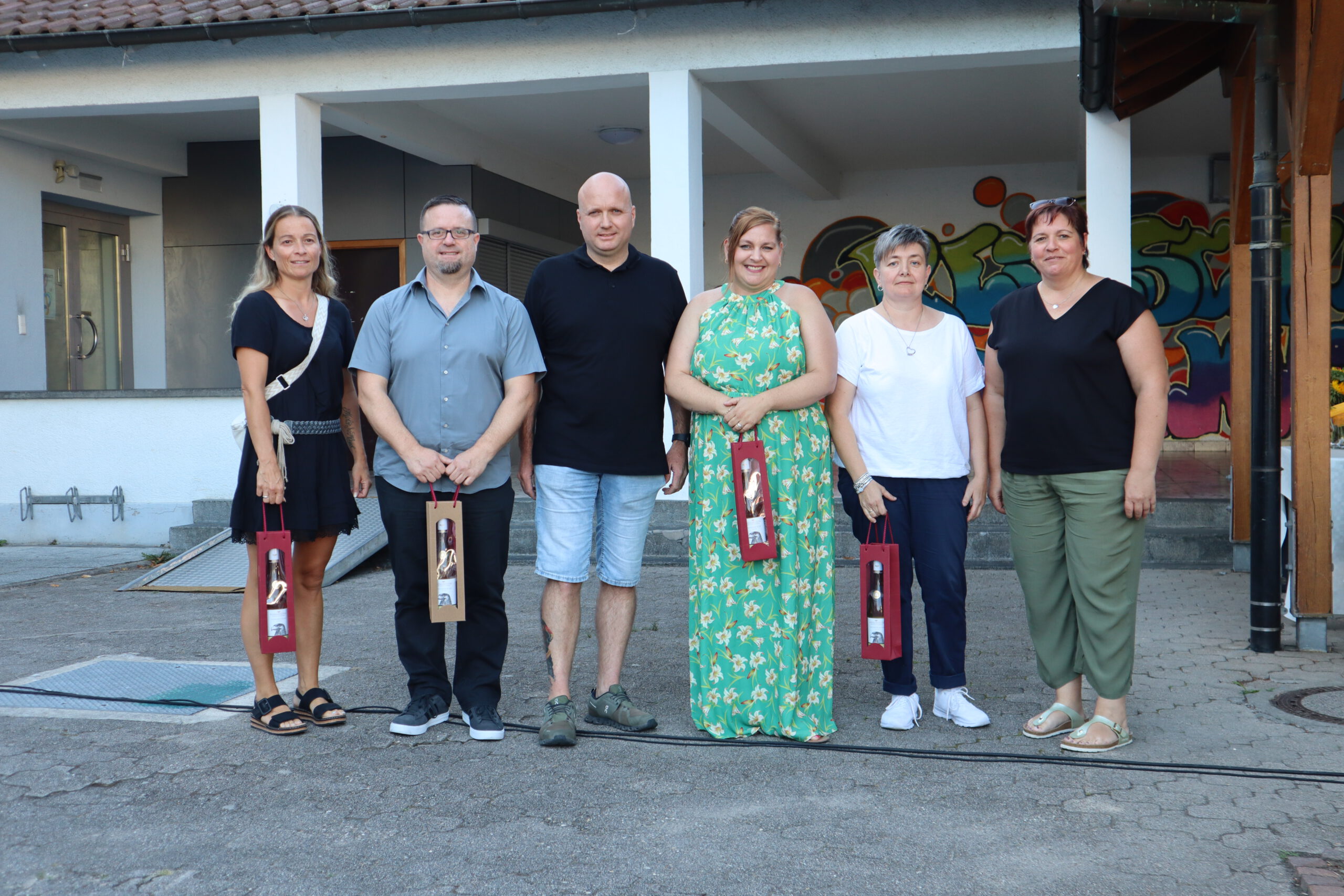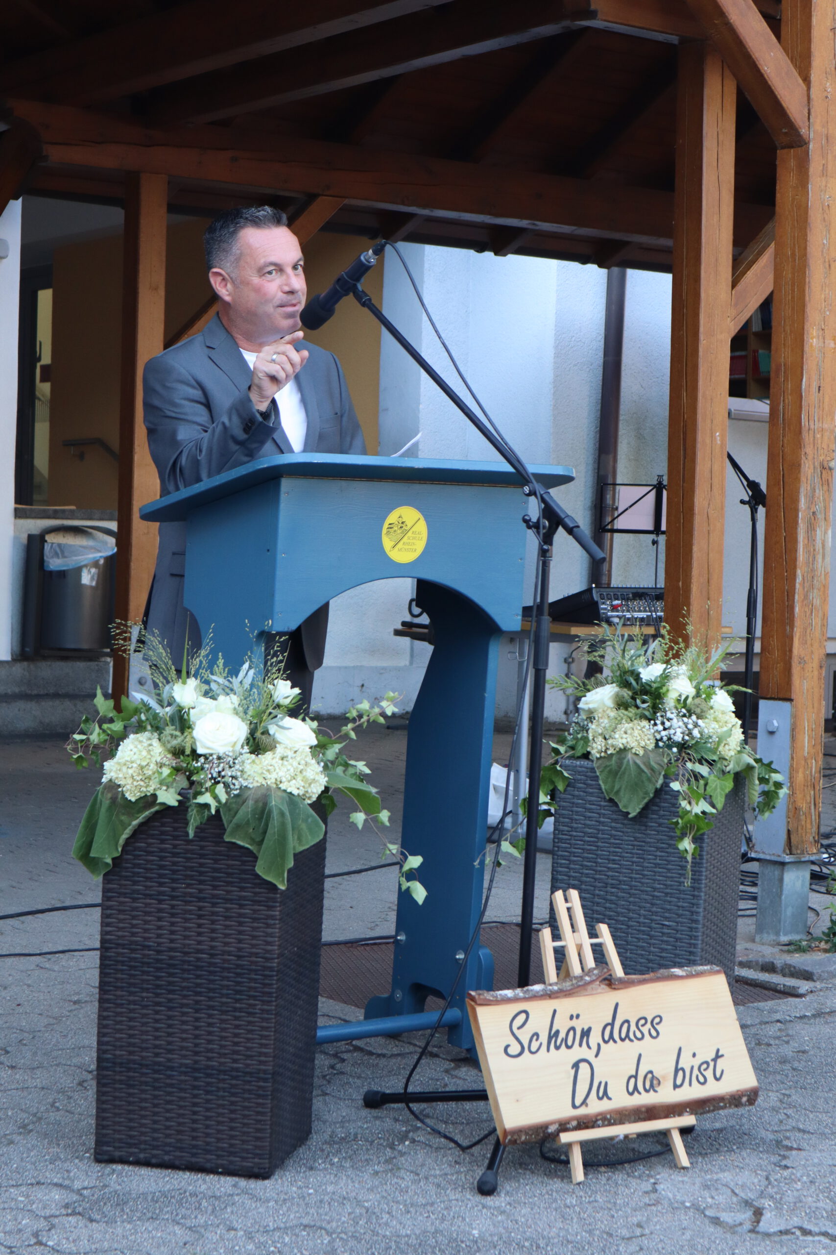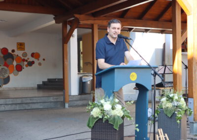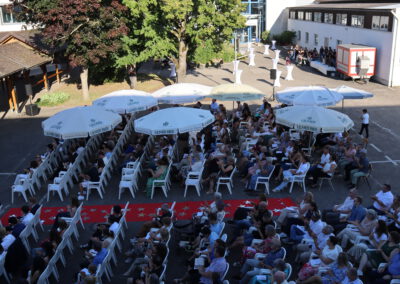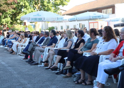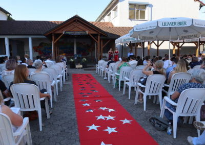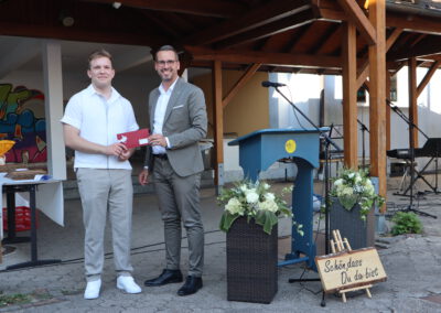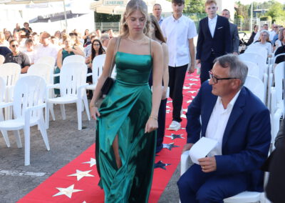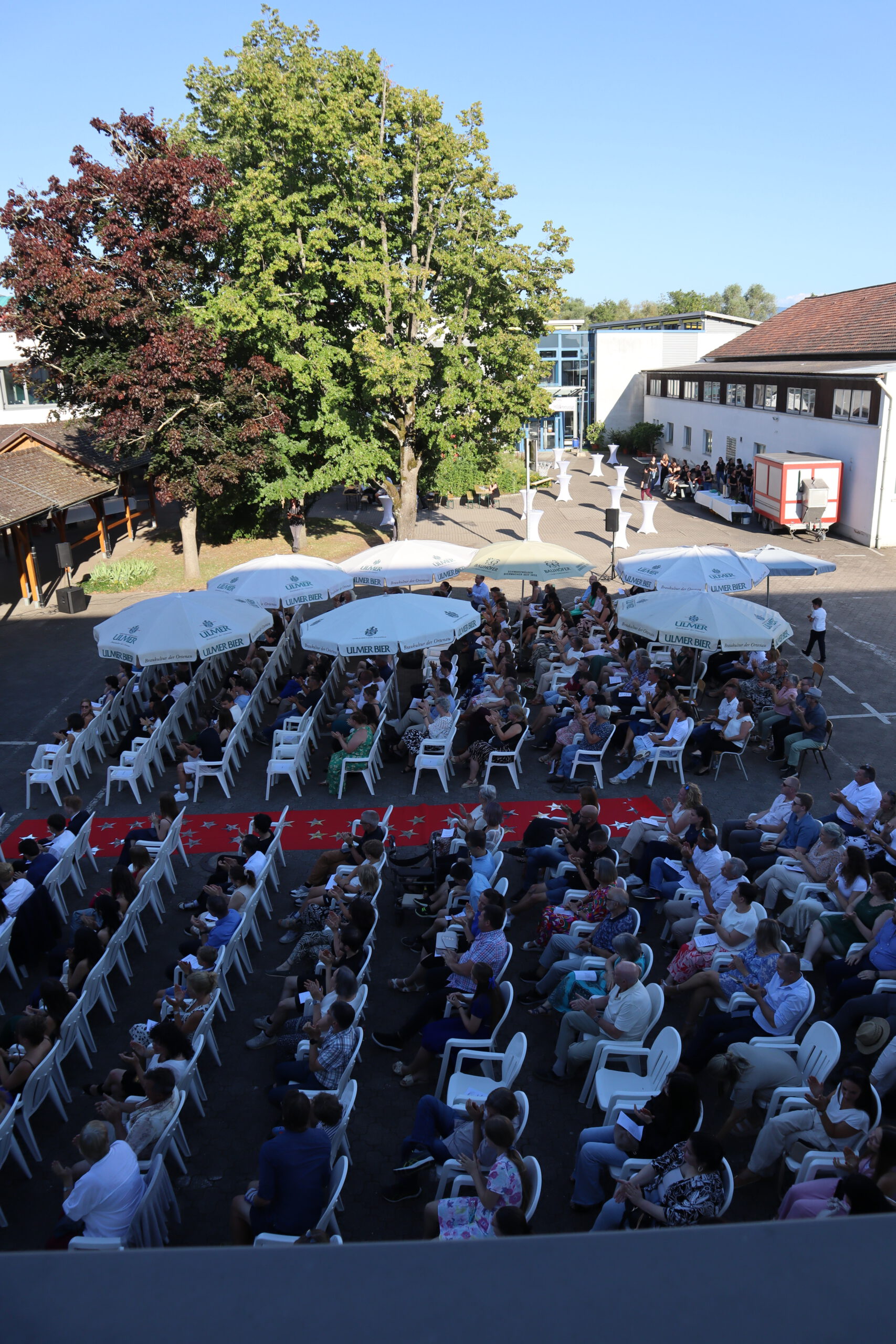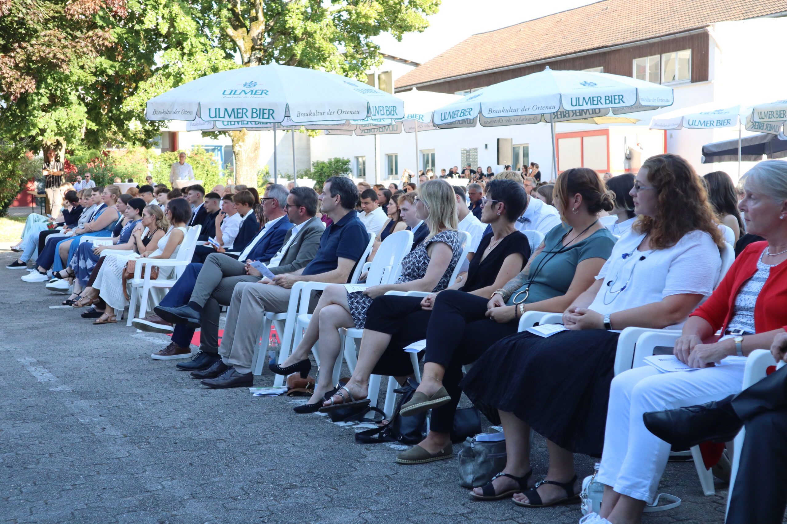 Alle 48 Zehntklässler der Realschule Rheinmünster haben die Prüfungen zur Mittleren Reife bestanden. Mit einer Trilogie aus Feierlichkeiten wurden sie am Freitagabend in einen neuen Lebensabschnitt verabschiedet: Den Auftakt bildete ein ökumenischer Gottesdienst im Schwarzacher Münster, den die Religionslehrer zusammen mit einigen Entlass-Schülern unter dem Motto „Pechvogel & Glückspilz“ liebevoll gestaltet hatten. Weiter ging es bei strahlendem Sommerwetter mit der eigentlichen Abschlussfeier und der Zeugnisausgabe im Schulhof. Über einen mit Sternen geschmückten roten Teppich, der an den Walk of Fame in Hollywood erinnerte, liefen die Absolventinnen und Absolventen ein. Konrektor Thomas Herrmann begrüßte die Ehrengäste, darunter Bürgermeister Thomas Lachnicht sowie die Rektorinnen der umliegenden Grundschulen, die den Werdegang ihrer ehemaligen Schützlinge weiterhin verfolgen. Rektor Rolf Schemel zeigte sich sehr erfreut über den Gesamtnotendurchschnitt von 2,2 und zog in seiner Ansprache Parallelen zur Welt des Fußballs: „Mit 66 Schülern seid ihr vor sechs Jahren hier gestartet, einige Spieler mussten im Laufe der Zeit die ‚Liga‘ wechseln und haben im letzten Jahr schon ihren Hauptschulabschluss hier gemacht, manche schieden in den Vorrunden aus, aber Ihr steht heute hier und habt euer Bestes gegeben.“ Schemel dankte den Eltern, die ihre Kinder – besonders während der Corona-Pandemie – oftmals „von der Seitenlinie aus“ hätten motivieren müssen und bedachte auch die Elternvertreter mit Dankesworten für ihr Engagement. Von den Absolventen beginnen 15 eine duale Berufsausbildung, weitere 15 wechseln auf ein berufliches Gymnasium und ein paar starten ein Freiwilliges Soziales Jahr oder werden eine berufsvorbereitende Fachschule besuchen. Bürgermeister Thomas Lachnicht erinnerte die Anwesenden an seine eigene – damals gänzlich analoge – Schulzeit, ganz ohne WLAN, i-Pad und soziale Netzwerke. Er begrüße die Möglichkeiten und Freiheiten, die all diese Dinge mit sich brächten, mahnte die Entlass-Schüler jedoch auch: „Lasst euch nicht dazu verleiten, euch ständig mit anderen zu vergleichen – jeder Einzelne von euch hat gezeigt, dass er etwas kann!“ Lachnicht oblag es, dem Schulbesten, Hannes Hörig aus Vimbuch, für seinen Gesamtnotenschnitt von 1,1 den Preis der Gemeinde Rheinmünster zu überreichen. Nach den kurzweiligen, humorvollen und emotionalen Rückblicken der beiden Klassenlehrer Olaf Frietsch (10a) und Marcus Lingnau (10b) erhielten die Mittlere-Reife-Geprüften schließlich ihre Zeugnisse.