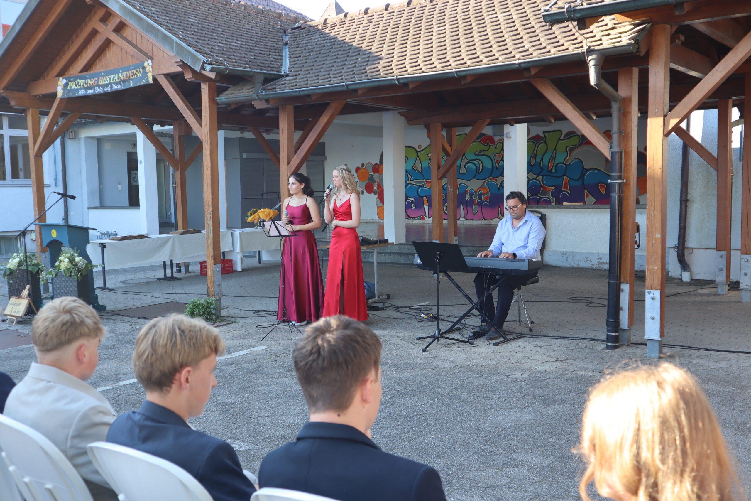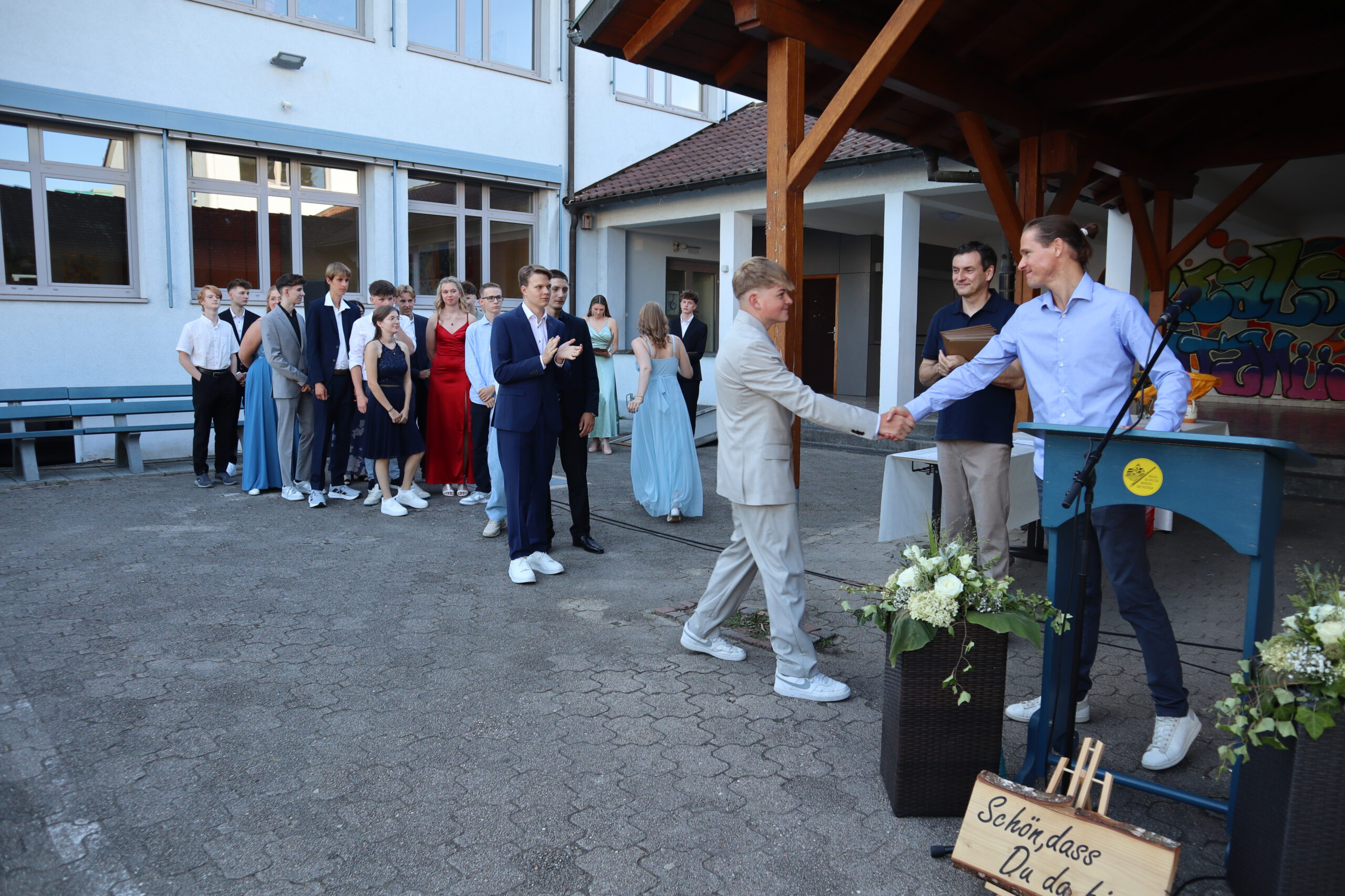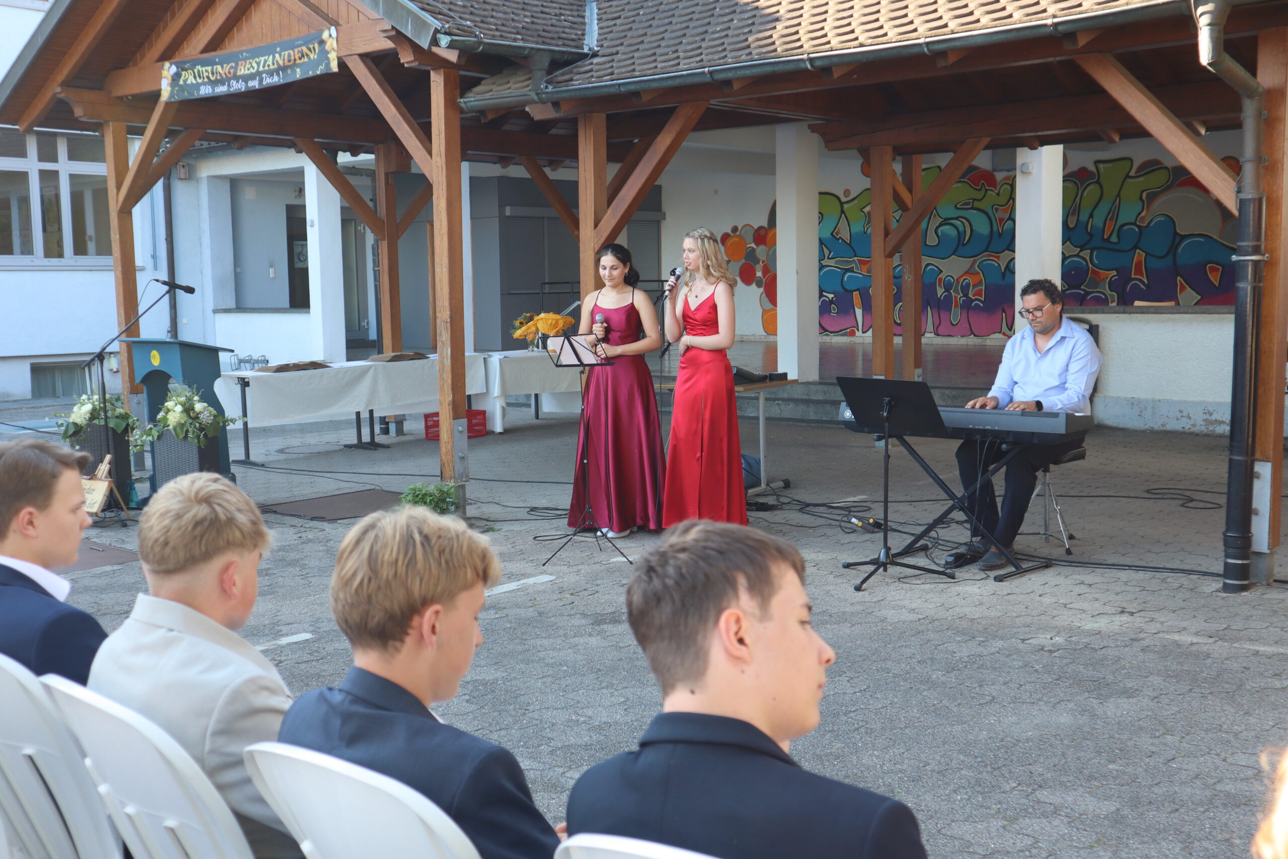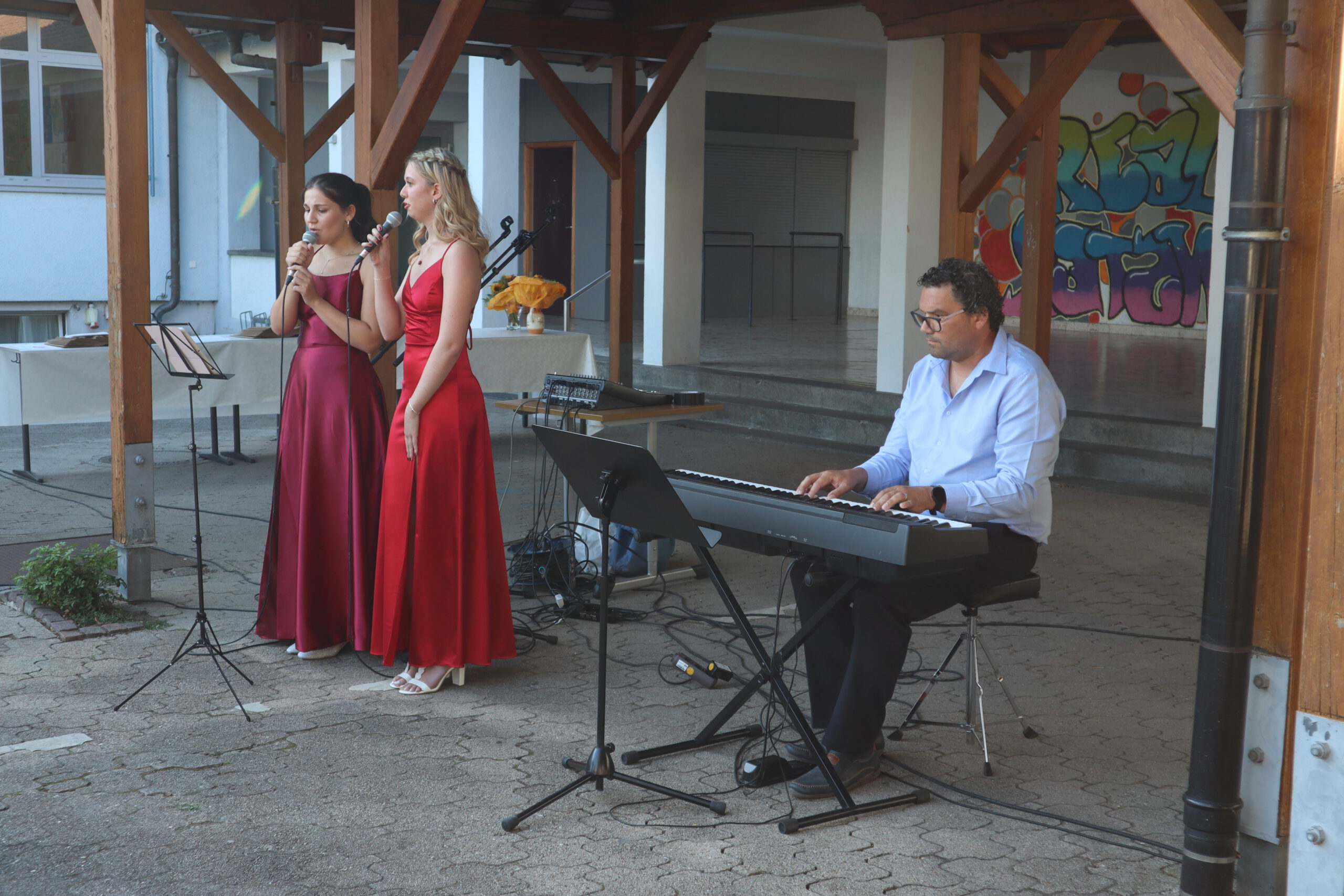 Zum Abschluss der Feier im Schulhof ließ die Elternbeiratsvorsitzende, Sandra Kautz, die Schulzeit an der Realschule noch einmal Revue passieren. In den sechs Jahren sei man miteinander durch Höhen und Tiefen gegangen, habe Freundschaften geschlossen, tolle Dinge erlebt, sei aber auch mit Leistungsanforderungen, Streit und Stress konfrontiert gewesen. Vor allem aber sei die Zeit durch die Entwicklung der jungen Menschen von Kindern zu nun fast Erwachsenen geprägt gewesen. Alle hätten heute das „Kapitel Realschule“ im Buch ihres Lebens zu Ende geschrieben. Für die weitere Lebensgeschichte rief Kautz die Absolventen dazu auf, sich durch Rückschritte und Fehltritte nicht entmutigen zu lassen, denn „jeder Schritt ist Teil eurer ganz eigenen Geschichte.“ Musikalisch passend umrahmt wurde die Feier durch den Gesang von Leonie Krauß und Laura Ruschmann. Nach den Schlussworten von Rektor Rolf Schemel folgte der letzte Teil der dreiteiligen Feierlichkeiten: In der Aula hatten die ehemaligen Zehntklässler Spiele und Rätsel für ihre Lehrer vorbereitet: Das Zuordnen von Baby-Fotos, Zitaten aus dem Unterricht und von Klassenbucheinträgen sorgte für so manchen Lacher und gelöste Stimmung.