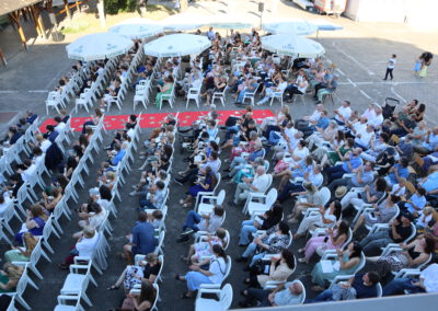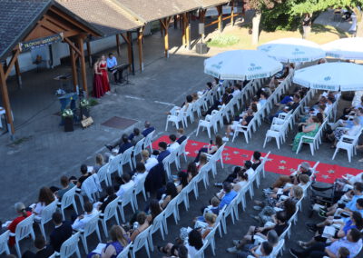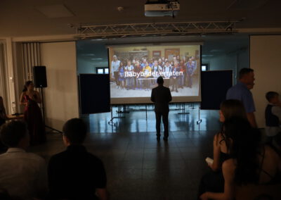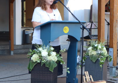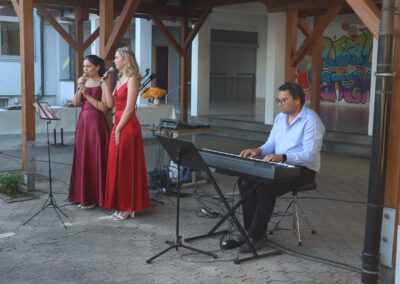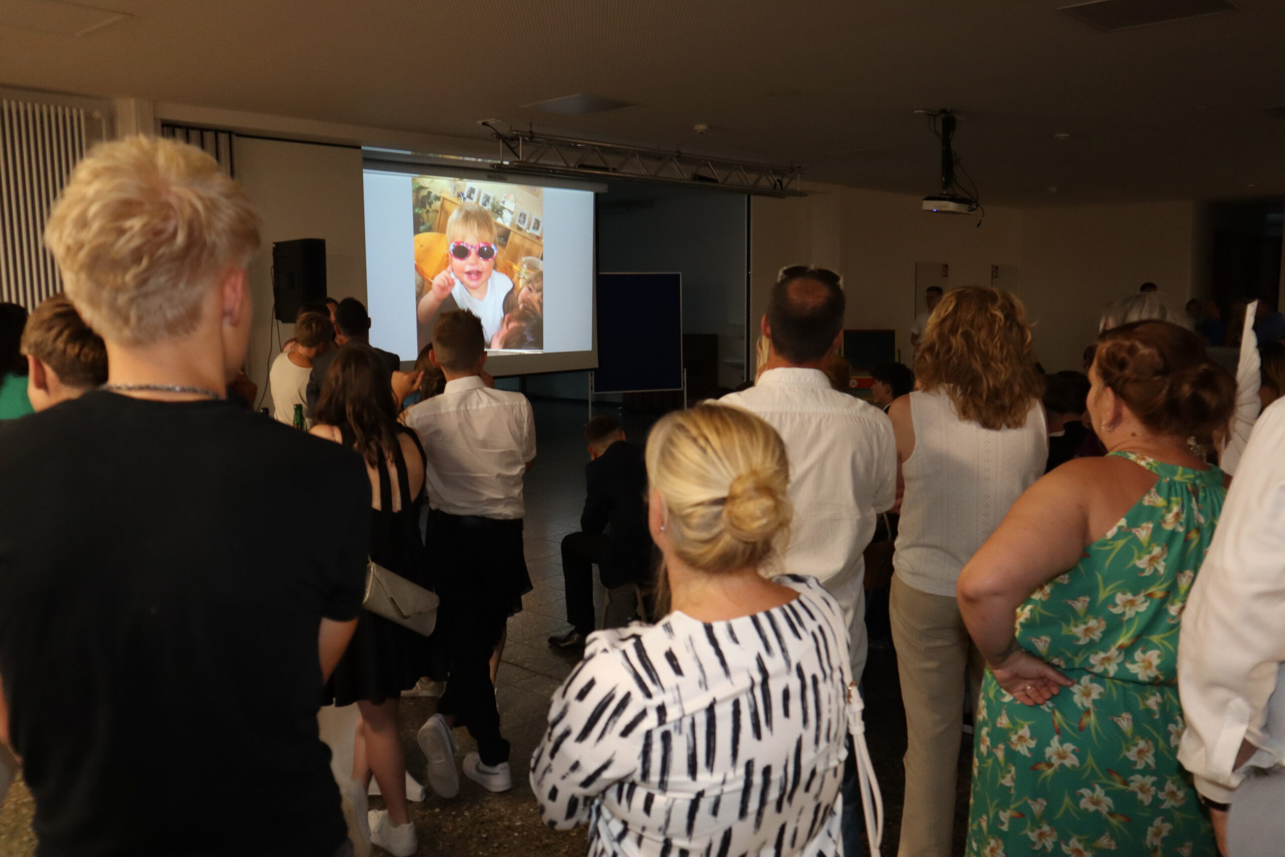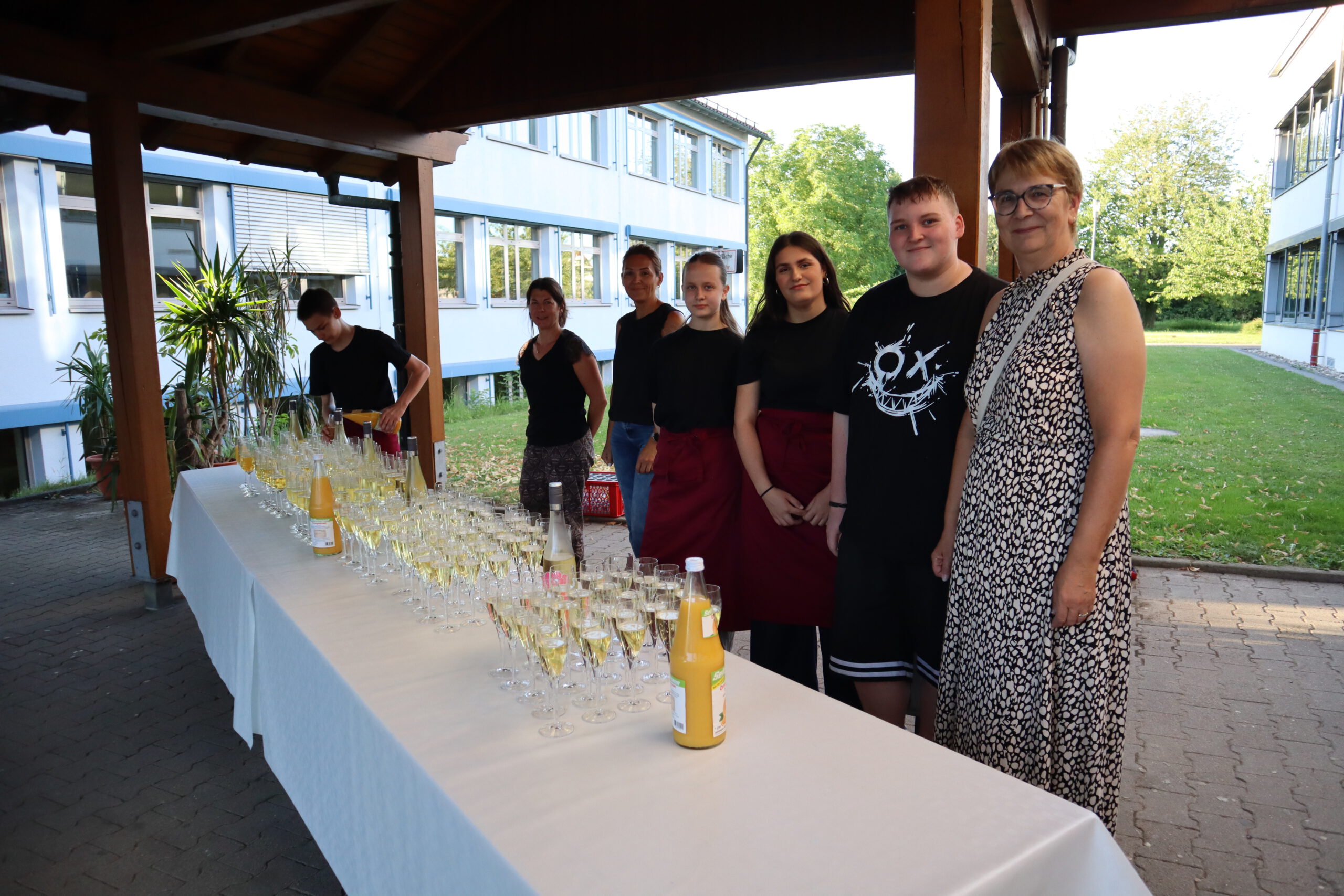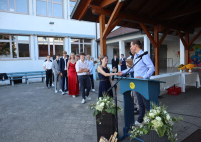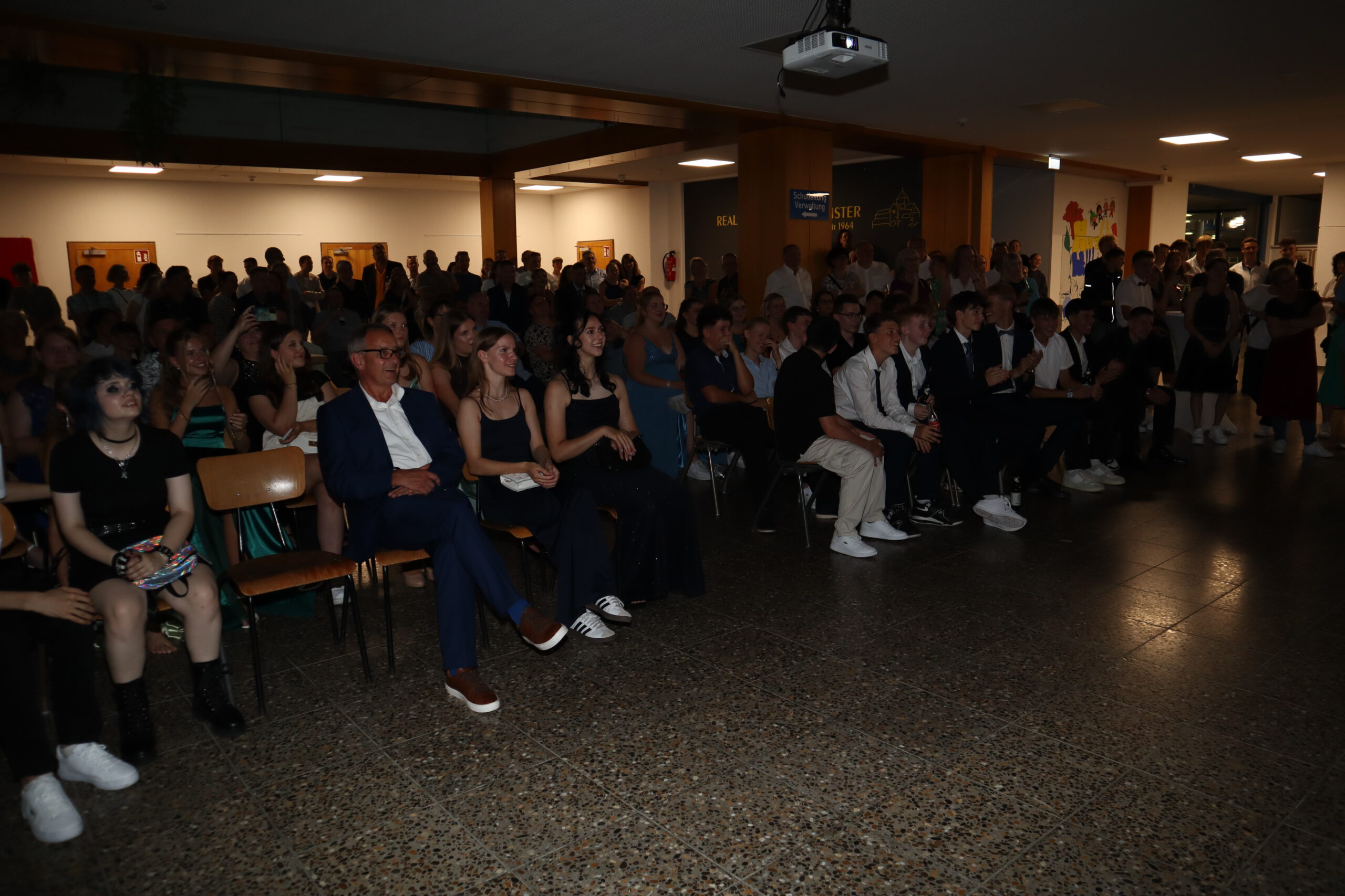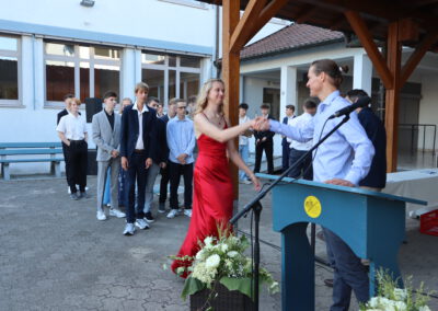 Zum Abschluss der Feier im Schulhof ließ die Elternbeiratsvorsitzende, Sandra Kautz, die Schulzeit an der Realschule noch einmal Revue passieren. In den sechs Jahren sei man miteinander durch Höhen und Tiefen gegangen, habe Freundschaften geschlossen, tolle Dinge erlebt, sei aber auch mit Leistungsanforderungen, Streit und Stress konfrontiert gewesen. Vor allem aber sei die Zeit durch die Entwicklung der jungen Menschen von Kindern zu nun fast Erwachsenen geprägt gewesen. Alle hätten heute das „Kapitel Realschule“ im Buch ihres Lebens zu Ende geschrieben. Für die weitere Lebensgeschichte rief Kautz die Absolventen dazu auf, sich durch Rückschritte und Fehltritte nicht entmutigen zu lassen, denn „jeder Schritt ist Teil eurer ganz eigenen Geschichte.“ Musikalisch passend umrahmt wurde die Feier durch den Gesang von Leonie Krauß und Laura Ruschmann. Nach den Schlussworten von Rektor Rolf Schemel folgte der letzte Teil der dreiteiligen Feierlichkeiten: In der Aula hatten die ehemaligen Zehntklässler Spiele und Rätsel für ihre Lehrer vorbereitet: Das Zuordnen von Baby-Fotos, Zitaten aus dem Unterricht und von Klassenbucheinträgen sorgte für so manchen Lacher und gelöste Stimmung.