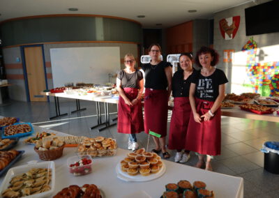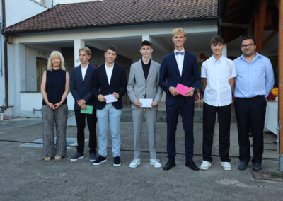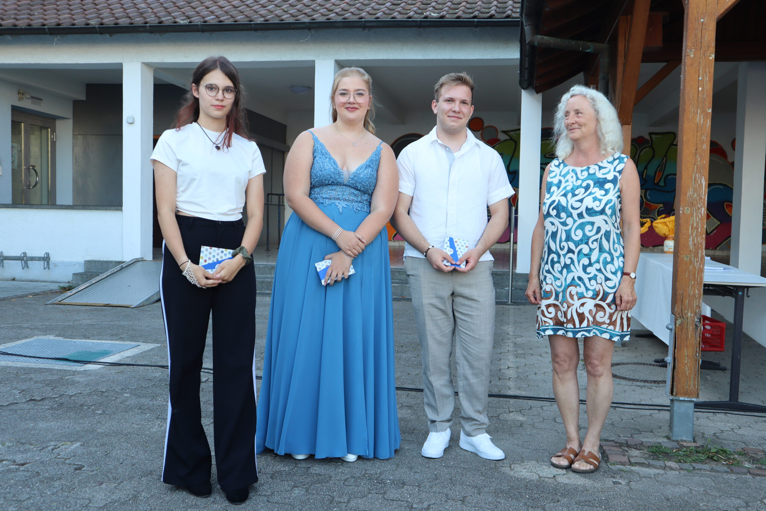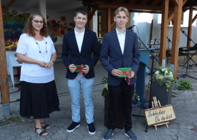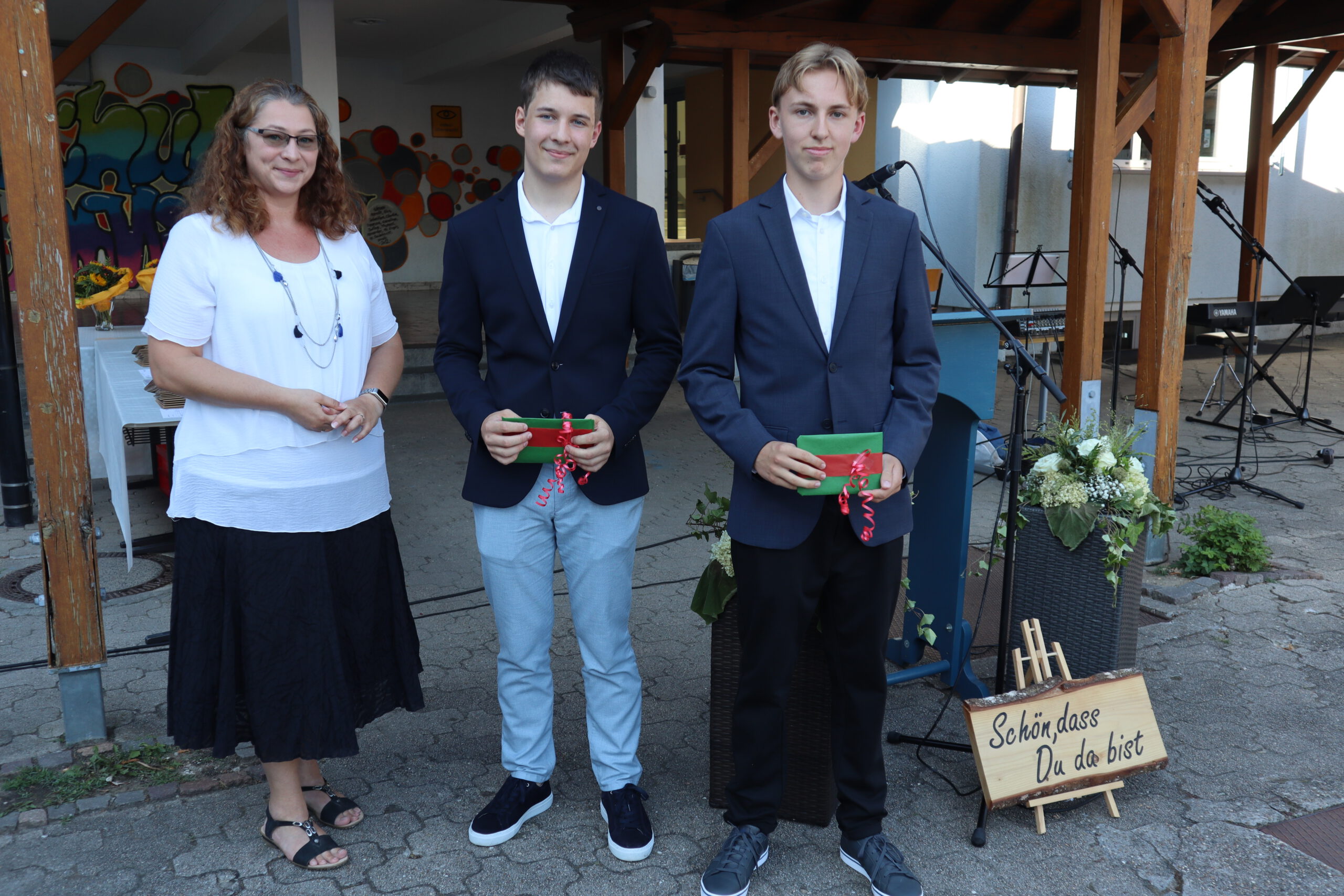 Anschließend zeichnete Antje Burkart, die Vorsitzende des Förderkreises, den scheidenden Schulsanitäter Frederic Koch sowie den Schülersprecher Manuel Unkrich mit dem Sozialpreis für besonderes soziales Engagement aus. Die Leiterin der Schulbibliothek, Monika Kohl-Wald, bedankte sich bei Liah Schuster, Leonie Blaß und Hannes Hörig für ihr Engagement im Bibliotheks-Team. Die beiden Verbindungslehrer Michaela Bohn-Vogel und Thomas Wertal wandten sich schließlich an die scheidenden Klassensprecher der beiden 10. Klassen. Sie dankten Leon Koch, Liam Wolff (beide 10a) sowie Kay Schaufler und Frederik Koch (beide 10b) für ihren Einsatz als Schüler Mit Verantwortung (in der SMV). Sie hätten sich vorbildlich für ihre Mitschüler eingesetzt, ihre Freizeit für Pausenaufsichten geopfert und nicht zuletzt mit der Organisation der Faschingsveranstaltung am Schmutzigen Donnerstag bei ihren Mitschülern für ganz besondere, unvergessliche Momente gesorgt.