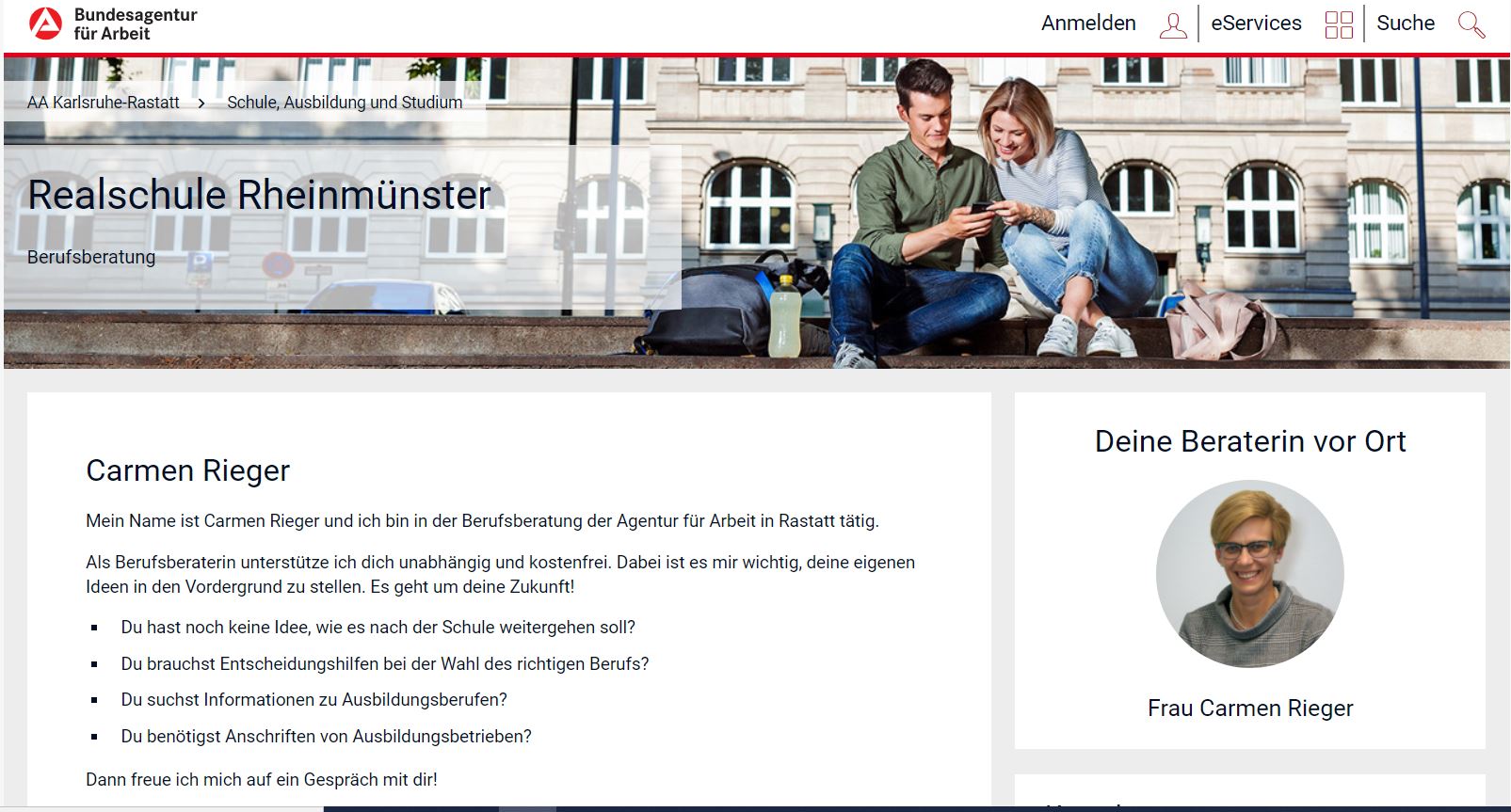 Berufsberatung an der Realschule Rheinmünster Für die Berufsberatung an unserer Schule ist Frau Carmen Rieger zuständig. Organisation Schulleitung Kollegium Schulsozialarbeit Elternbeirat Mitarbeiter SMV Förderkreis Beratungslehrerin Organigramm Partner Berufsberaterin