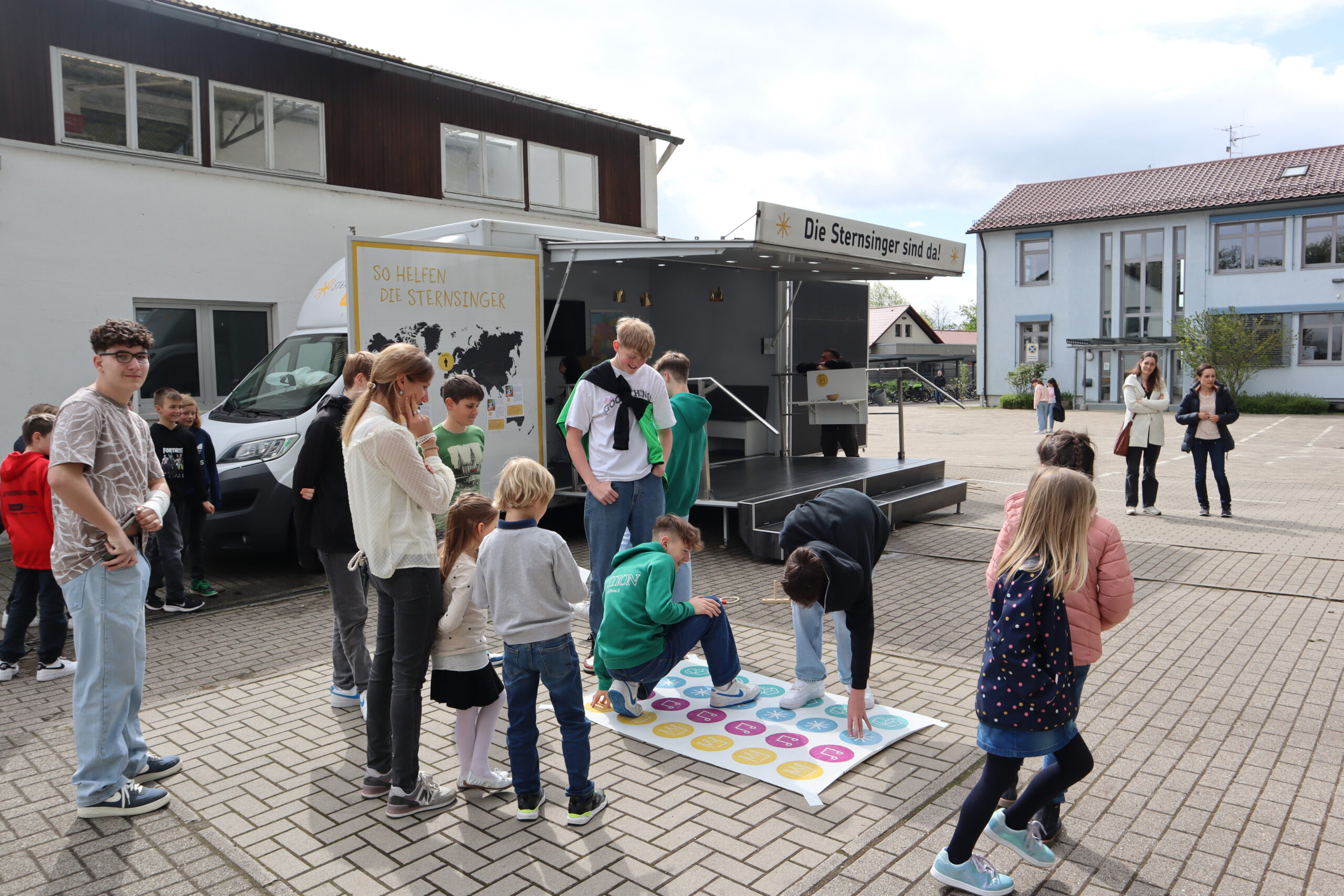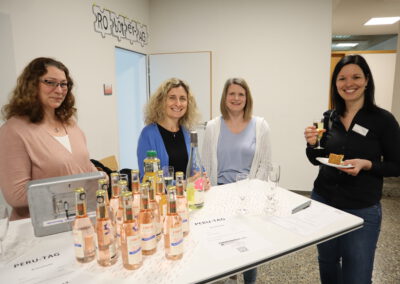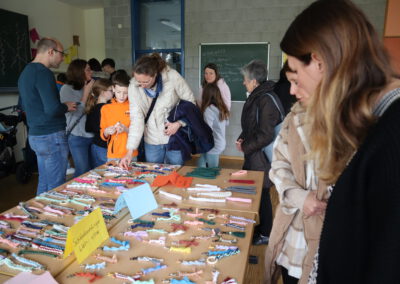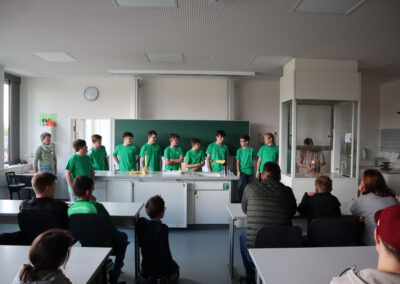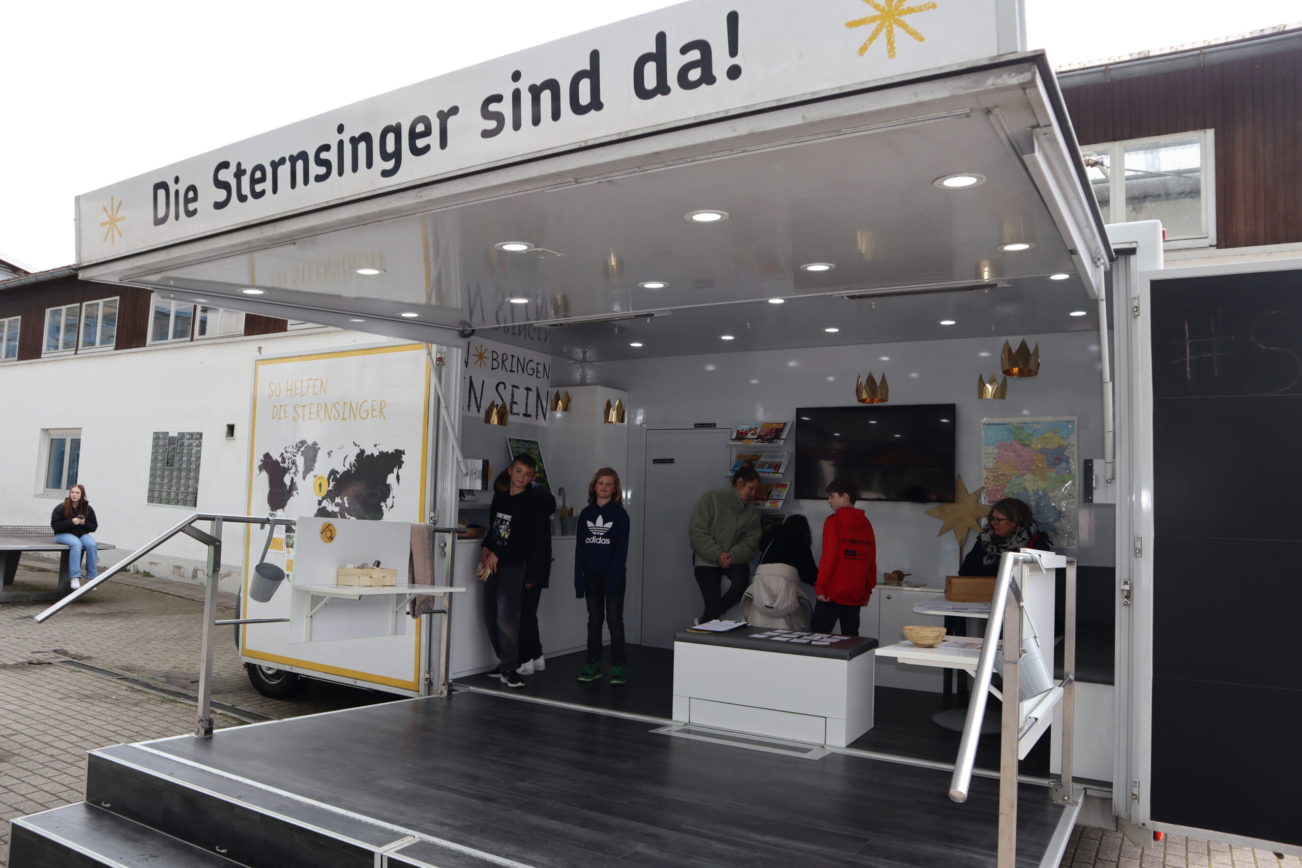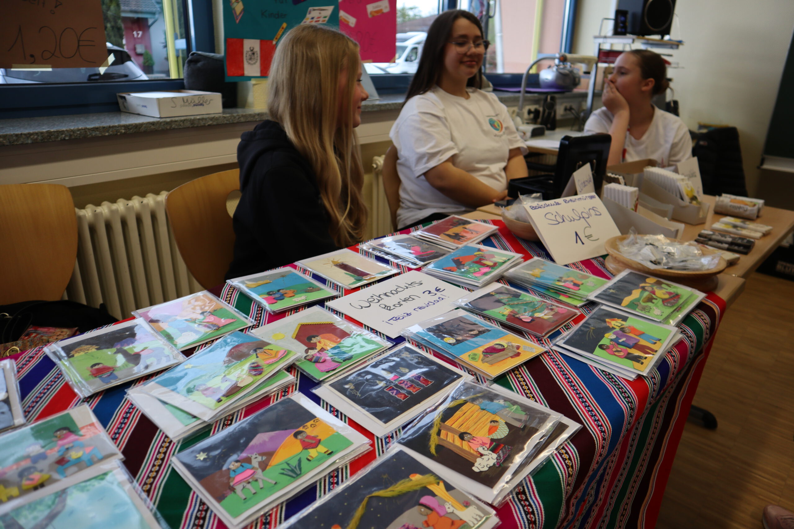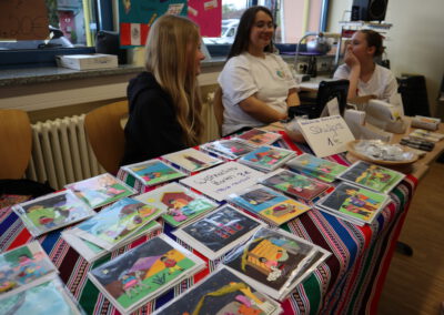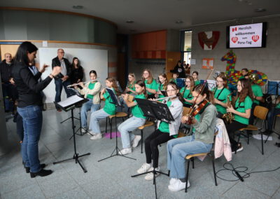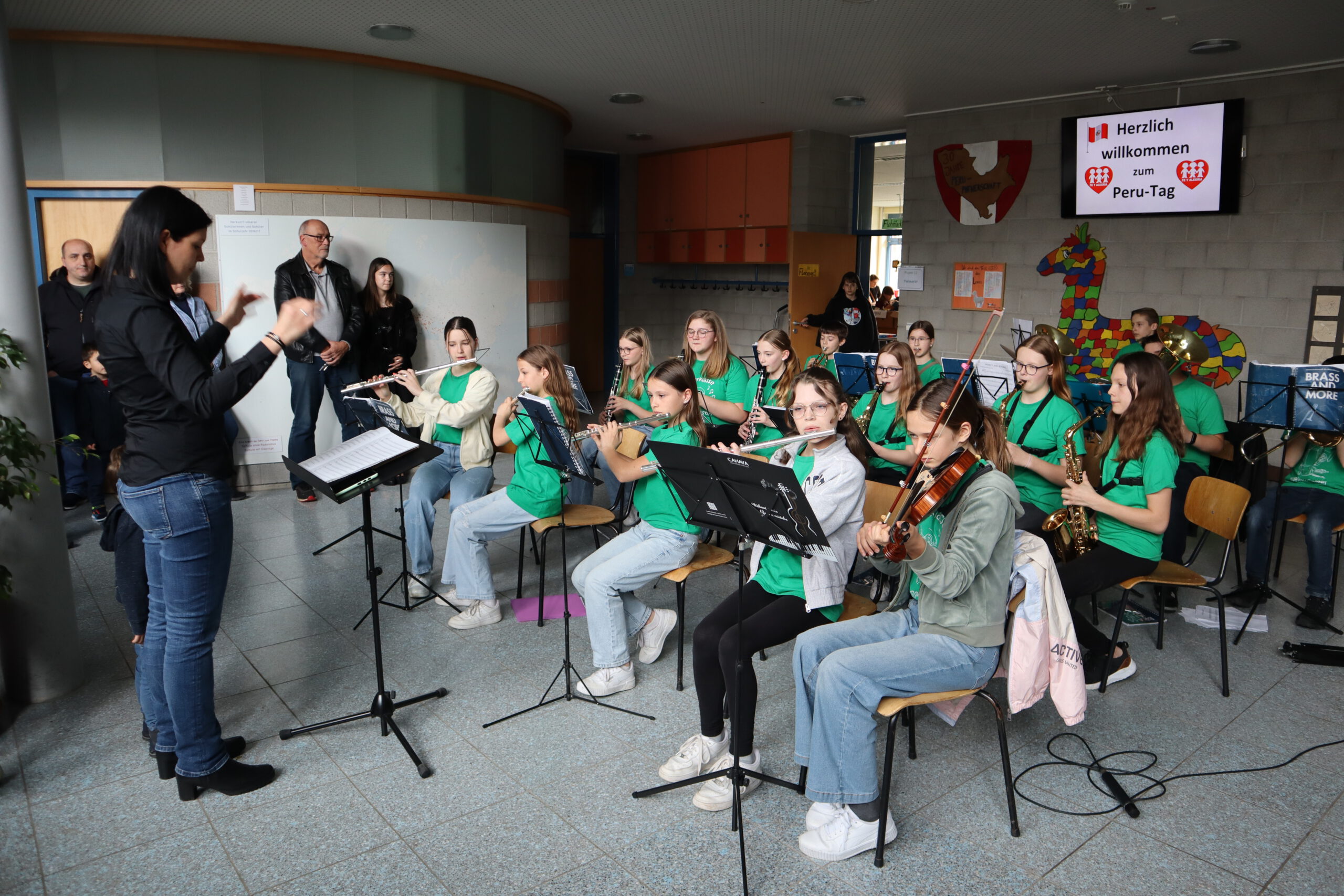 Im ganzen Schulhaus konnte man die Ergebnisse der von Mittwoch bis Freitag vorausgegangenen Projekttage betrachten, begreifen, käuflich erwerben oder auch gleich verzehren: Neben dem riesigen Kuchenbuffet des Elternbeirates in der Aula gab es Canapés, Französisches Sirop à l’eau oder auch Waffeln der SMV. Im Chemiesaal hatte eine Projektgruppe eine Vorführung chemischer Experimente vorbereitet, die vom Siebtklässler Erik Rohrer witzig und selbstbewusst moderiert wurde. So sorgte die Herstellung von schäumender „Elefanten-Zahnpasta“ gleichermaßen für erstauntes Raunen in den voll besetzten Bänken wie das Verwandeln klarer Flüssigkeiten in „Bier“ und in verschiedene „Weinsorten“. Auch das Verwandeln einer Kupfermünze in einen Goldtaler war für die jungen Chemiker kein Problem. Die Bläserklassen 5b und 6b gaben im B-Bau zusammen mit ihrer Lehrerin Cindy Huck einen Einblick in ihr Können und im Technikraum konnte man aus Konservendosen gefertigte Windlichter oder Utensilos erwerben. Viele der Projekte an den Projekttagen hatten sich mit dem Land Peru beschäftigt und auch für die Besucher wurde eine digitale Reise durch Peru mit ipads angeboten. Hier erfuhr man beispielsweise Wissenswertes über die historische Inka-Stadt Machu Picchu oder über die peruanische Küche. In einem Kunst-Projekt hatten sich die Schüler malerisch mit ihrer eigene Heimat und dem Land Peru auseinandergesetzt und farbenfrohe Gemälde mit Acrylfarben erstellt, andere präsentierten ihre Erkenntnisse aus einem dreitätigen Spanisch-Kurs mit einer Muttersprachlerin. Die jüngsten Besucher konnten sich im BK-Saal schminken lassen oder über den Flohmarkt und Bücherflohmarkt stöbern. Ehrengäste waren in diesem Jahr Sarah Streif, die ehemalige Volontärin an der peruanischen Partnerschule, sowie Simone Valenzuela, die an der Erzdiözese Freiburg verantwortlich für Peru-Partnerschaften ist. Von ihnen konnte man aus erster Hand Informationen zur Partnerschule bekommen. Eine besondere Attraktion auf dem Schulhof war außerdem das Sternsingermobil des Kindermissionswerks, das Susanne Müller, die Koordinatorin der Schulpartnerschaft, bereits vor Monaten eingeladen hatte.