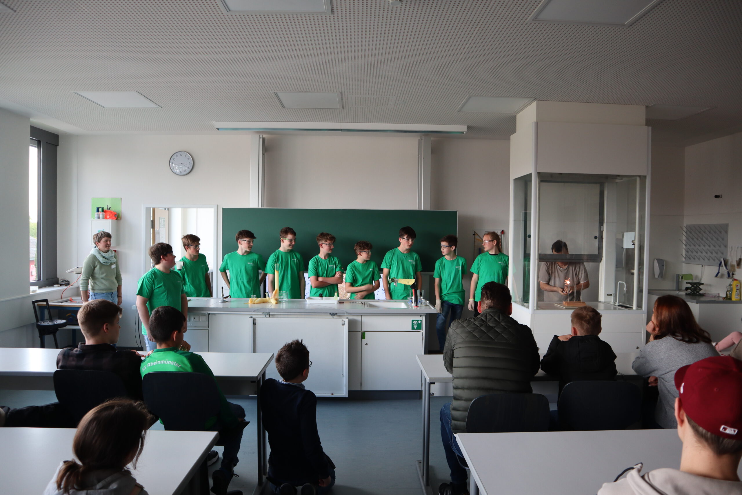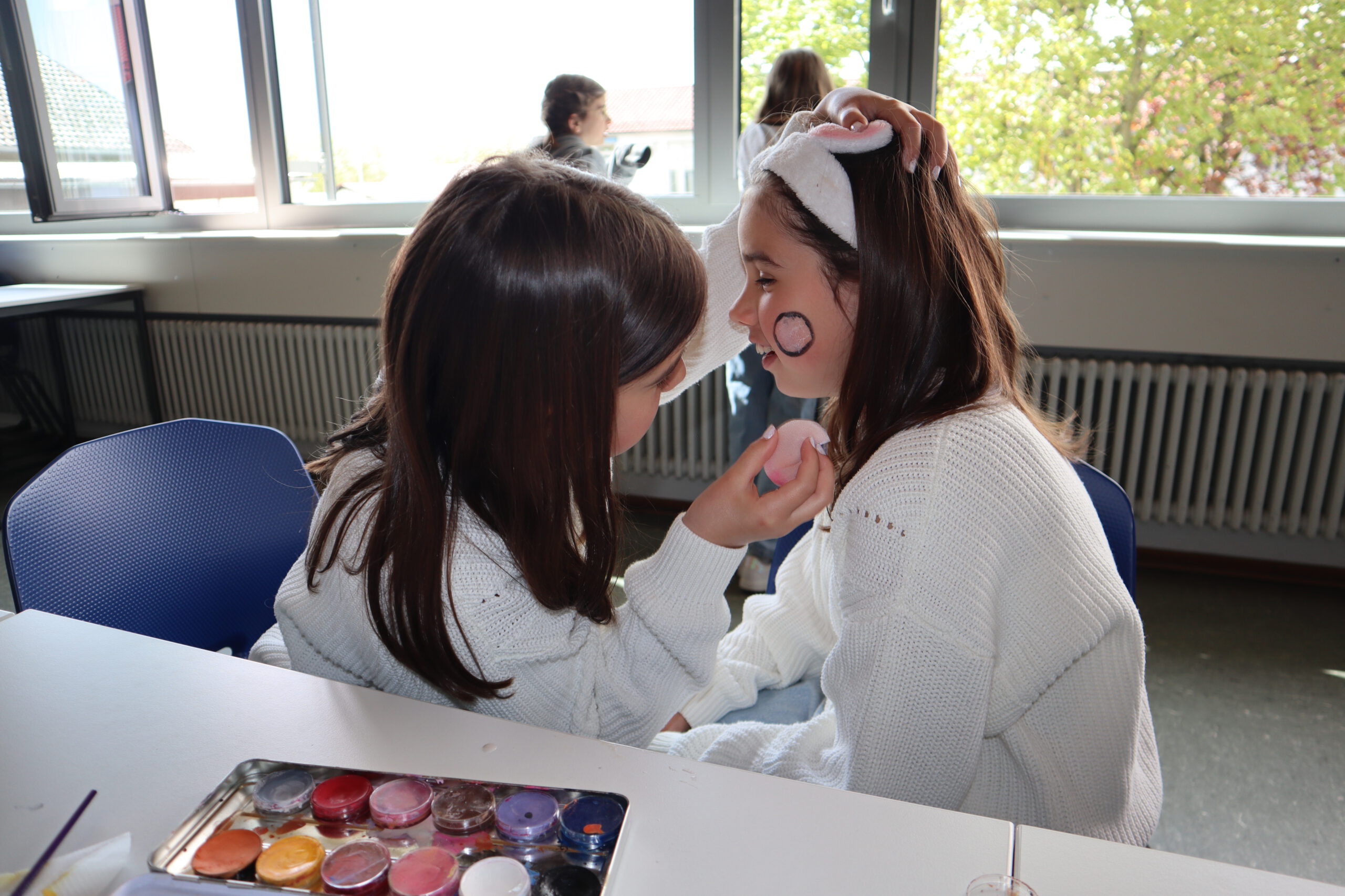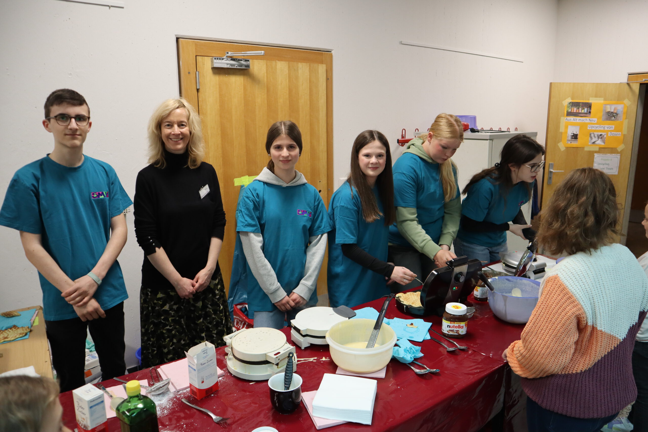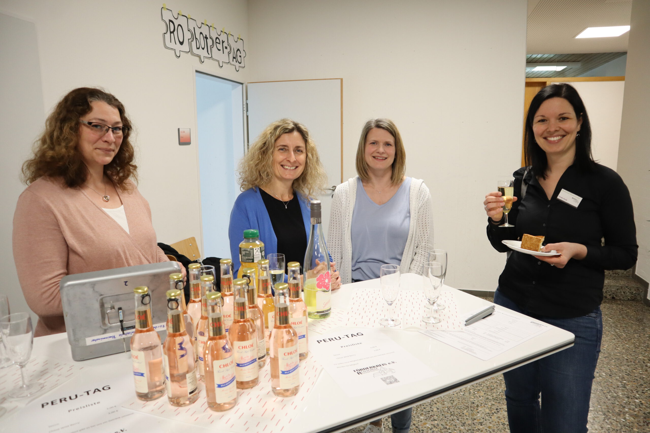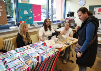 Im ganzen Schulhaus konnte man die Ergebnisse der von Mittwoch bis Freitag vorausgegangenen Projekttage betrachten, begreifen, käuflich erwerben oder auch gleich verzehren: Neben dem riesigen Kuchenbuffet des Elternbeirates in der Aula gab es Canapés, Französisches Sirop à l’eau oder auch Waffeln der SMV. Im Chemiesaal hatte eine Projektgruppe eine Vorführung chemischer Experimente vorbereitet, die vom Siebtklässler Erik Rohrer witzig und selbstbewusst moderiert wurde. So sorgte die Herstellung von schäumender „Elefanten-Zahnpasta“ gleichermaßen für erstauntes Raunen in den voll besetzten Bänken wie das Verwandeln klarer Flüssigkeiten in „Bier“ und in verschiedene „Weinsorten“. Auch das Verwandeln einer Kupfermünze in einen Goldtaler war für die jungen Chemiker kein Problem. Die Bläserklassen 5b und 6b gaben im B-Bau zusammen mit ihrer Lehrerin Cindy Huck einen Einblick in ihr Können und im Technikraum konnte man aus Konservendosen gefertigte Windlichter oder Utensilos erwerben. Viele der Projekte an den Projekttagen hatten sich mit dem Land Peru beschäftigt und auch für die Besucher wurde eine digitale Reise durch Peru mit ipads angeboten. Hier erfuhr man beispielsweise Wissenswertes über die historische Inka-Stadt Machu Picchu oder über die peruanische Küche. In einem Kunst-Projekt hatten sich die Schüler malerisch mit ihrer eigene Heimat und dem Land Peru auseinandergesetzt und farbenfrohe Gemälde mit Acrylfarben erstellt, andere präsentierten ihre Erkenntnisse aus einem dreitätigen Spanisch-Kurs mit einer Muttersprachlerin. Die jüngsten Besucher konnten sich im BK-Saal schminken lassen oder über den Flohmarkt und Bücherflohmarkt stöbern. Ehrengäste waren in diesem Jahr Sarah Streif, die ehemalige Volontärin an der peruanischen Partnerschule, sowie Simone Valenzuela, die an der Erzdiözese Freiburg verantwortlich für Peru-Partnerschaften ist. Von ihnen konnte man aus erster Hand Informationen zur Partnerschule bekommen. Eine besondere Attraktion auf dem Schulhof war außerdem das Sternsingermobil des Kindermissionswerks, das Susanne Müller, die Koordinatorin der Schulpartnerschaft, bereits vor Monaten eingeladen hatte.