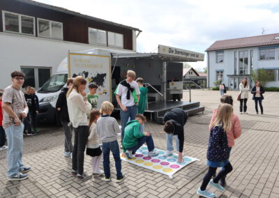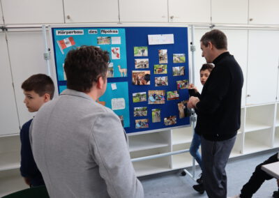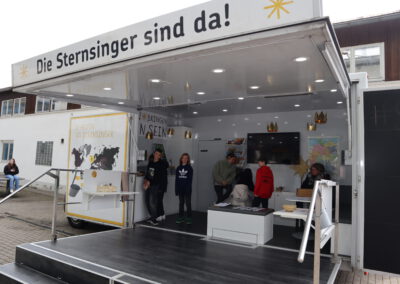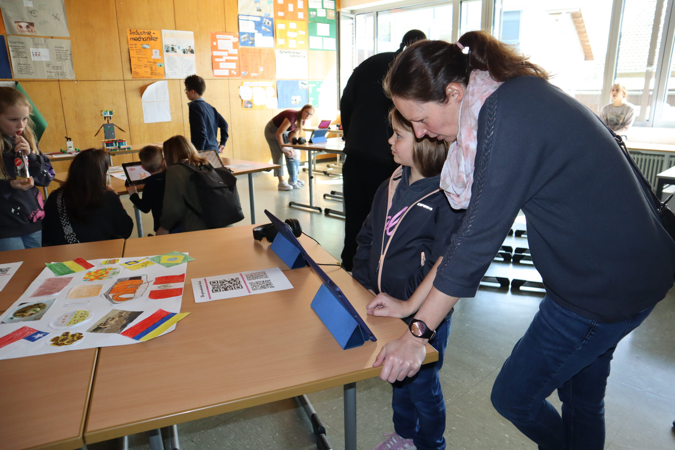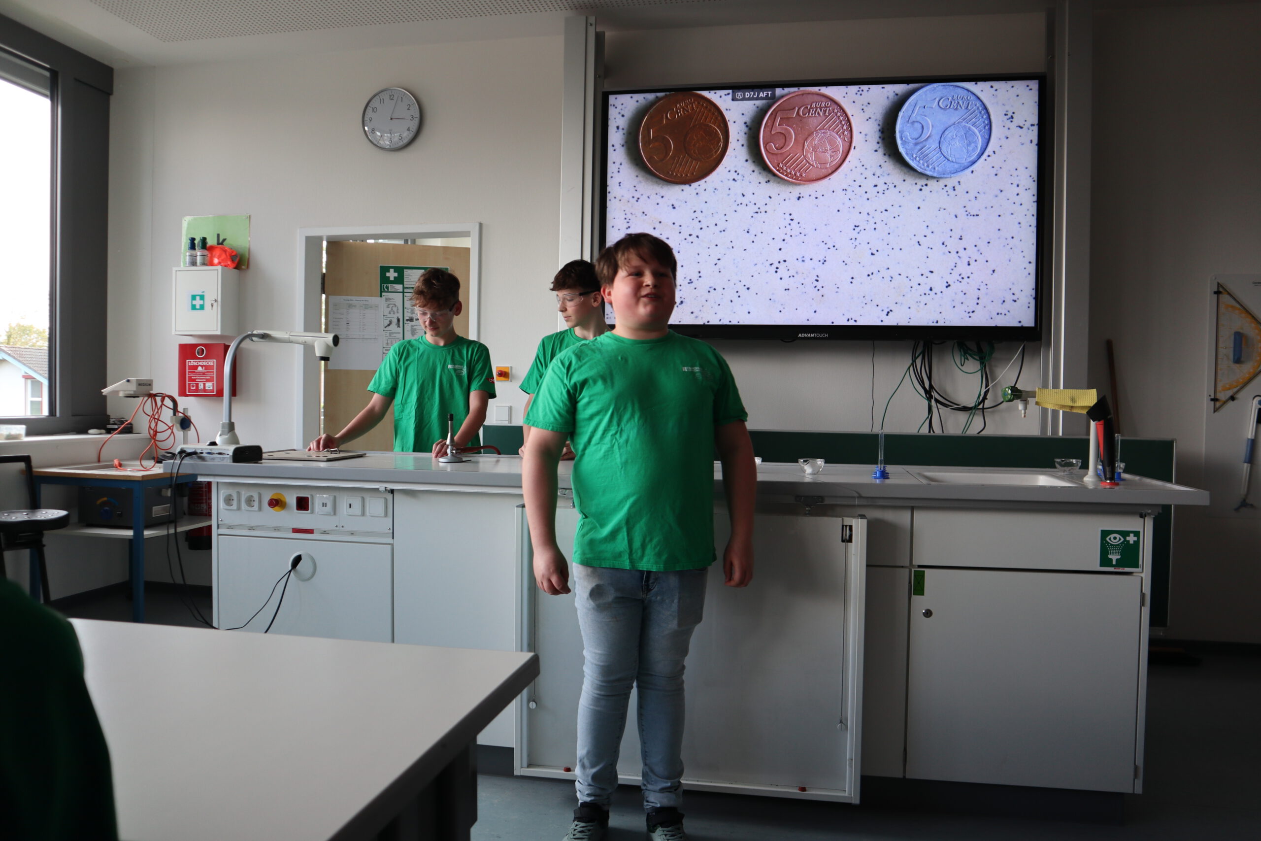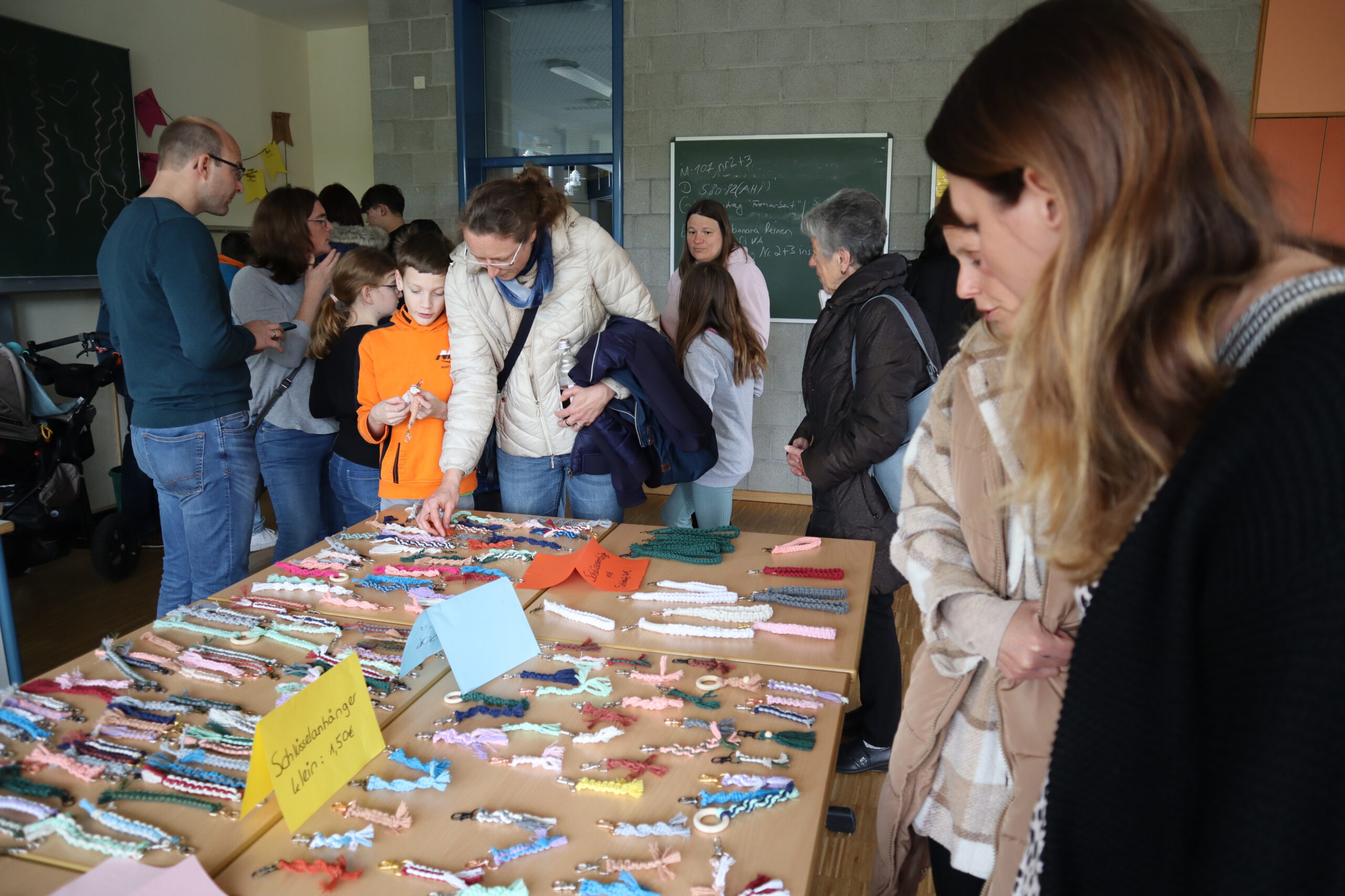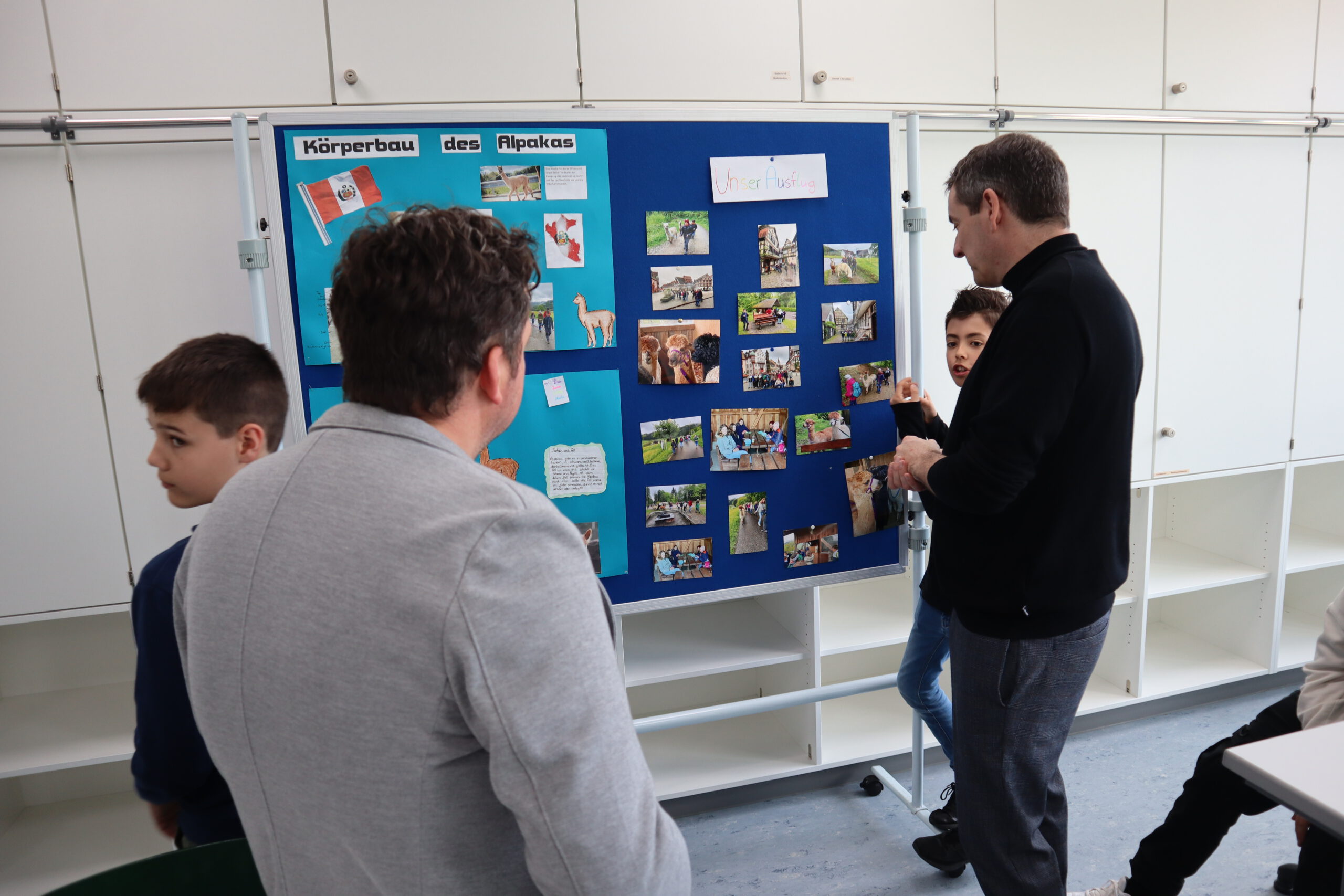 Im ganzen Schulhaus konnte man die Ergebnisse der von Mittwoch bis Freitag vorausgegangenen Projekttage betrachten, begreifen, käuflich erwerben oder auch gleich verzehren: Neben dem riesigen Kuchenbuffet des Elternbeirates in der Aula gab es Canapés, Französisches Sirop à l’eau oder auch Waffeln der SMV. Im Chemiesaal hatte eine Projektgruppe eine Vorführung chemischer Experimente vorbereitet, die vom Siebtklässler Erik Rohrer witzig und selbstbewusst moderiert wurde. So sorgte die Herstellung von schäumender „Elefanten-Zahnpasta“ gleichermaßen für erstauntes Raunen in den voll besetzten Bänken wie das Verwandeln klarer Flüssigkeiten in „Bier“ und in verschiedene „Weinsorten“. Auch das Verwandeln einer Kupfermünze in einen Goldtaler war für die jungen Chemiker kein Problem. Die Bläserklassen 5b und 6b gaben im B-Bau zusammen mit ihrer Lehrerin Cindy Huck einen Einblick in ihr Können und im Technikraum konnte man aus Konservendosen gefertigte Windlichter oder Utensilos erwerben. Viele der Projekte an den Projekttagen hatten sich mit dem Land Peru beschäftigt und auch für die Besucher wurde eine digitale Reise durch Peru mit ipads angeboten. Hier erfuhr man beispielsweise Wissenswertes über die historische Inka-Stadt Machu Picchu oder über die peruanische Küche. In einem Kunst-Projekt hatten sich die Schüler malerisch mit ihrer eigene Heimat und dem Land Peru auseinandergesetzt und farbenfrohe Gemälde mit Acrylfarben erstellt, andere präsentierten ihre Erkenntnisse aus einem dreitätigen Spanisch-Kurs mit einer Muttersprachlerin. Die jüngsten Besucher konnten sich im BK-Saal schminken lassen oder über den Flohmarkt und Bücherflohmarkt stöbern. Ehrengäste waren in diesem Jahr Sarah Streif, die ehemalige Volontärin an der peruanischen Partnerschule, sowie Simone Valenzuela, die an der Erzdiözese Freiburg verantwortlich für Peru-Partnerschaften ist. Von ihnen konnte man aus erster Hand Informationen zur Partnerschule bekommen. Eine besondere Attraktion auf dem Schulhof war außerdem das Sternsingermobil des Kindermissionswerks, das Susanne Müller, die Koordinatorin der Schulpartnerschaft, bereits vor Monaten eingeladen hatte.