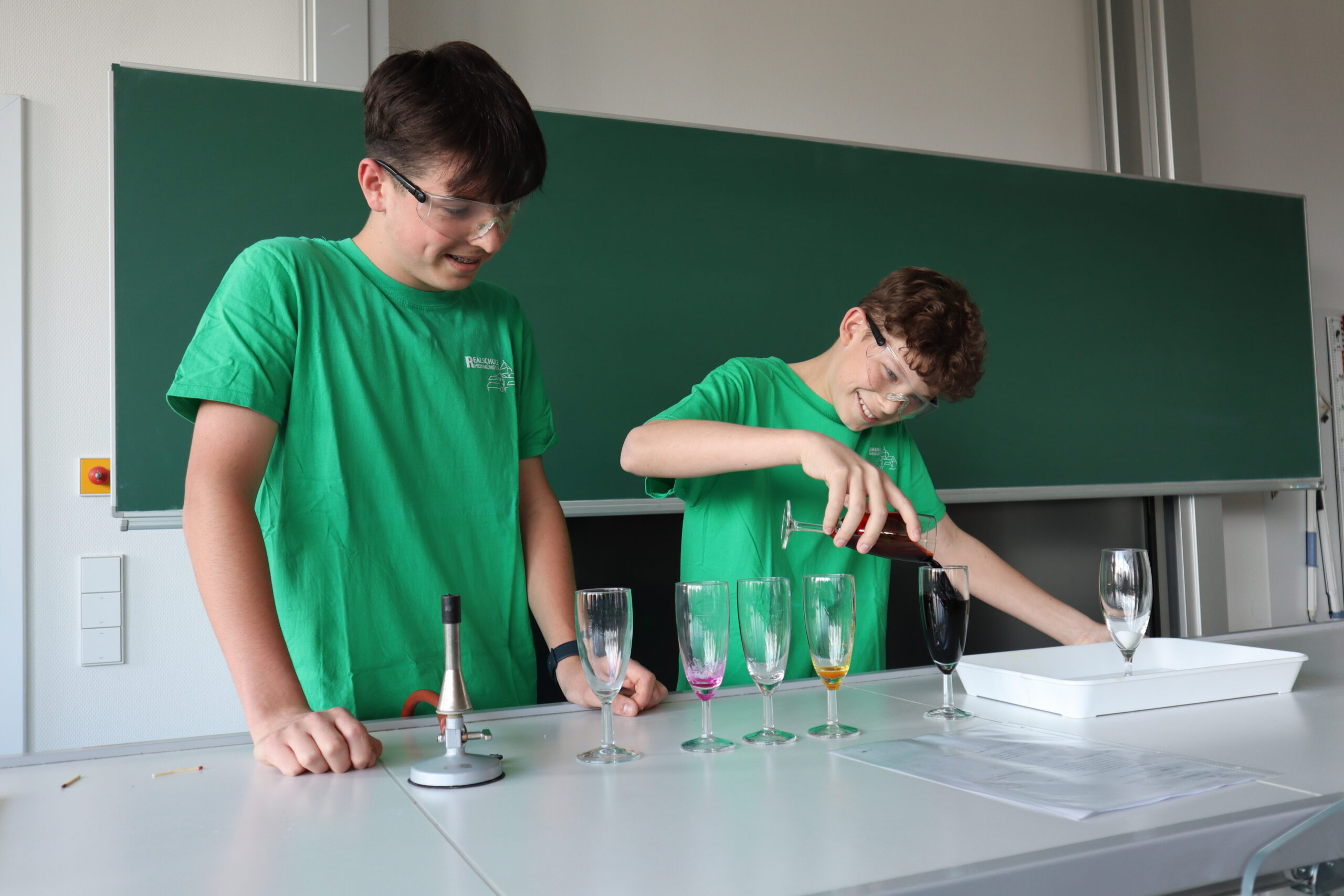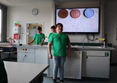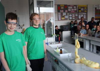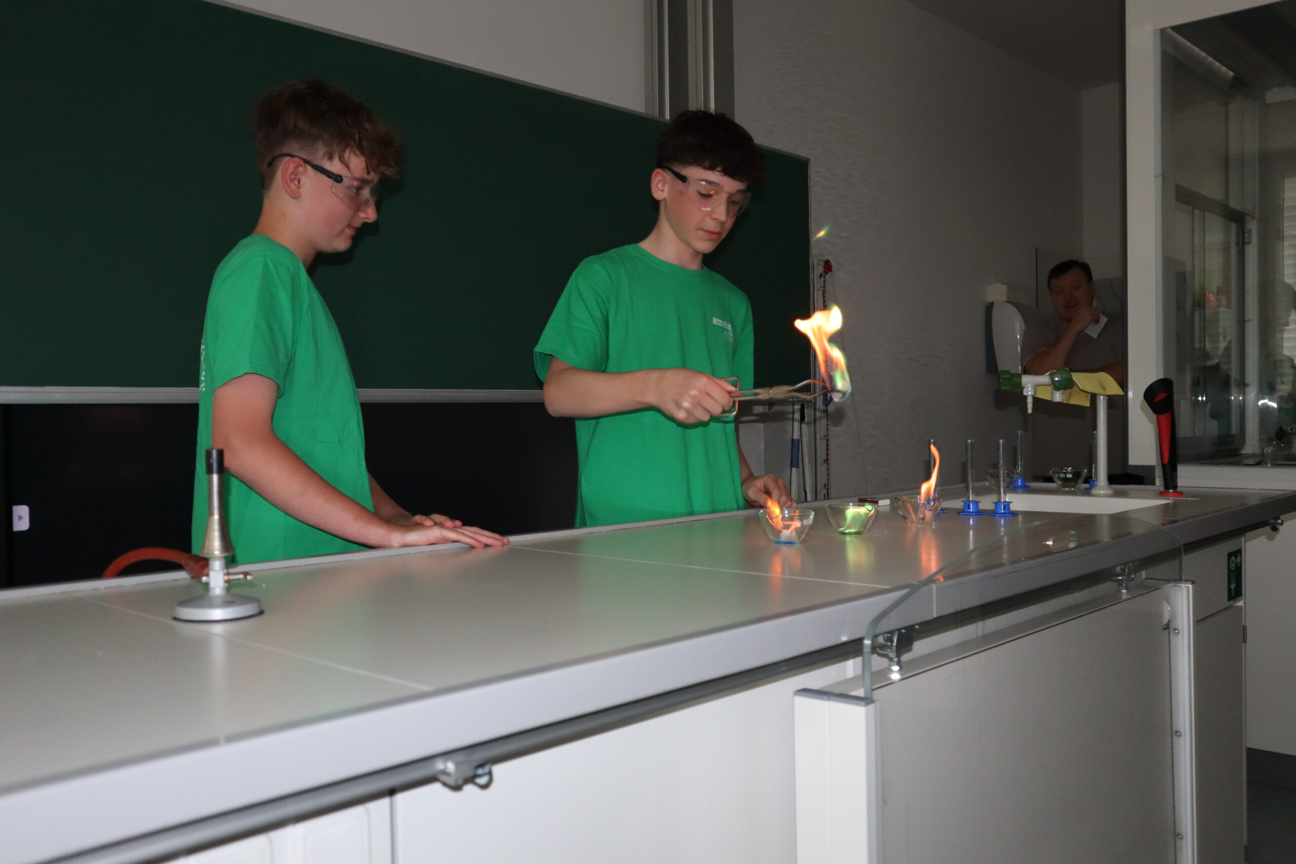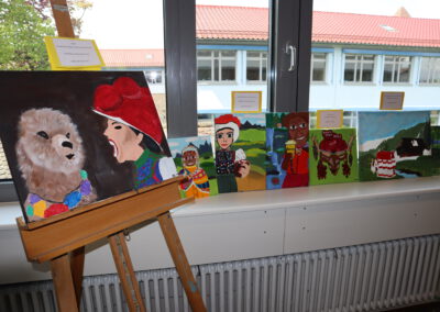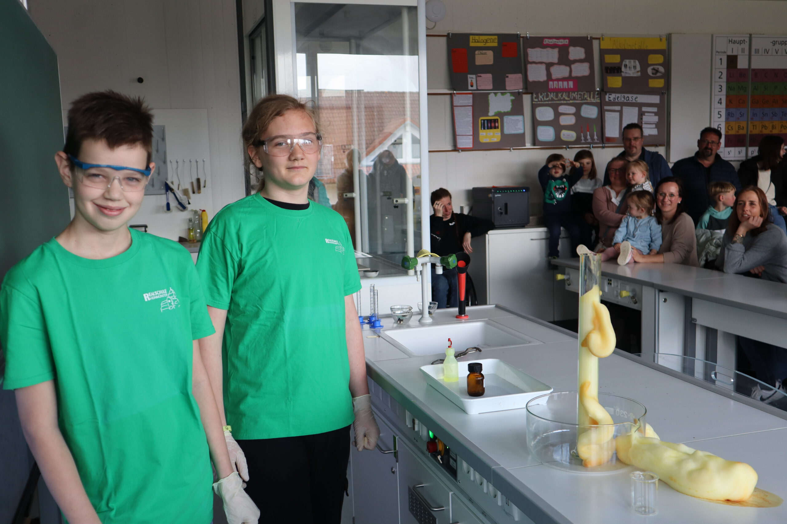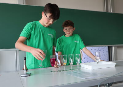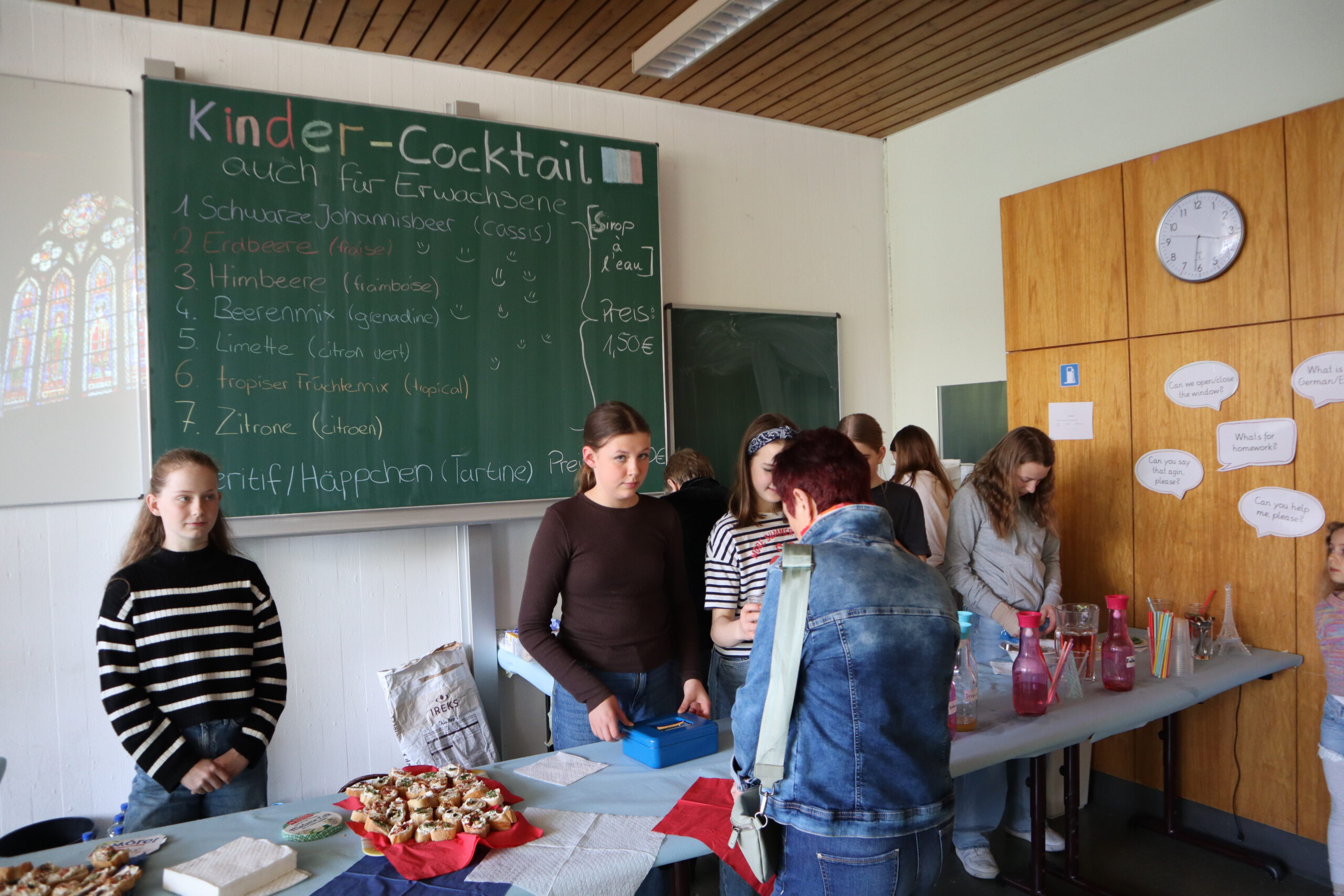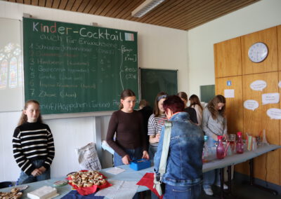Im ganzen Schulhaus konnte man die Ergebnisse der von Mittwoch bis Freitag vorausgegangenen Projekttage betrachten, begreifen, käuflich erwerben oder auch gleich verzehren: Neben dem riesigen Kuchenbuffet des Elternbeirates in der Aula gab es Canapés, Französisches Sirop à l’eau oder auch Waffeln der SMV. Im Chemiesaal hatte eine Projektgruppe eine Vorführung chemischer Experimente vorbereitet, die vom Siebtklässler Erik Rohrer witzig und selbstbewusst moderiert wurde. So sorgte die Herstellung von schäumender „Elefanten-Zahnpasta“ gleichermaßen für erstauntes Raunen in den voll besetzten Bänken wie das Verwandeln klarer Flüssigkeiten in „Bier“ und in verschiedene „Weinsorten“. Auch das Verwandeln einer Kupfermünze in einen Goldtaler war für die jungen Chemiker kein Problem. Die Bläserklassen 5b und 6b gaben im B-Bau zusammen mit ihrer Lehrerin Cindy Huck einen Einblick in ihr Können und im Technikraum konnte man aus Konservendosen gefertigte Windlichter oder Utensilos erwerben. Viele der Projekte an den Projekttagen hatten sich mit dem Land Peru beschäftigt und auch für die Besucher wurde eine digitale Reise durch Peru mit ipads angeboten. Hier erfuhr man beispielsweise Wissenswertes über die historische Inka-Stadt Machu Picchu oder über die peruanische Küche. In einem Kunst-Projekt hatten sich die Schüler malerisch mit ihrer eigene Heimat und dem Land Peru auseinandergesetzt und farbenfrohe Gemälde mit Acrylfarben erstellt, andere präsentierten ihre Erkenntnisse aus einem dreitätigen Spanisch-Kurs mit einer Muttersprachlerin. Die jüngsten Besucher konnten sich im BK-Saal schminken lassen oder über den Flohmarkt und Bücherflohmarkt stöbern. Ehrengäste waren in diesem Jahr Sarah Streif, die ehemalige Volontärin an der peruanischen Partnerschule, sowie Simone Valenzuela, die an der Erzdiözese Freiburg verantwortlich für Peru-Partnerschaften ist. Von ihnen konnte man aus erster Hand Informationen zur Partnerschule bekommen. Eine besondere Attraktion auf dem Schulhof war außerdem das Sternsingermobil des Kindermissionswerks, das Susanne Müller, die Koordinatorin der Schulpartnerschaft, bereits vor Monaten eingeladen hatte.