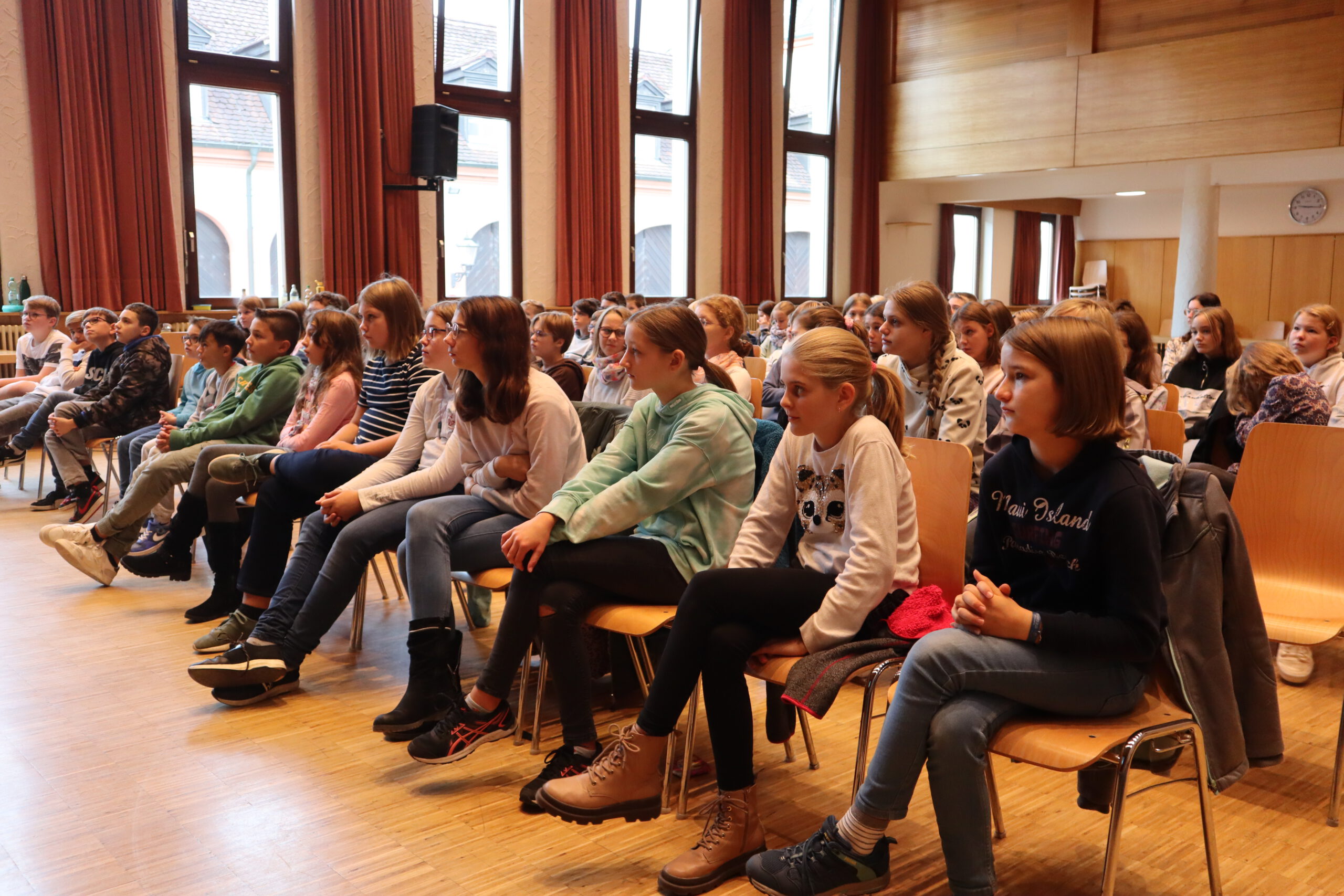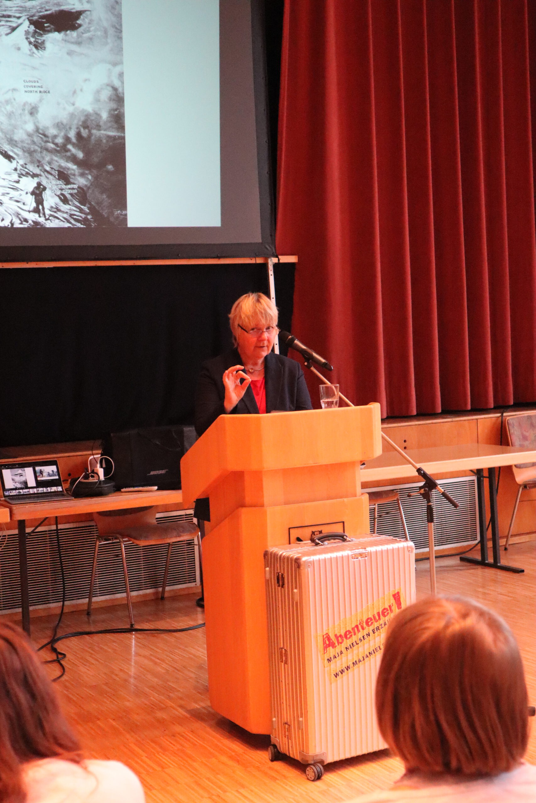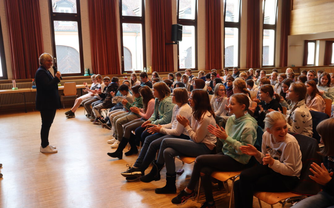 Die Lesung aus dem Buch „Mount Everest: Spurensuche in eisigen Höhen“ zeigte das Besondere an den Sachbuch-Geschichten von Maja Nielsen: Sie sind wahr, authentisch. Die Autorin spricht für alle Bände ihrer Abenteuer-Sachbuch-Reihe mit Zeitzeugen, Experten und Wissenschaftlern. So erfuhren die Sechtsklässler etwa, dass die Autorin für eines ihrer Bücher den Astronauten Alexander Gerst in einer Live-Schaltung während dessen Aufenthalts auf der ISS interviewt hat. Auch Reinhold Messner oder die Verhaltensforscherin Jane Goodall gehören zu den von Nielsen für ihre Bücher Befragten. Dass die ausgebildete Schauspielerin Maja Nielsen als Sachbuchautorin „den coolsten Job der Welt“ für sich gefunden hat und in diesem Beruf viele echte Abenteuer erlebt, glaubt man nach ihrem enthusiastischen Vortrag sofort. So verabschiedete sie sich v on ihren jungen Zuhörern mit den Worten des Bergsteigers George Mallory: „Auf ein Abenteuer zu verzichten, ist wie eine Erbse, die in der Schote vertrocknet“, und ermunterte die applaudierenden Schüler dazu, ihre Ziele im Leben hartnäckig zu verfolgen und ohne Angst in die Tat umzusetzen. Die Organisatorin Tanja Seidelmann bedankte sich in den tosenden Applaus der Schüler hinein für die spannende, faszinierende Lesung und überreichte Nielsen ein Präsent der Realschule. Ermöglicht wurde die Autorenlesung nicht zuletzt durch den Förderkreis der Realschule Rheinmünster, der die Hälfte der Kosten übernahm.