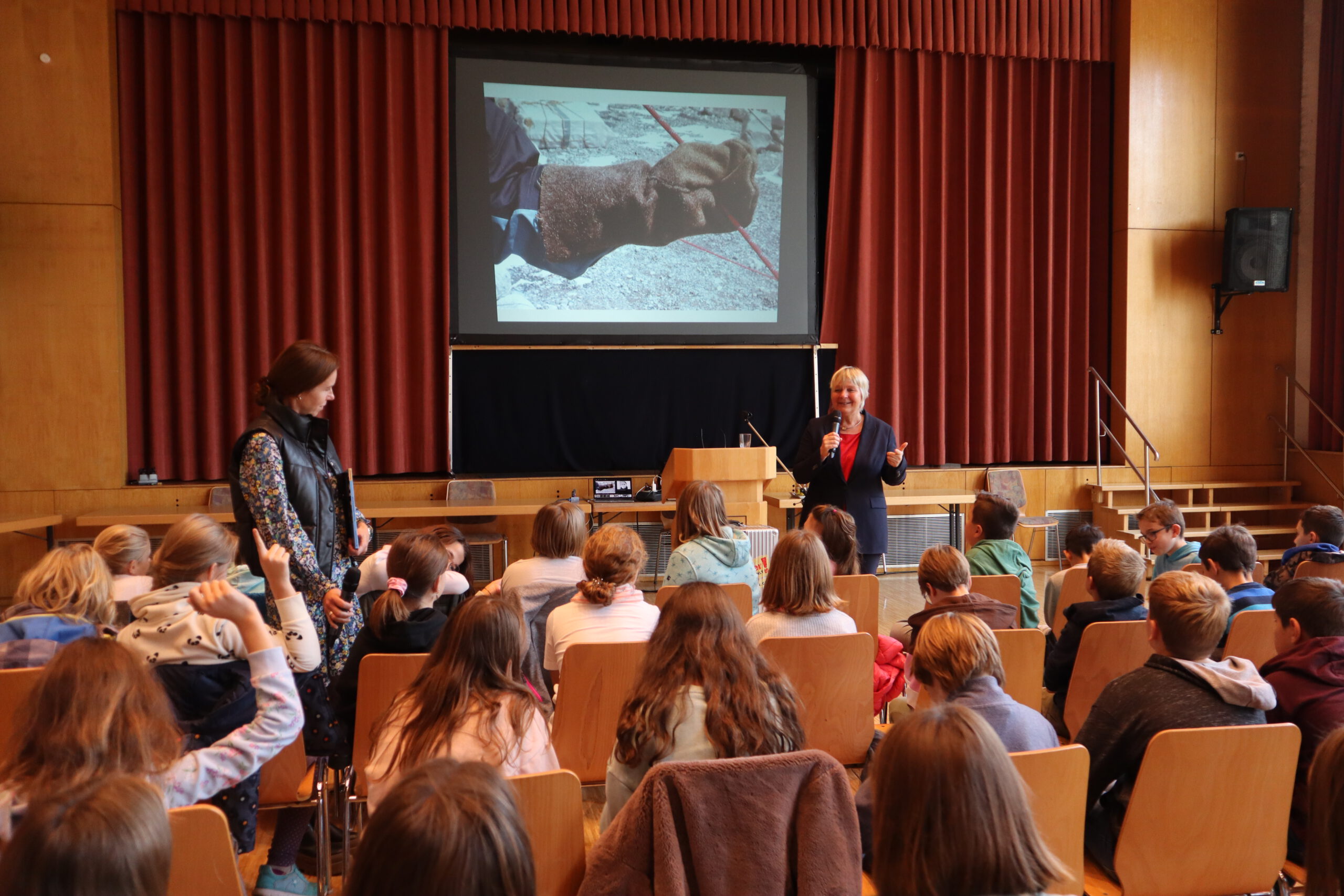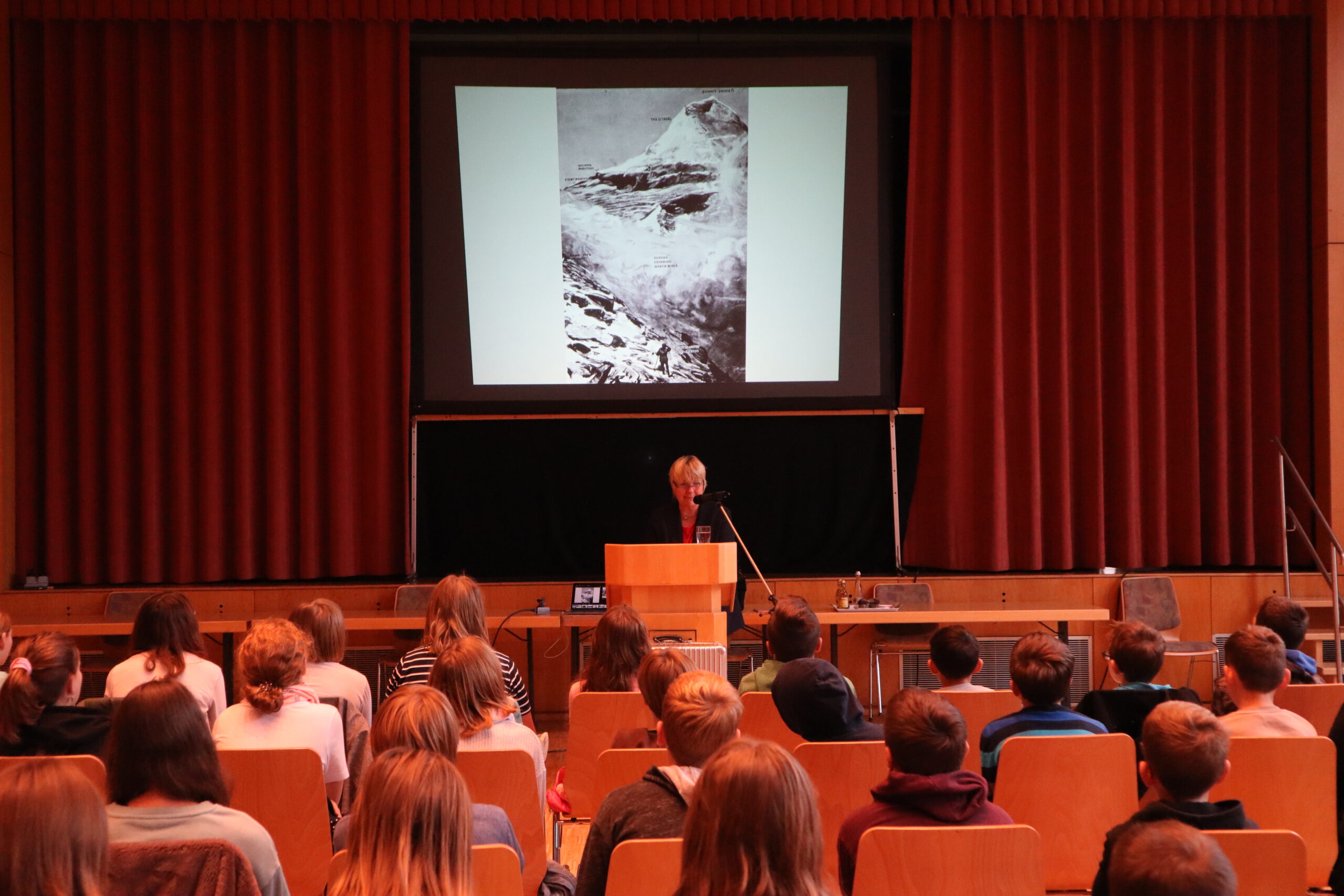 Dass weder das Schreiben noch das Lesen von Sachbüchern auch nur im Geringsten langweilig ist, erlebten die Schülerinnen und Schüler der drei sechsten Klassen der Schwarzacher Realschule hautnah am Freitagmorgen: Deutschlehrerin Tanja Seidelmann hatte die mehrfach preisgekrönte Sachbuchautorin Maja Nielsen in die Festhalle eingeladen, wo diese die anwesenden Schüler und Lehrer knapp zwei Stunden lang mit ihrer völlig freien, lebendigen und ausdrucksstarken Erzählweise in ihren Bann zog. „Das sechste Schuljahr steht ganz im Zeichen des Lesens“, führte Seidelmann aus, „neben dem Vorlesewettbewerb in dieser Jahrgangsstufe sind Autorenlesungen ein wichtiger Bestandteil unseres Lesecurriculums und mir persönlich eine Herzensangelegenheit. Wir möchten die Lust an Büchern und am Lesen wecken.“ Diesem Ziel dürften die Schülerinnen und Schüler an diesem Morgen auf jeden Fall näher gekommen sein. Eine Stecknadel hätte man fallen hören können, so konzentriert und gespannt folgten sie den Ausführungen der Autorin, als diese ihnen ihr Buch „Mount Everest: Spurensuche in eisigen Höhen“ vorstellte. Wer waren nun die ersten Menschen, die als erste den Gipfel des höchsten Berges der Welt erklommen haben? Waren es wirklich Sir Edmund Hillary und Tensing Norgay im Jahre 1953 – oder vielleicht doch George Mallory und sein junger Begleiter Andrew Irvine bereits knapp 30 Jahre zuvor? Gebannt lauschten die Schüler dem Hörbuchausschnitt mit einem Interview mit Jochen Hemmleb, der sich bereits seit seiner Kindheit für das Rätsel um die Erstbesteigung des Mount Everest interessierte und dem es tatsächlich als Geologiestudent gelungen war, die Leiche des 1924 verschollenen Everest-Pioniers George Mallory im ewigen Eis zu orten.