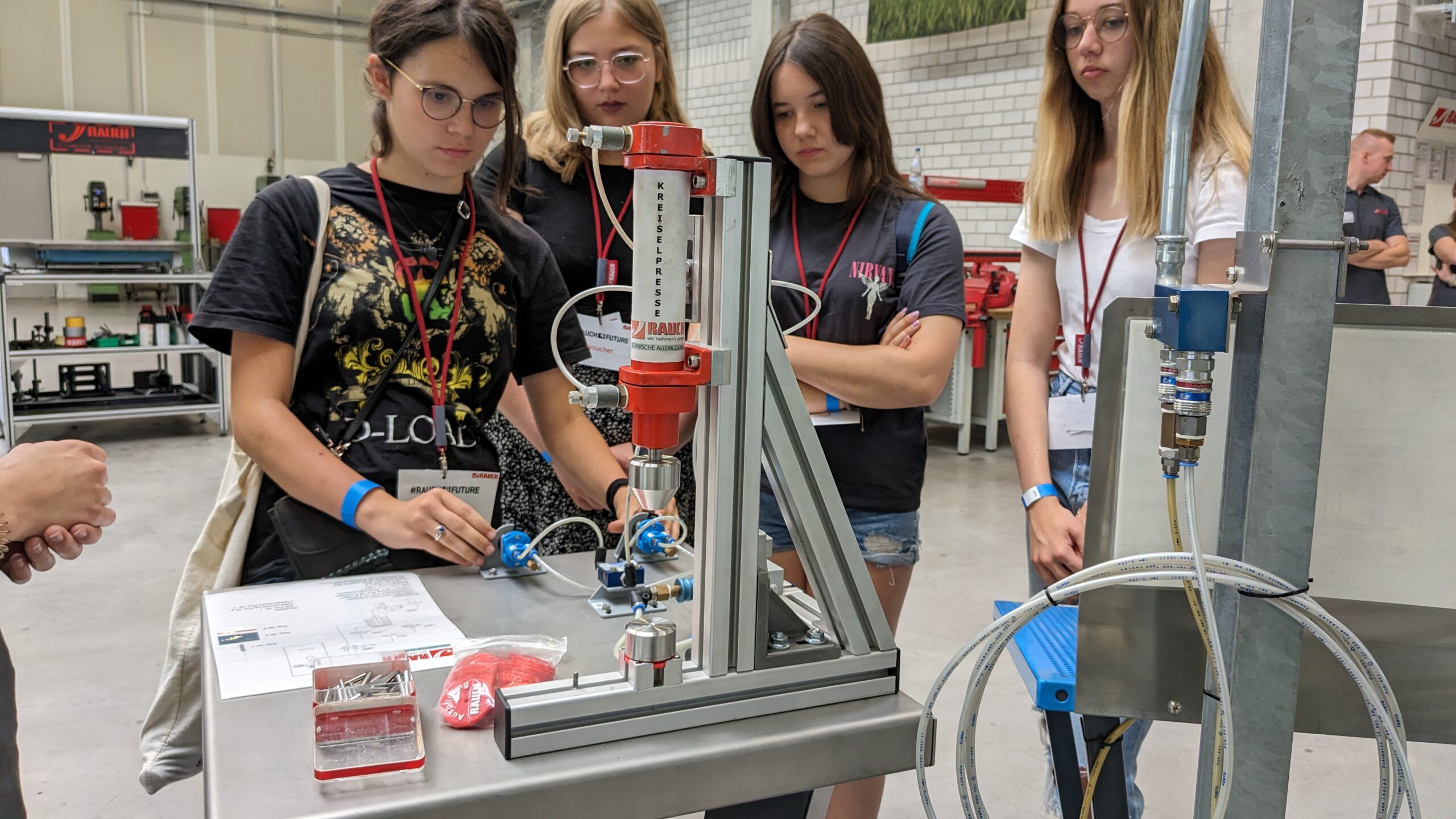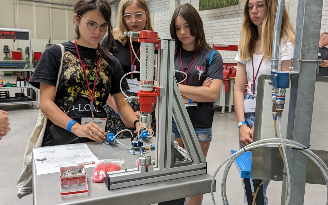 Unter dem Schwerpunkt „Ausbildung“ erfuhren wir, was Inhalte der gewerblichen/technischen Ausbildung und der kaufmännischen Ausbildung sind. Diverse Auszubildende der Firma Rauch stellten sich unseren Fragen, präsentierten ihre Arbeit und informierten über die Vielfältigkeit und die Besonderheiten bei der Ausbildung als Industriekaufmann/-frau, Werkzeugmechaniker/-in und Industriemechaniker/-in bei der Firma Rauch. Jeder durfte einen Kreisel selbst machen und einen gebogenen Handyständer als Andenken mitnehmen.