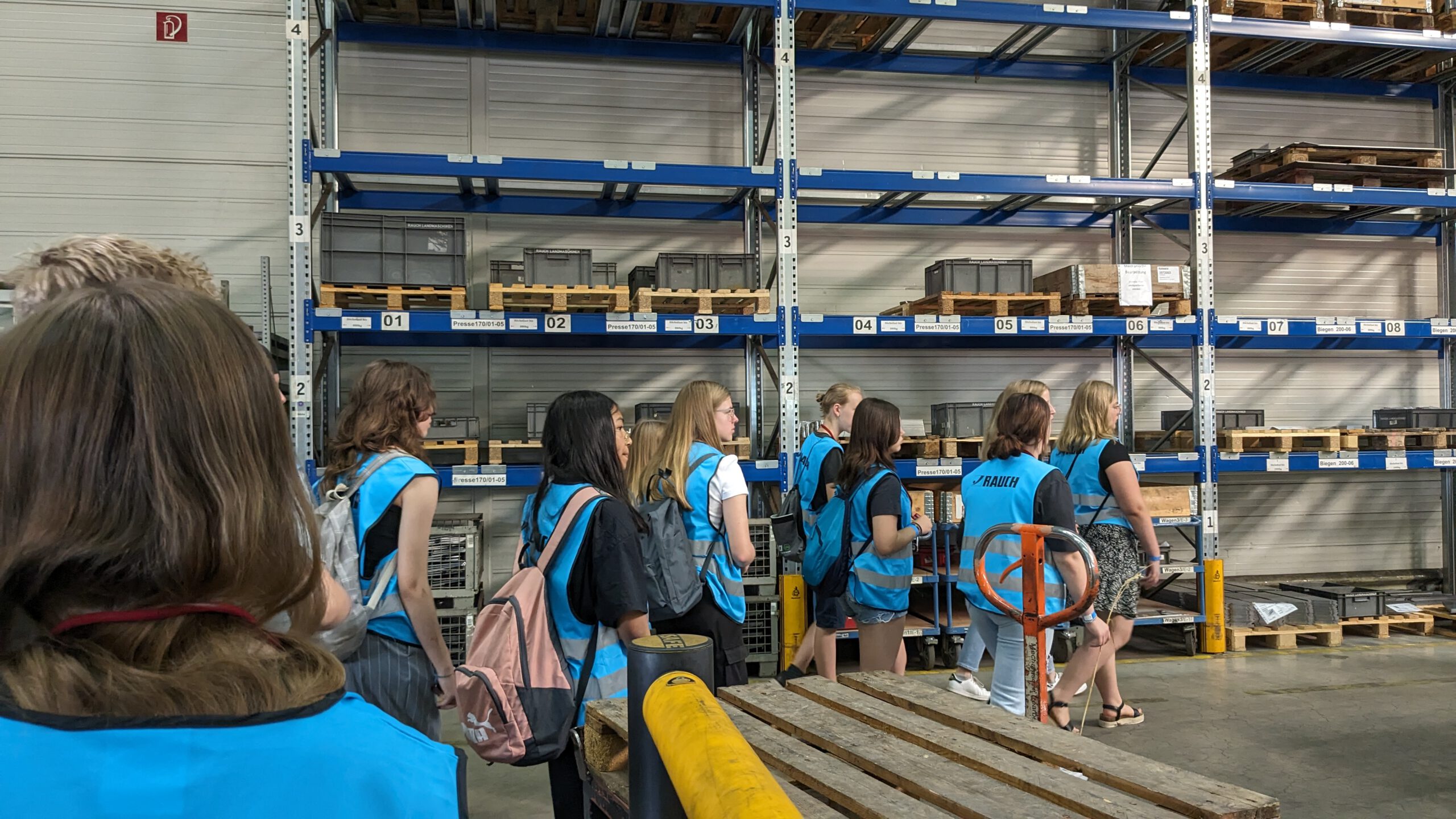 Auch eine Betriebsbegehung der Werkshallen durfte natürlich nicht fehlen. Mit Headsets und Warnwesten ausgestattet, sahen wir alle wichtigen Produktionsschritte. Lasern, biegen, pressen, schweißen, flexen und die anschließende „Hochzeit“, reinigen und vorbereiten für den Pulverbereich und das Brennen im Ofen wurden sichtbar und hinterließen beeindruckte Schüler/-innen.