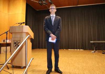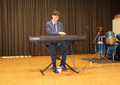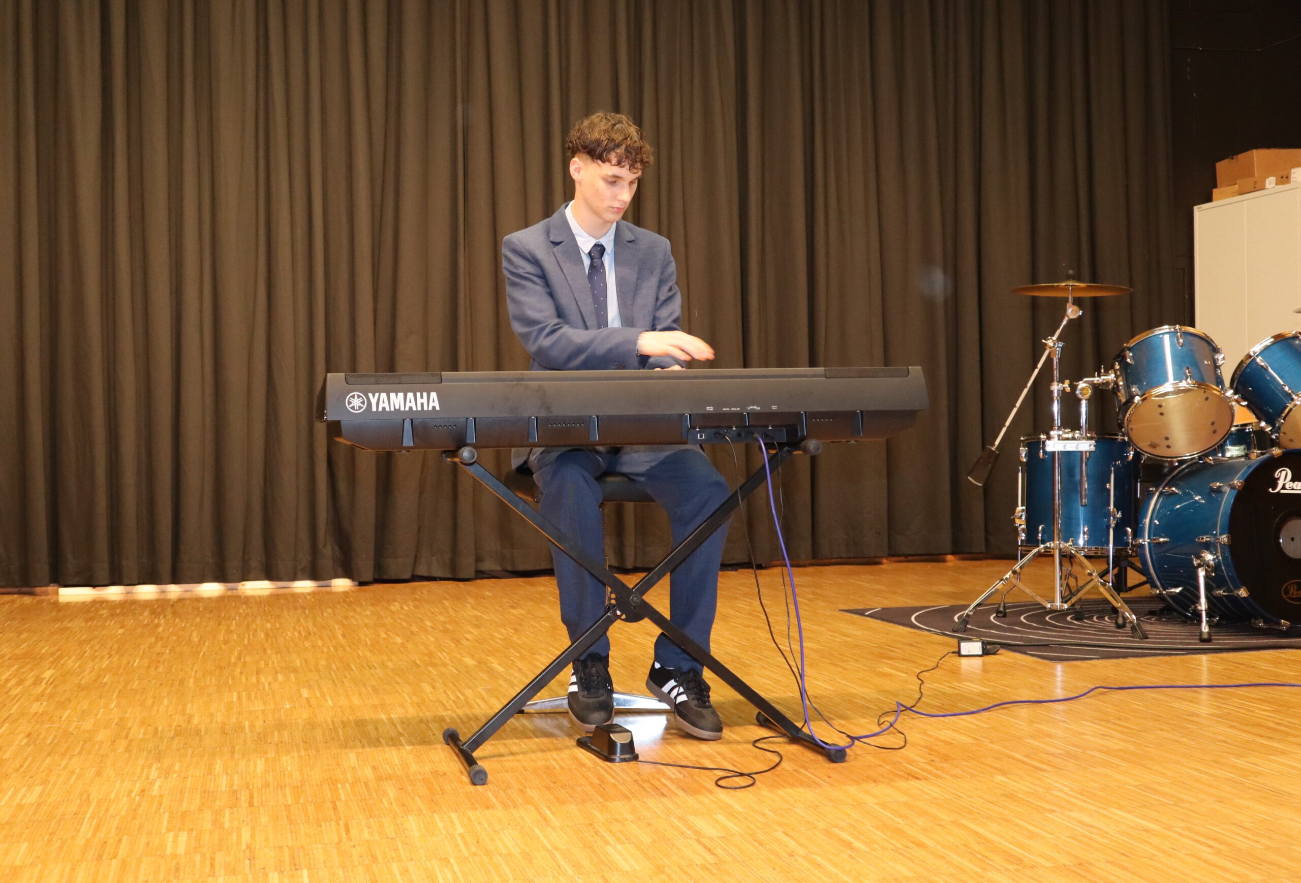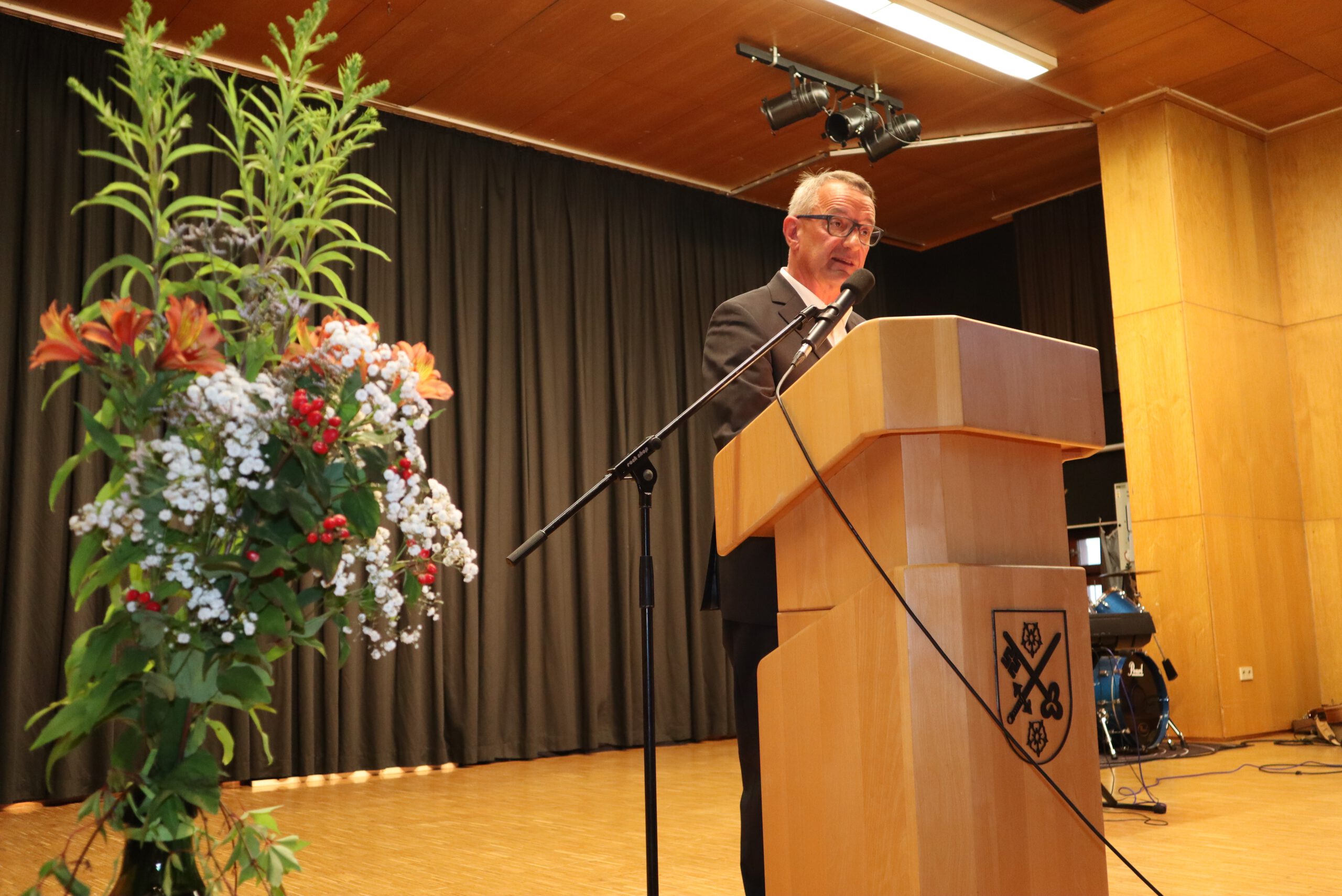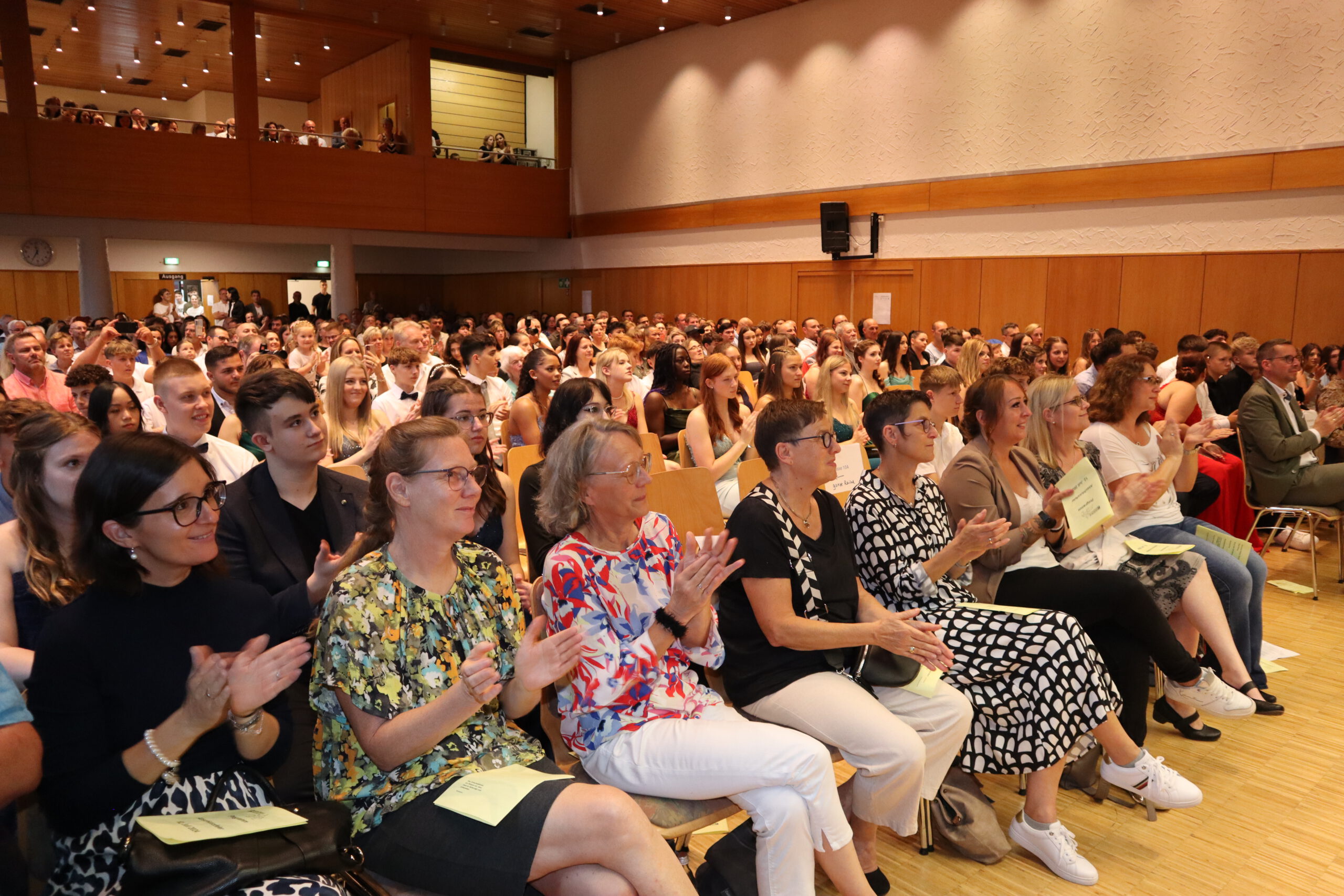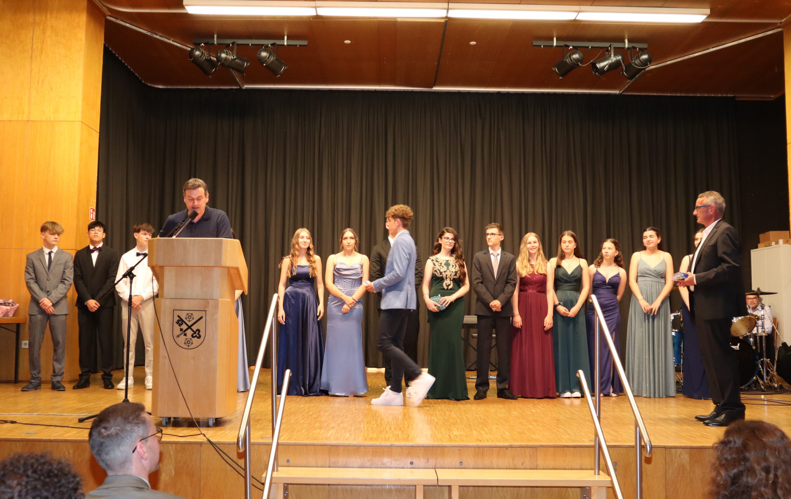 Musikalisch eröffnet wurde die Feier von Lars Hofmann aus der Klasse 10b mit dem Klavierstück „Runaway“.  Rektor Rolf Schemel wandte sich in seiner Rede an die 67 Mittleren-Reife-Geprüften und die 12 Hauptschul-Absolventen und gratulierte ihnen dazu, „das Finale erreicht und den Sieg davongetragen“ zu haben. Er blickte – ebenso wie die Klassenlehrer in ihren Ansprachen – zurück auf eine besondere Schulzeit, in der sicher die Corona-Pandemie prägend gewesen war, von der aber auch am anderen Ende des Spektrums Klassenfahrten, Schulveranstaltungen wie die traditionell von den Zehntklässlern organisierte Faschingsfeier , entstandene Freundschaften und gute Lehrer-Schüler-Beziehungen besonders positiv in Erinnerung bleiben werden. Den Eltern dankte Schemel für die stete „Unterstützung von der Seitenlinie aus“ und erntete zustimmendes Nicken, als er feststellte, dass es nach den letzten prüfungsreichen Wochen nun sicher für die gesamten Familien „Zeit für den Abpfiff“ geworden sei.