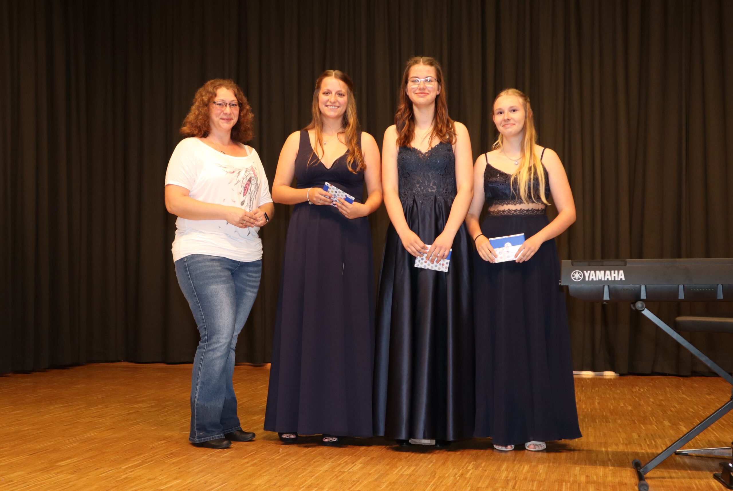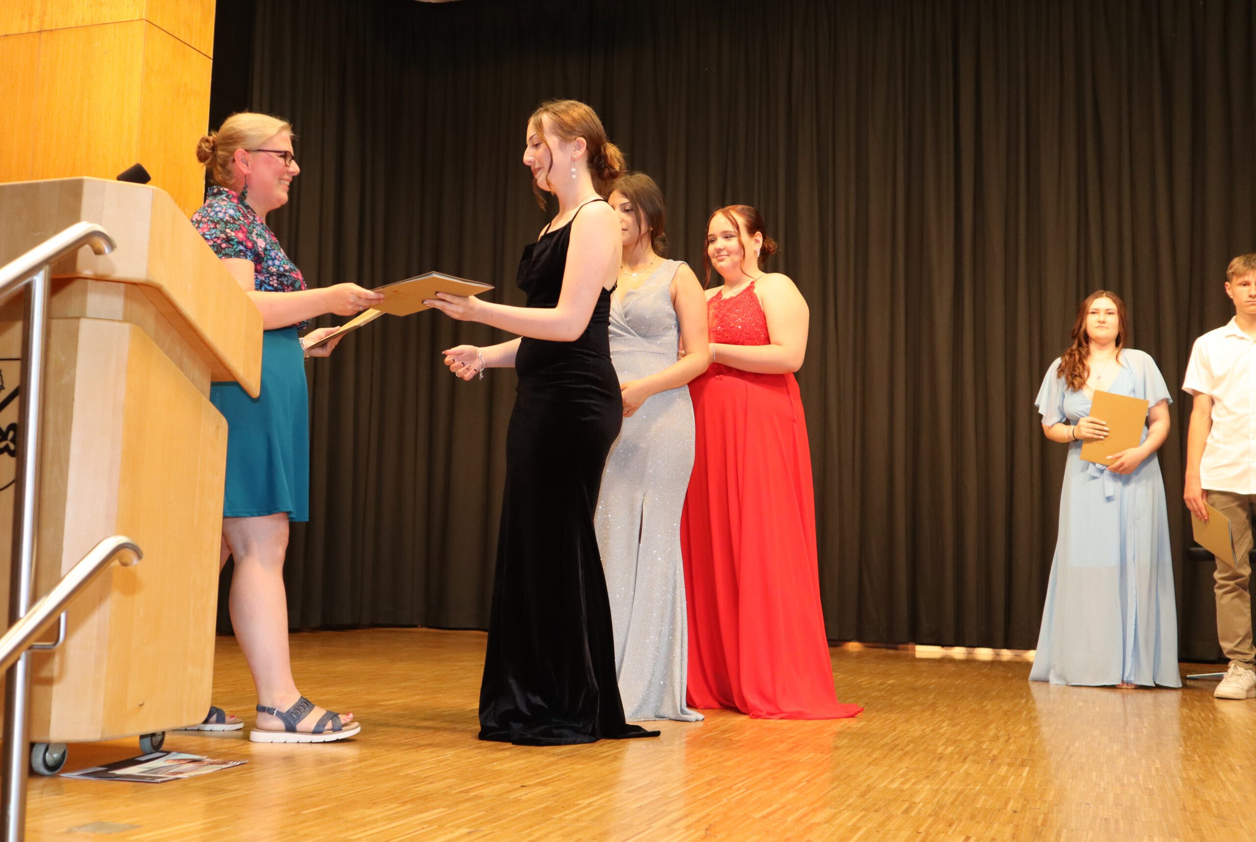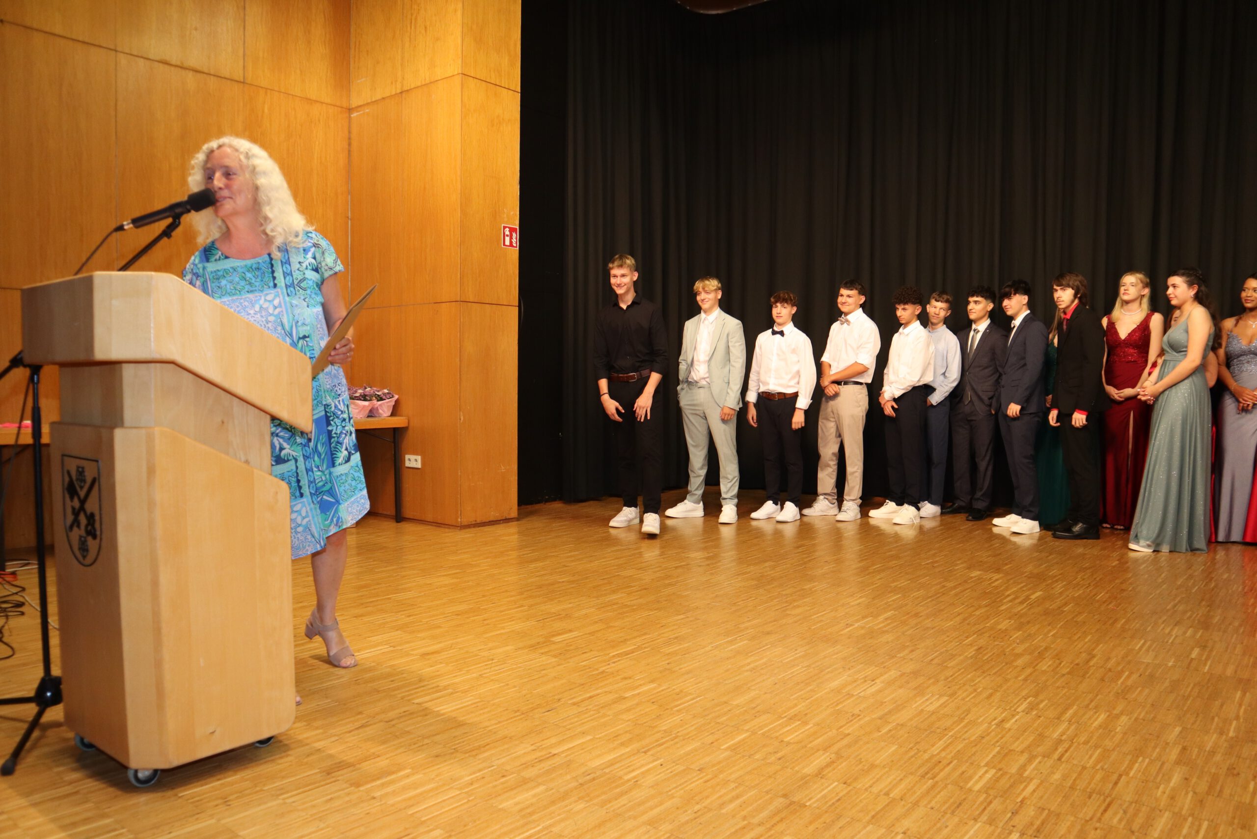Der Vorsitzenden des Förderkreises, Antje Burkart, oblag es, die scheidenden Schulsanitäter Sophia Seiler (10a), Leonie Drapp (10a) und Ronja Horcher (10b) mit dem Sozialpreis für besonderes soziales Engagement auszuzeichnen. Die Leiterin der Schülerbibliothek, Monika Kohl-Wald, bedankte sich bei Ruth Ajose (10b) und Maya-Ioana Formagiu (10a) für ihr Engagement im Bibliotheksteam. Die beiden Verbindungslehrer Michaela Bohn-Vogel und Thomas Wertal verabschiedeten Mirko Hübner (10b), der seit diesem Schuljahr Schülersprecher der Realschule war und sein Amt mit viel Verantwortungsgefühl und Pflichtbewusstsein ausgeführt hat. Außerdem bedankten sie sich bei den Klassensprechern der Abschlussklassen für ihr beständiges Engagement im Interesse ihrer Mitschüler. Schließlich schritt die Vorsitzende des Elternbeirats, Sandra Kautz, zum Rednerpult und gratulierte den Absolventen im Namen der gesamten Elternschaft zu ihren Schulabschlüssen. Sie wünschte den Schulabgängern, die nach ihrem Abschluss schon bald neue Ziele anstreben werden, Vertrauen in sich selbst zu haben und zu erkennen, dass sie ihr Leben selbst gestalten und Verantwortung für sich und ihre Welt übernehmen können. Und so ging an diesem Abend zur  Melodie von Princes`“Purple Rain“  nicht nur eine kurzweilige Abschlussfeier zu Ende, sondern auch ein Lebensabschnitt für die Absolventinnen und Absolventen, an den sich bald neue Herausforderungen anschließen werden.