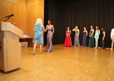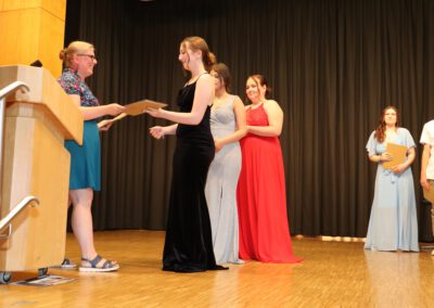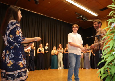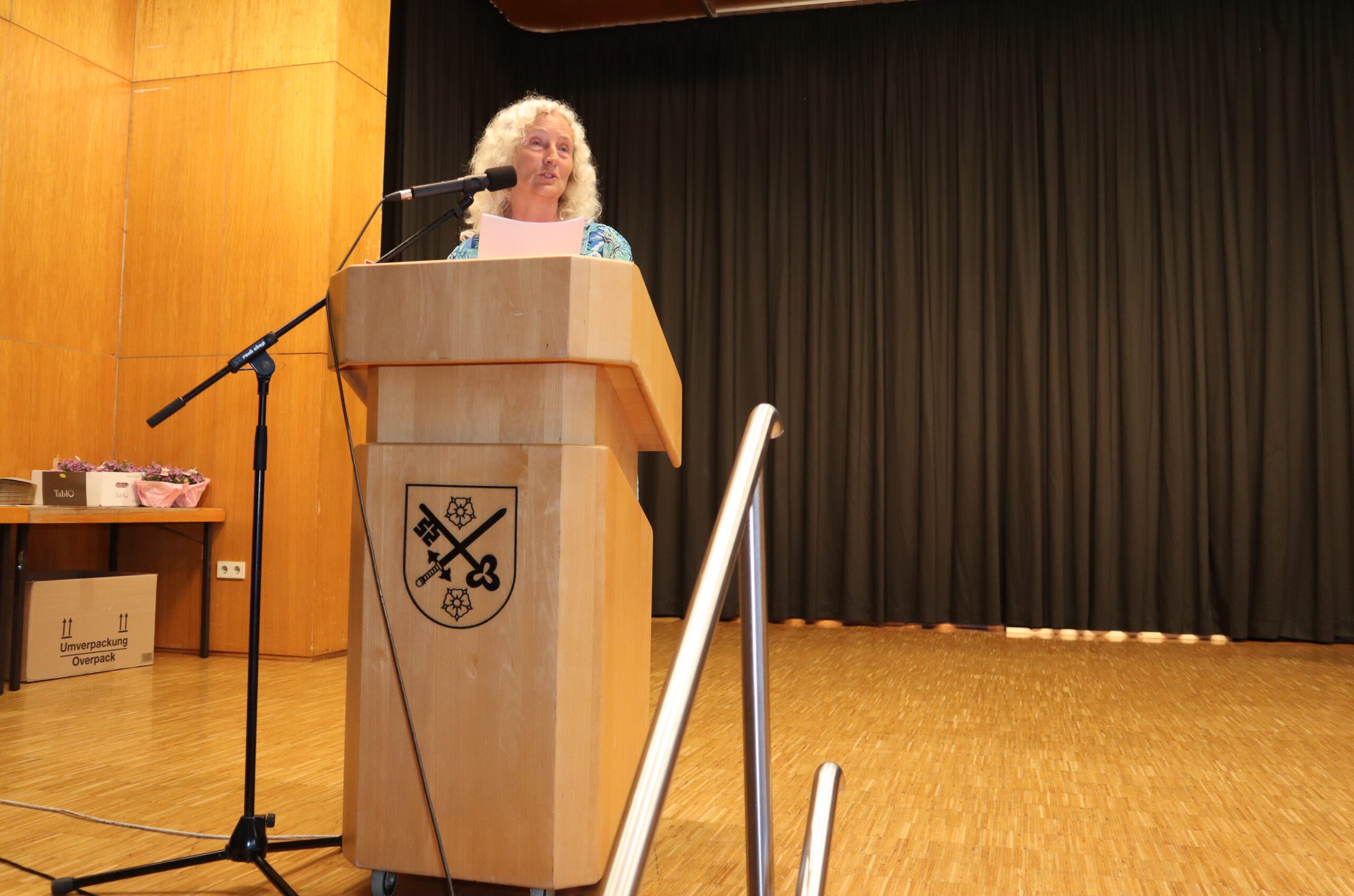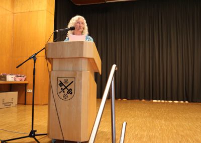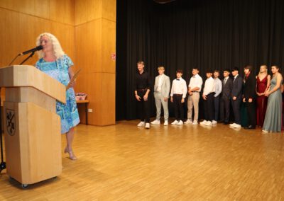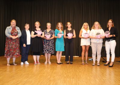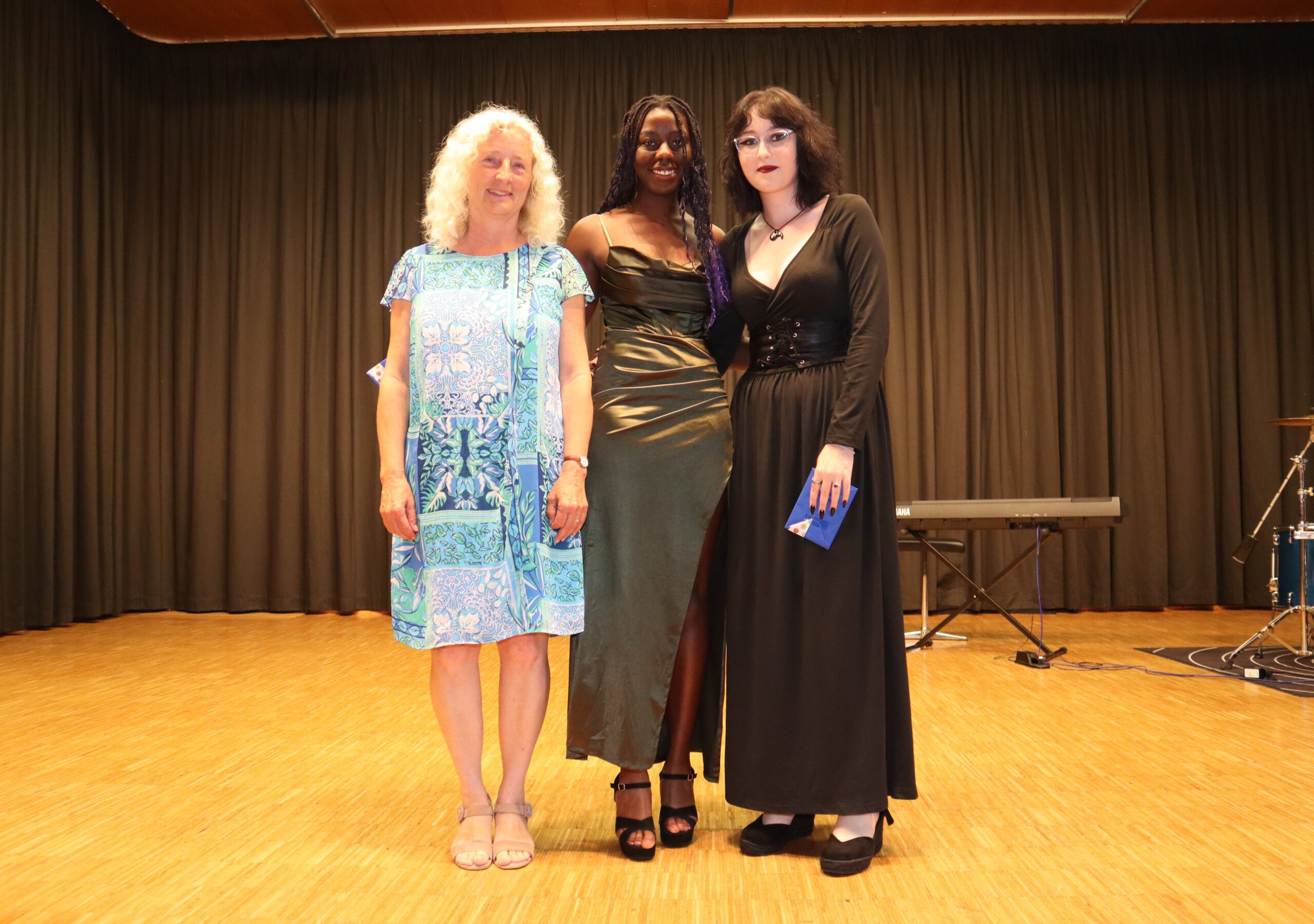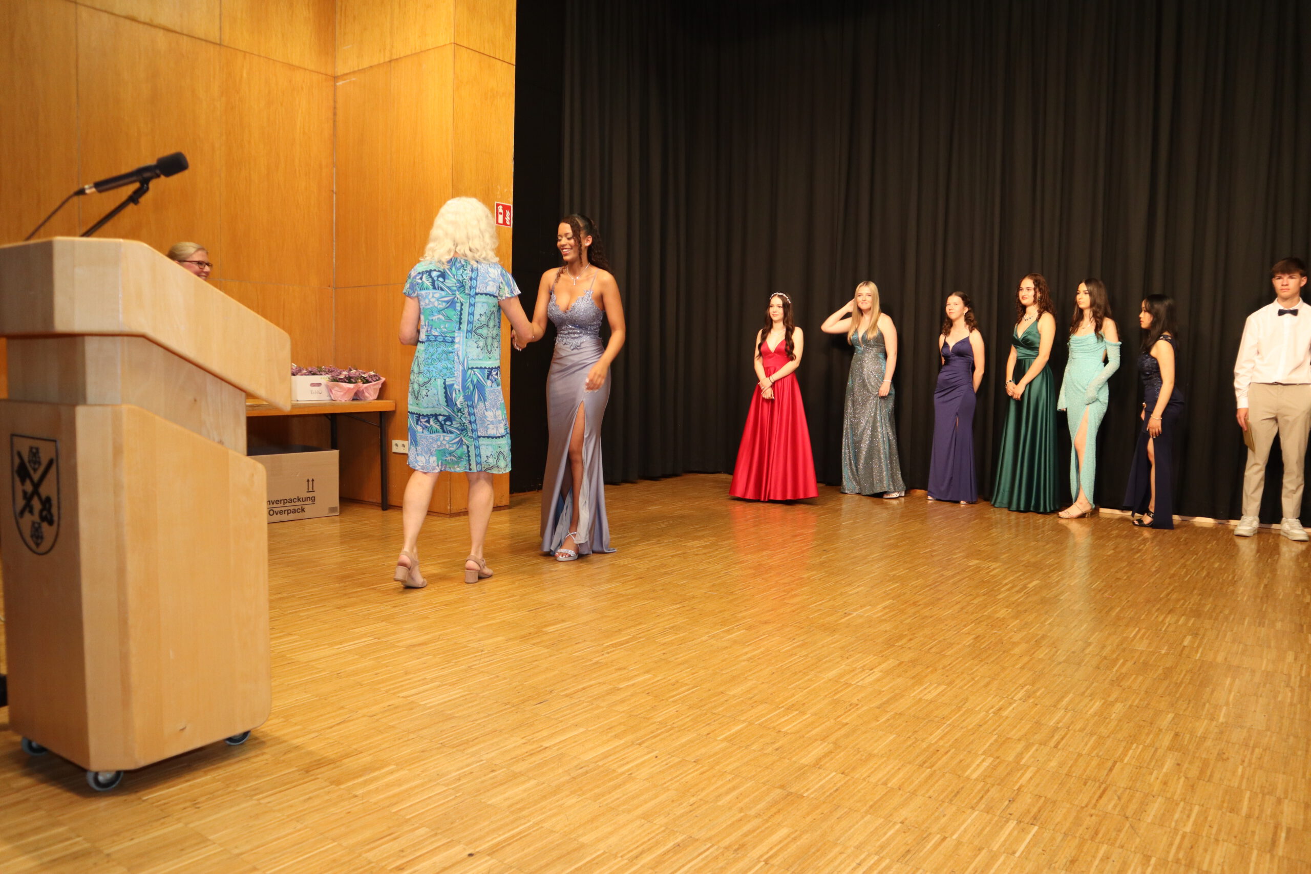 Der Vorsitzenden des Förderkreises, Antje Burkart, oblag es, die scheidenden Schulsanitäter Sophia Seiler (10a), Leonie Drapp (10a) und Ronja Horcher (10b) mit dem Sozialpreis für besonderes soziales Engagement auszuzeichnen. Die Leiterin der Schülerbibliothek, Monika Kohl-Wald, bedankte sich bei Ruth Ajose (10b) und Maya-Ioana Formagiu (10a) für ihr Engagement im Bibliotheksteam. Die beiden Verbindungslehrer Michaela Bohn-Vogel und Thomas Wertal verabschiedeten Mirko Hübner (10b), der seit diesem Schuljahr Schülersprecher der Realschule war und sein Amt mit viel Verantwortungsgefühl und Pflichtbewusstsein ausgeführt hat. Außerdem bedankten sie sich bei den Klassensprechern der Abschlussklassen für ihr beständiges Engagement im Interesse ihrer Mitschüler. Schließlich schritt die Vorsitzende des Elternbeirats, Sandra Kautz, zum Rednerpult und gratulierte den Absolventen im Namen der gesamten Elternschaft zu ihren Schulabschlüssen. Sie wünschte den Schulabgängern, die nach ihrem Abschluss schon bald neue Ziele anstreben werden, Vertrauen in sich selbst zu haben und zu erkennen, dass sie ihr Leben selbst gestalten und Verantwortung für sich und ihre Welt übernehmen können. Und so ging an diesem Abend zur  Melodie von Princes`“Purple Rain“  nicht nur eine kurzweilige Abschlussfeier zu Ende, sondern auch ein Lebensabschnitt für die Absolventinnen und Absolventen, an den sich bald neue Herausforderungen anschließen werden.