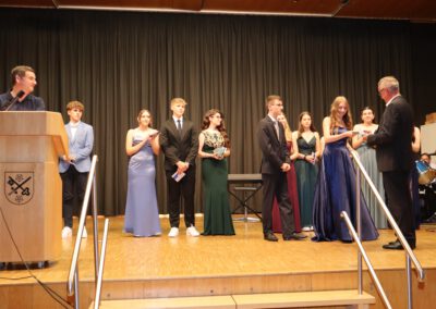 Musikalisch eröffnet wurde die Feier von Lars Hofmann aus der Klasse 10b mit dem Klavierstück „Runaway“. Rektor Rolf Schemel wandte sich in seiner Rede an die 67 Mittleren-Reife-Geprüften und die 12 Hauptschul-Absolventen und gratulierte ihnen dazu, „das Finale erreicht und den Sieg davongetragen“ zu haben. Er blickte – ebenso wie die Klassenlehrer in ihren Ansprachen – zurück auf eine besondere Schulzeit, in der sicher die Corona-Pandemie prägend gewesen war, von der aber auch am anderen Ende des Spektrums Klassenfahrten, Schulveranstaltungen wie die traditionell von den Zehntklässlern organisierte Faschingsfeier , entstandene Freundschaften und gute Lehrer-Schüler-Beziehungen besonders positiv in Erinnerung bleiben werden. Den Eltern dankte Schemel für die stete „Unterstützung von der Seitenlinie aus“ und erntete zustimmendes Nicken, als er feststellte, dass es nach den letzten prüfungsreichen Wochen nun sicher für die gesamten Familien „Zeit für den Abpfiff“ geworden sei.