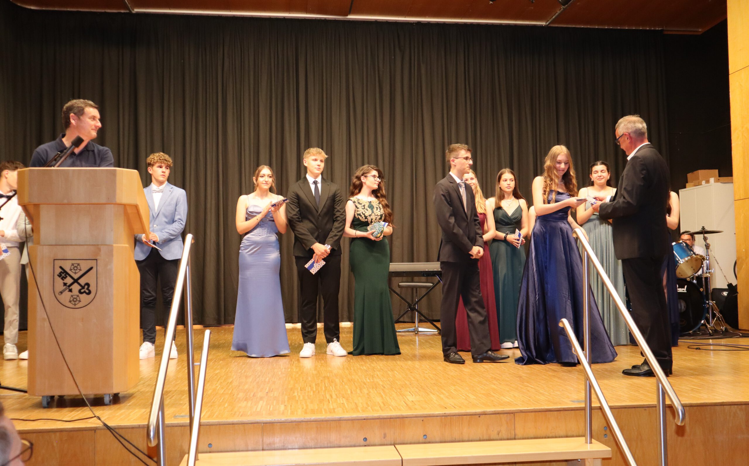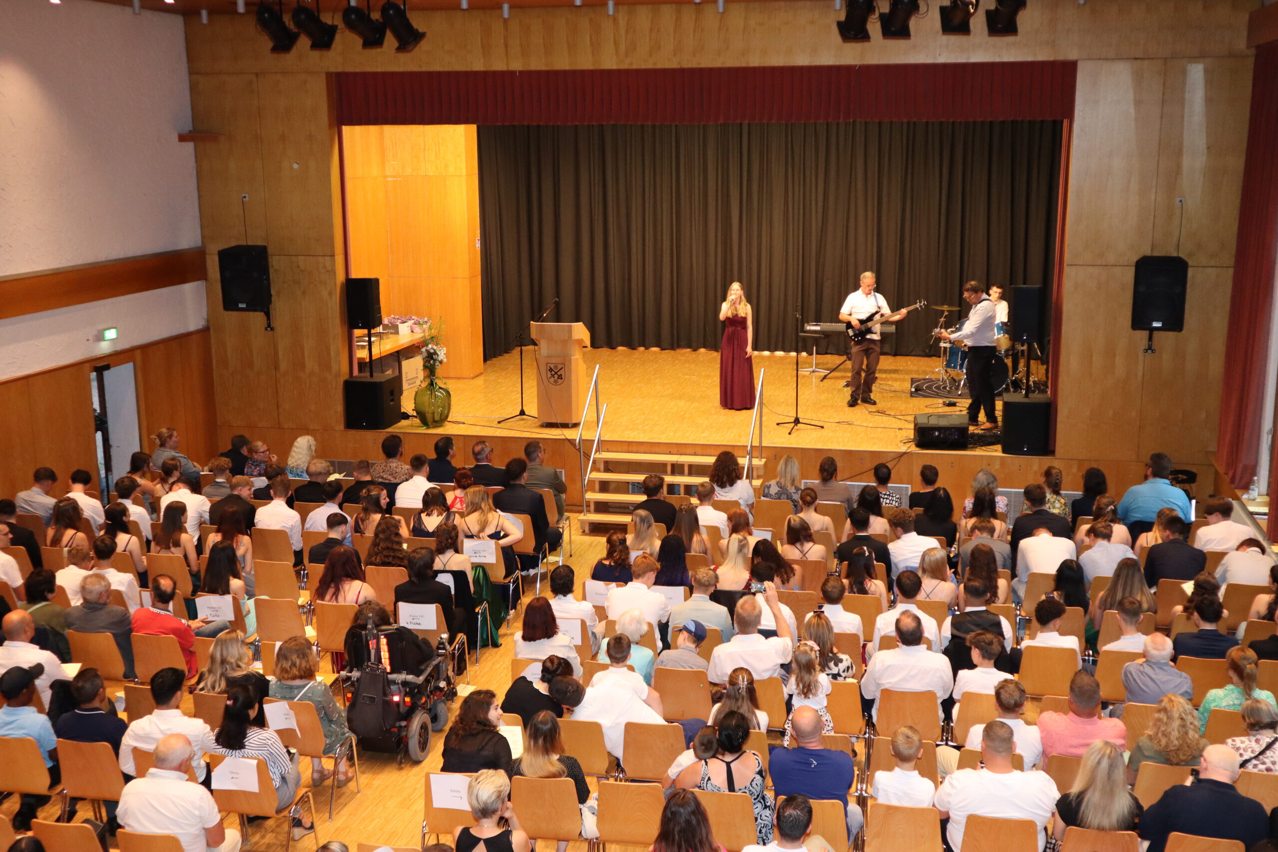In festlicher Atmosphäre trafen sich die Schülerinnen und Schüler des Abschlussjahrganges 2024 der Realschule Rheinmünster am Freitagabend in der bis auf den letzten Platz besetzten Schwarzacher Festhalle. Nach einem ökumenischen Gottesdienst unter dem Motto „Spring! Neue Wege – neues Glück!“ im Schwarzacher Münster feierten sie gemeinsam mit ihren Angehörigen, ihren Lehrkräften und zahlreichen Ehrengästen  das Erreichen ihrer Mittleren Reife bzw. ihrer Hauptschulabschlüsse und das Ende ihrer Schulzeit an der Schwarzacher Realschule.