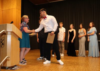 Der Vorsitzenden des Förderkreises, Antje Burkart, oblag es, die scheidenden Schulsanitäter Sophia Seiler (10a), Leonie Drapp (10a) und Ronja Horcher (10b) mit dem Sozialpreis für besonderes soziales Engagement auszuzeichnen. Die Leiterin der Schülerbibliothek, Monika Kohl-Wald, bedankte sich bei Ruth Ajose (10b) und Maya-Ioana Formagiu (10a) für ihr Engagement im Bibliotheksteam. Die beiden Verbindungslehrer Michaela Bohn-Vogel und Thomas Wertal verabschiedeten Mirko Hübner (10b), der seit diesem Schuljahr Schülersprecher der Realschule war und sein Amt mit viel Verantwortungsgefühl und Pflichtbewusstsein ausgeführt hat. Außerdem bedankten sie sich bei den Klassensprechern der Abschlussklassen für ihr beständiges Engagement im Interesse ihrer Mitschüler. Schließlich schritt die Vorsitzende des Elternbeirats, Sandra Kautz, zum Rednerpult und gratulierte den Absolventen im Namen der gesamten Elternschaft zu ihren Schulabschlüssen. Sie wünschte den Schulabgängern, die nach ihrem Abschluss schon bald neue Ziele anstreben werden, Vertrauen in sich selbst zu haben und zu erkennen, dass sie ihr Leben selbst gestalten und Verantwortung für sich und ihre Welt übernehmen können. Und so ging an diesem Abend zur Melodie von Princes`“Purple Rain“ nicht nur eine kurzweilige Abschlussfeier zu Ende, sondern auch ein Lebensabschnitt für die Absolventinnen und Absolventen, an den sich bald neue Herausforderungen anschließen werden.