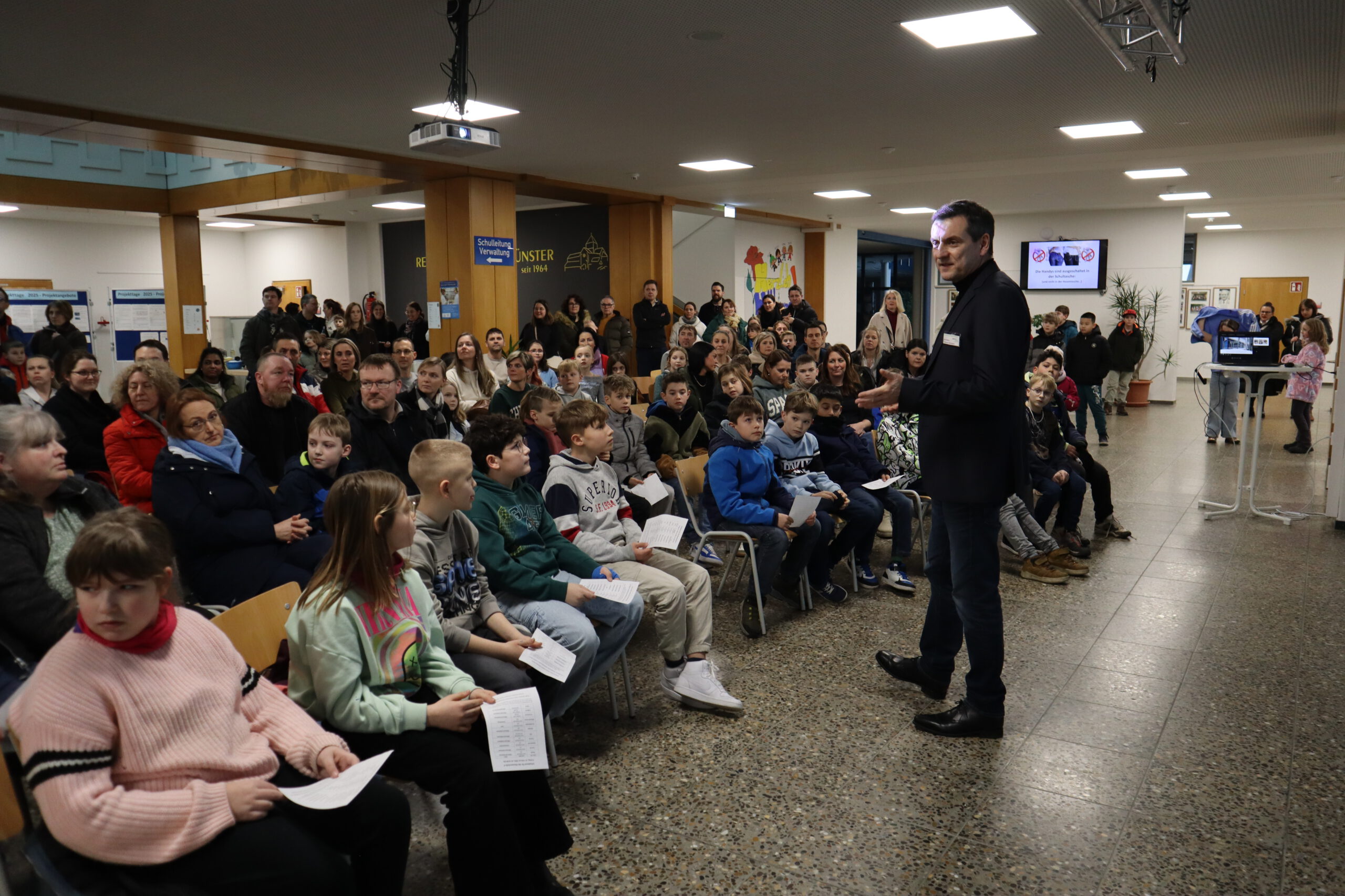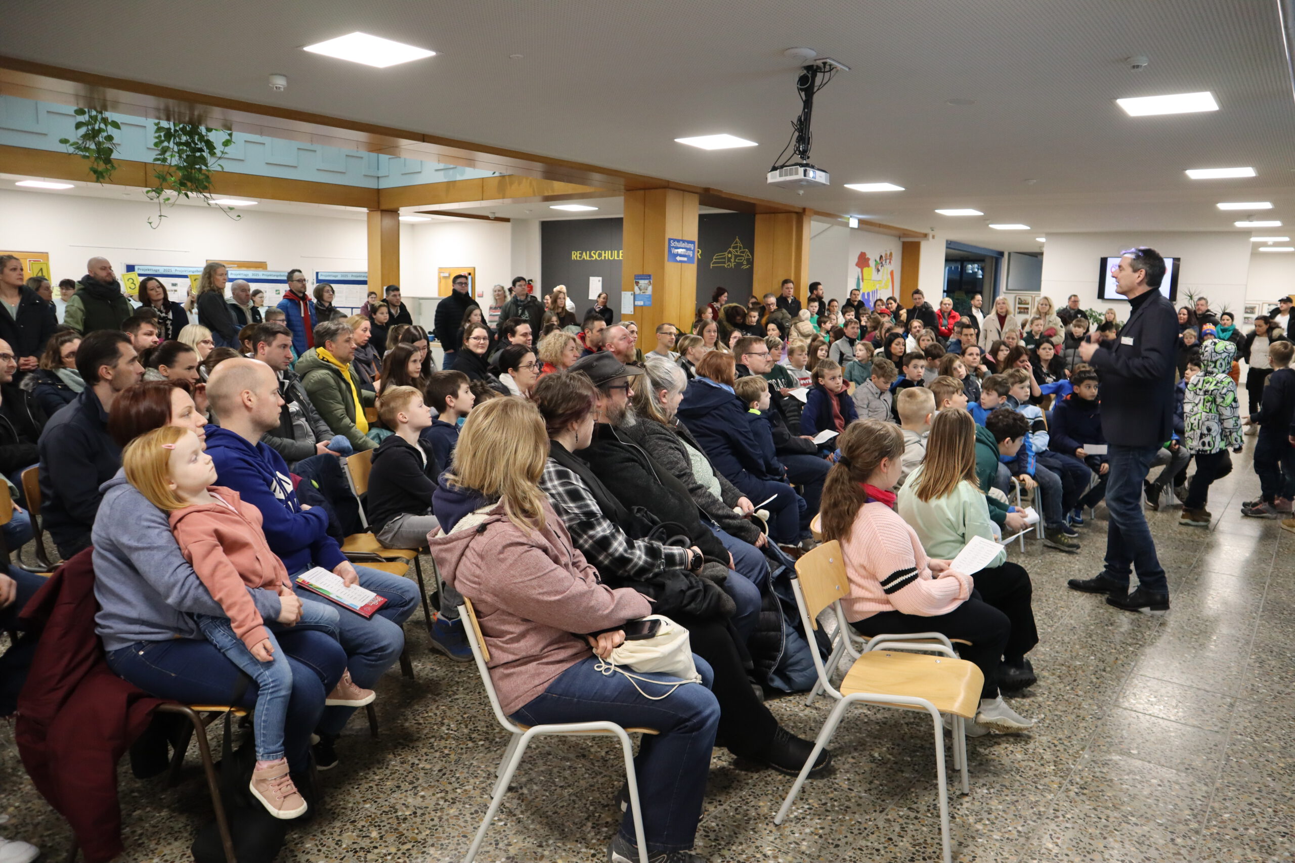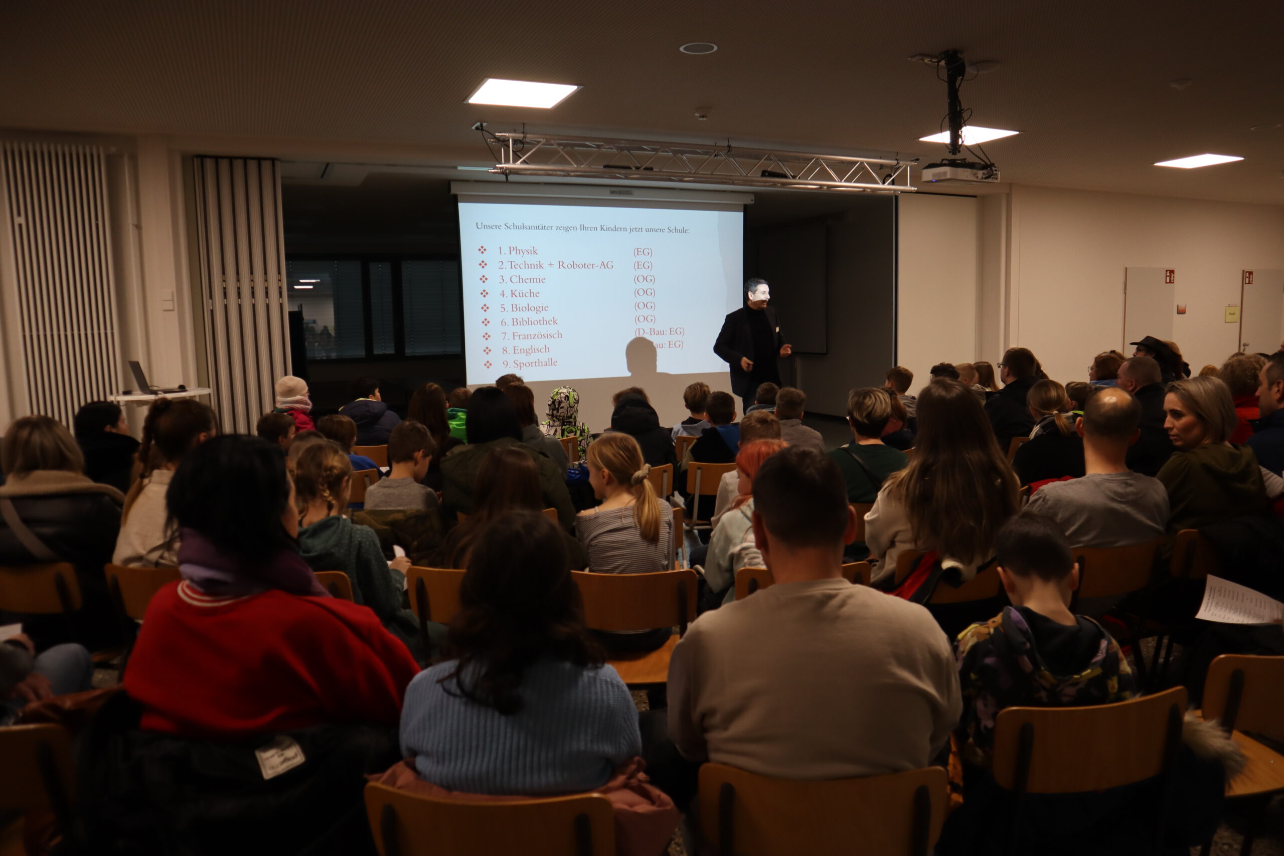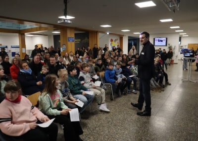 Nach der musikalischen Begrüßung übernahm Konrektor Thomas Herrmann das Wort und hieß die zukünftigen Fünftklässler und ihre Eltern  in der Aula willkommen. Anschließend wurden die jungen Gäste von den Schulsanitätern angeleitet, die Schule auf einer spannenden Entdeckungstour zu erkunden. Die modernen Fachräume der Realschule waren für die Besucher geöffnet  und viele Fächer hatten kreative Mitmachangebote vorbereitet.