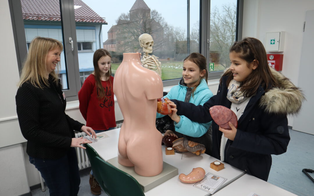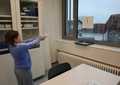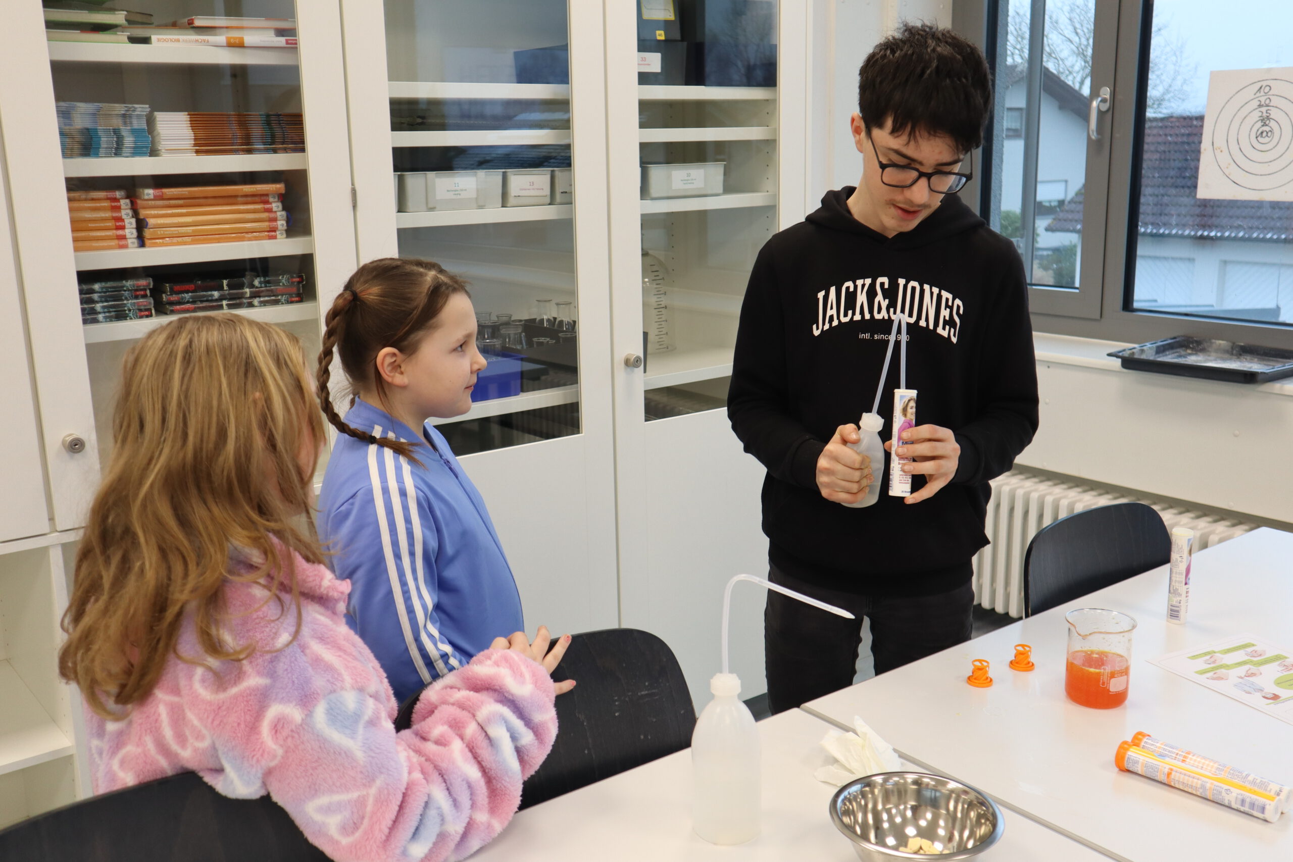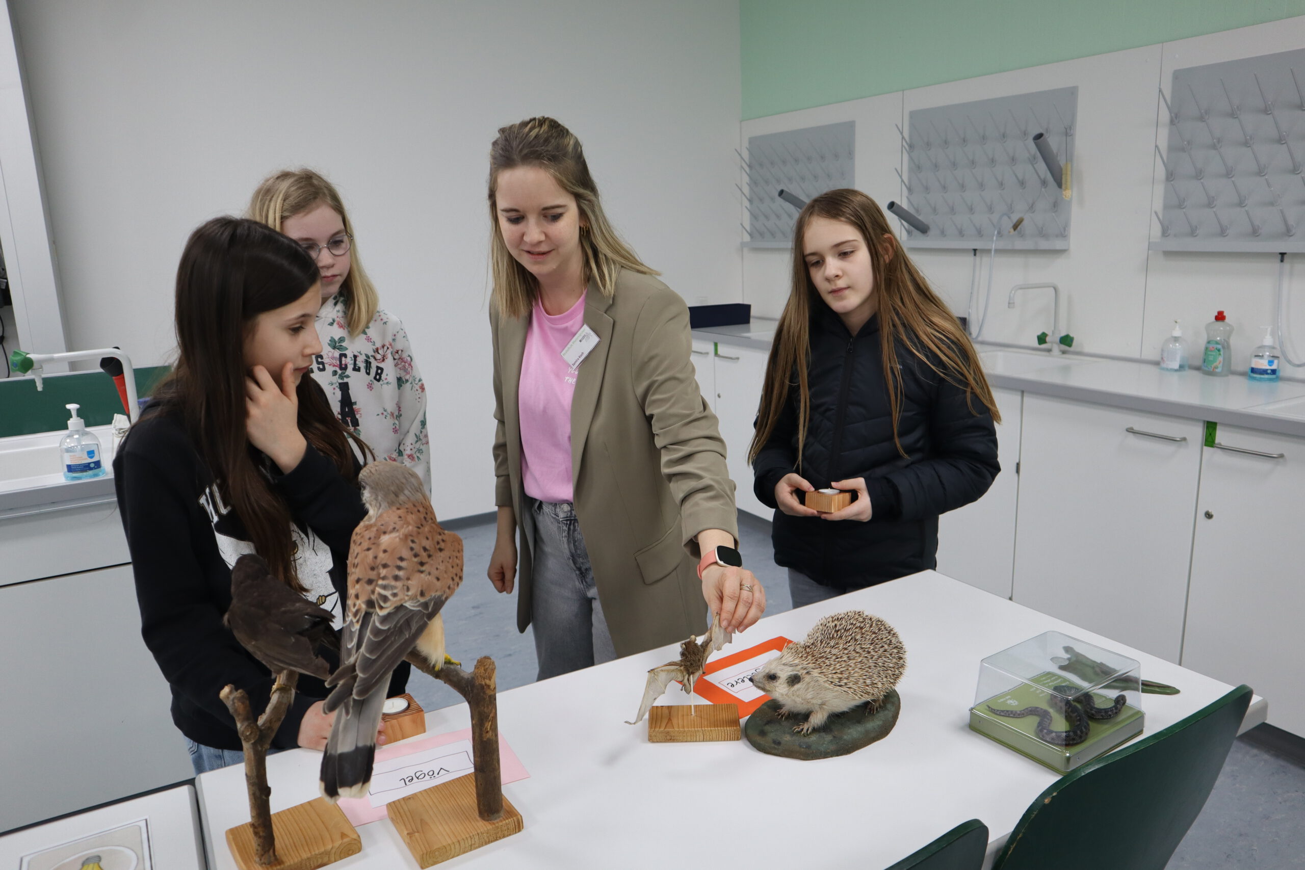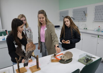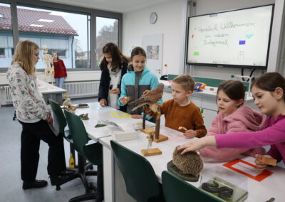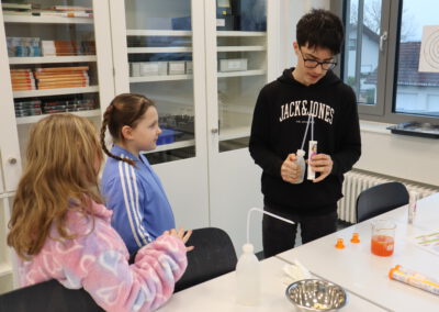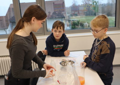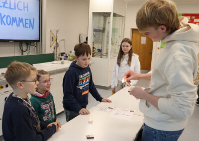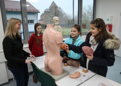Im Biologie-Saal hatten die Kinder unter anderem die Möglichkeit, ausgestopfte Wildtiere zu streicheln und diese den verschiedenen Wirbeltierklassen zuzuordnen. Im Chemiesaal führten Schüler höherer Klassen faszinierende Experimente durch, darunter das spektakuläre Experiment „Die springende Flamme“. Zudem konnten die jungen Besucher mit einer „Vitaminkanone“ auf eine Zielscheibe schießen, was für viel Freude und Begeisterung sorgte.