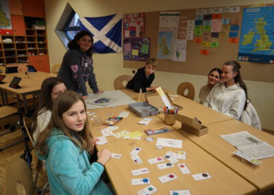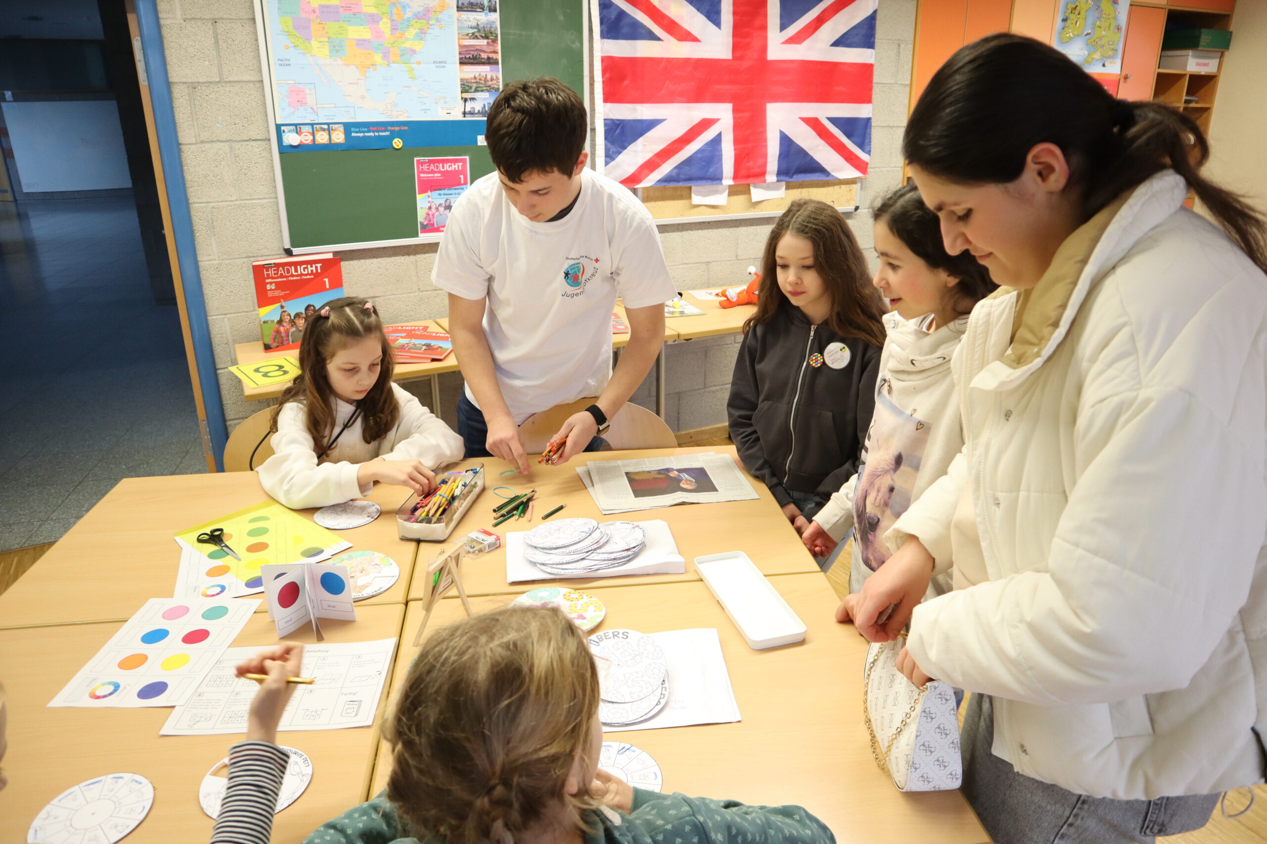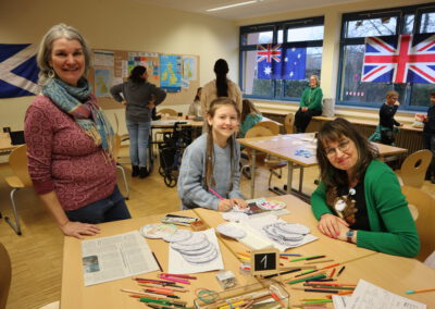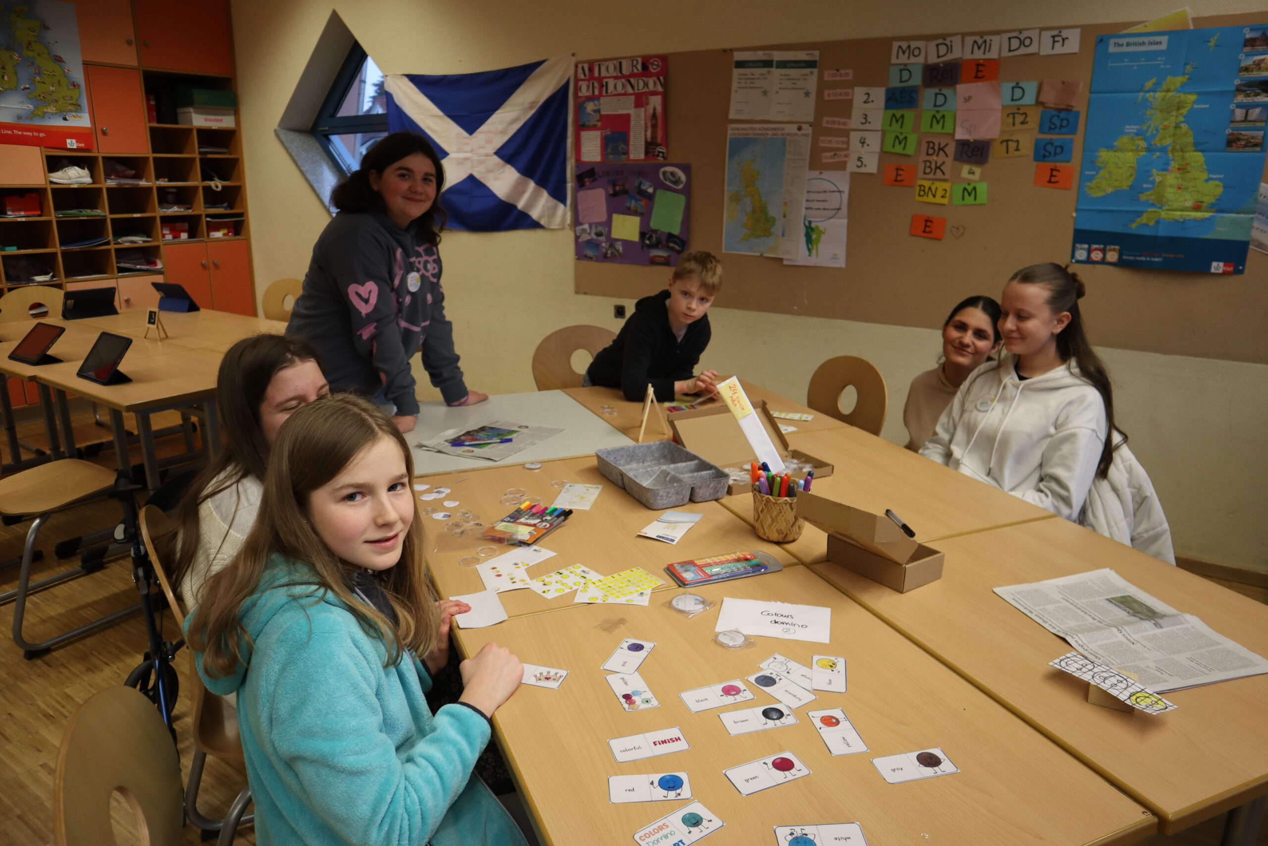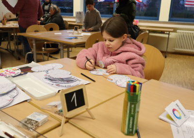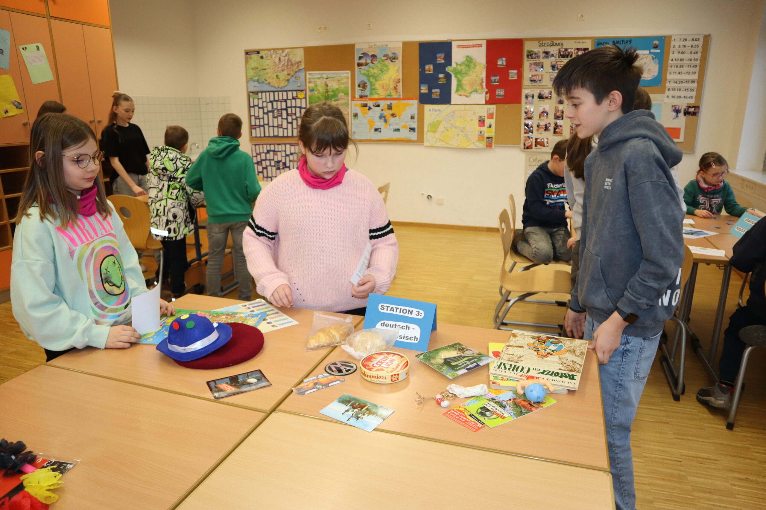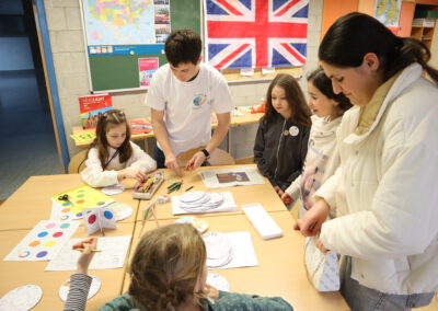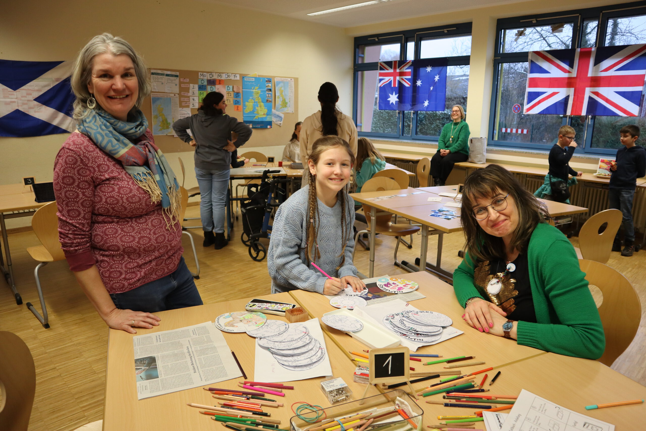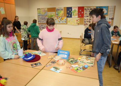 In den Räumen der Fächer Englisch und Französisch erhielten die Kinder erste Einblicke in die Fremdsprachen und auch in motivierende Memory-Techniken wie Vocabulary Wheels und Buddy Books. Zudem hatten sie die Möglichkeit, Buttons zu gestalten und in Französisch Delikatessen sowie typische Gegenstände verschiedenen Ländern zuzuordnen.