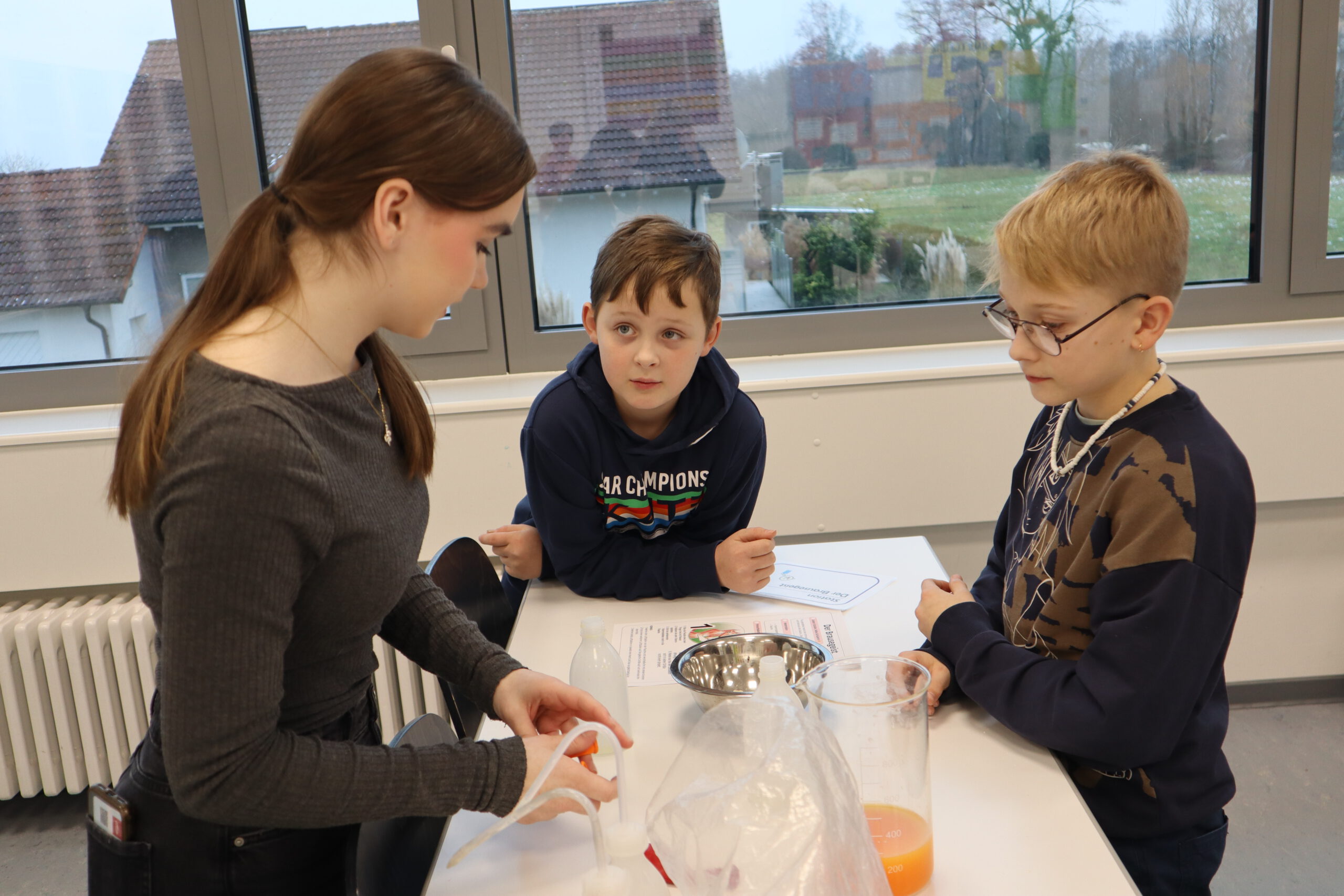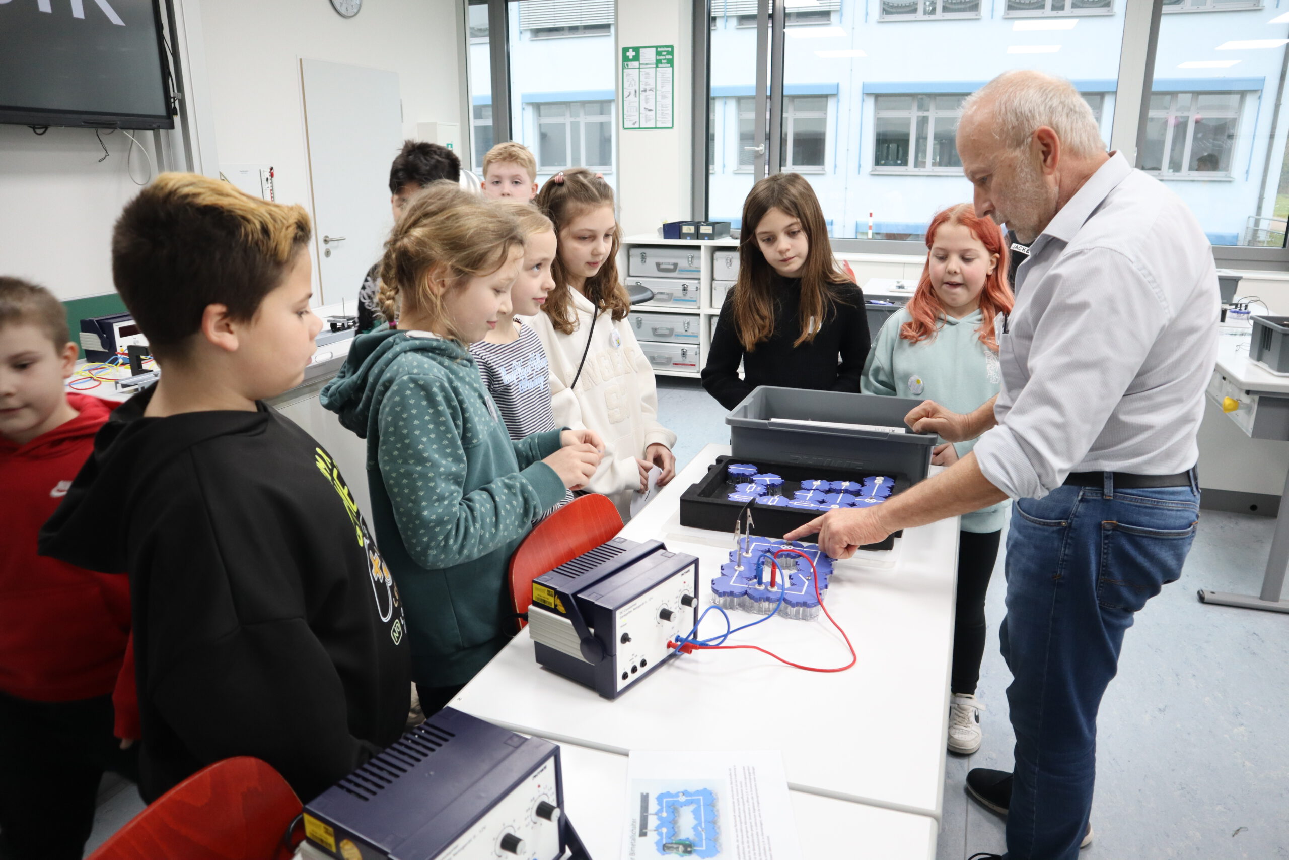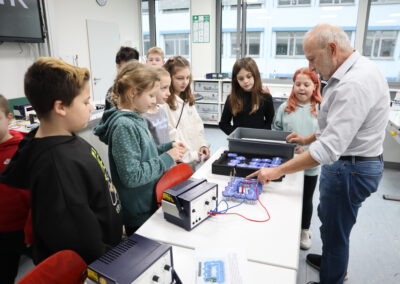 Der neue Physiksaal bot ebenfalls spannende Erlebnisse: Hier konnten die Viertklässler eigenhändig korrekt gesteckte Stromkreise aufbauen und damit Lämpchen zum Leuchten bringen. Bei einem Versuch mit Hochspannung erlebten sie nicht nur beeindruckende Blitze, sondern konnten auch ihre Haare zu Berge stehen lassen – ein unvergessliches Erlebnis!