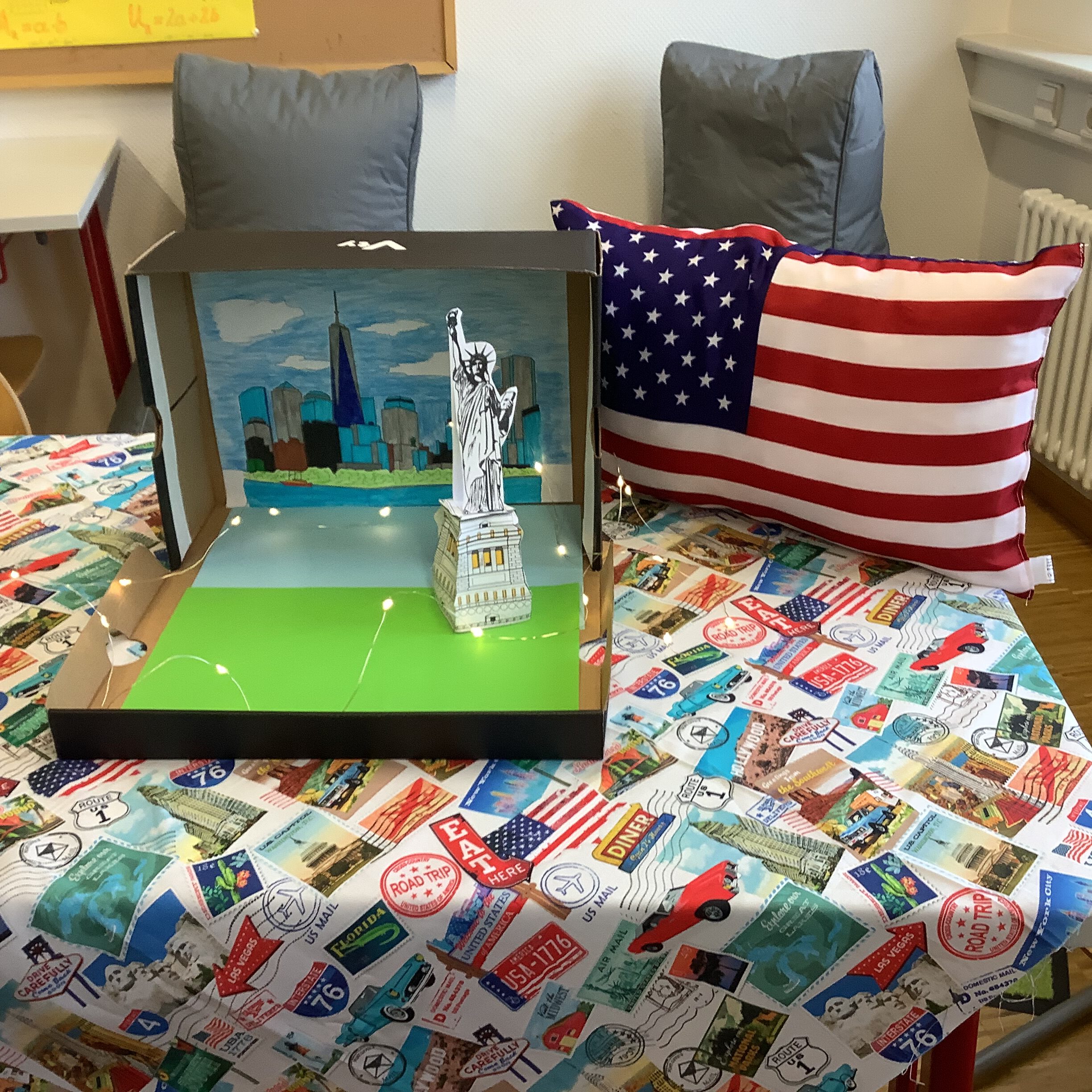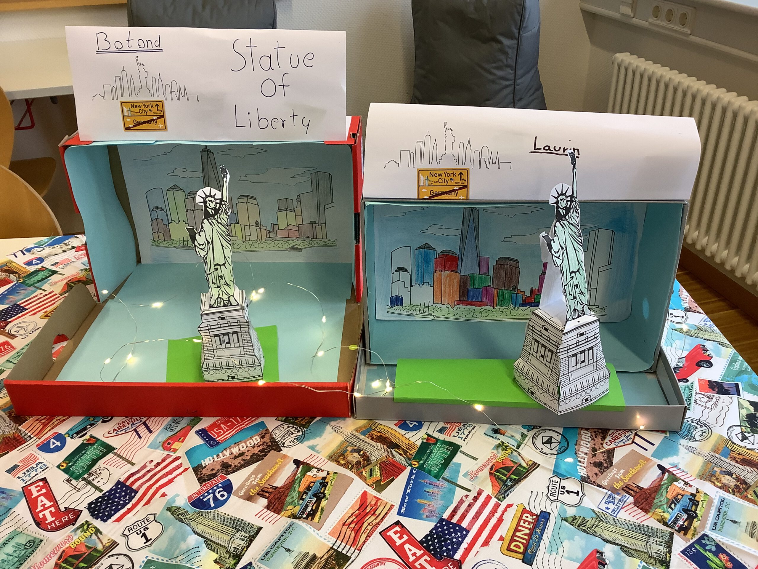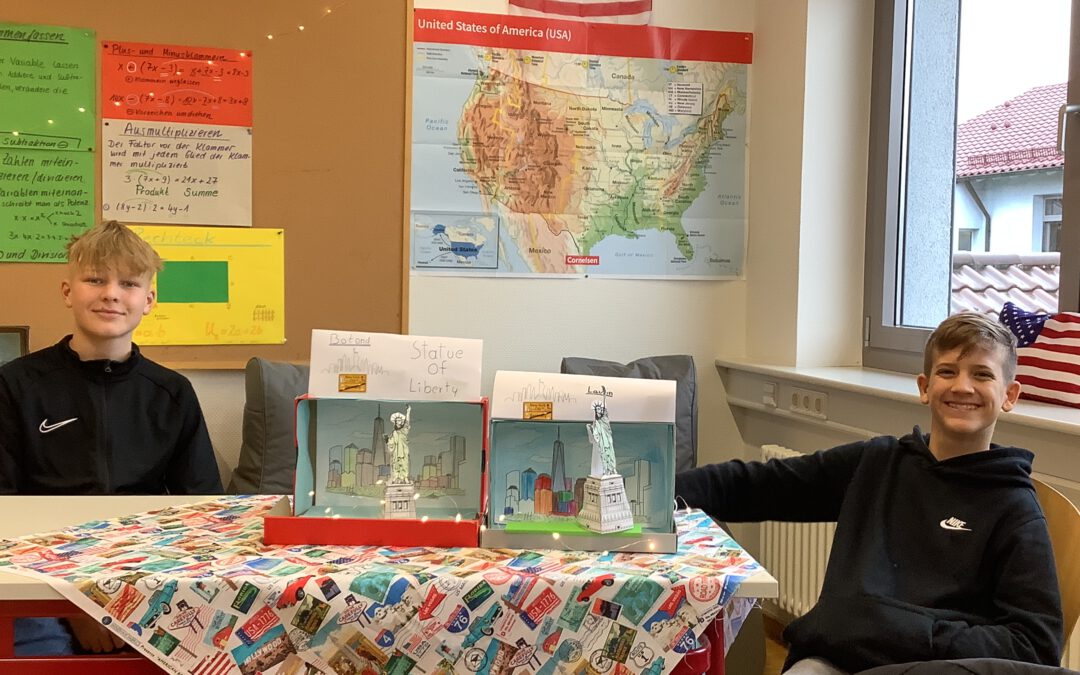 Class 8c made masterpieces about New York City. There´s the skyline of Manhattan and the Statue of Liberty on Ellis Island. The lights are shining pretty, too. The two boys are Botond and Laurin.