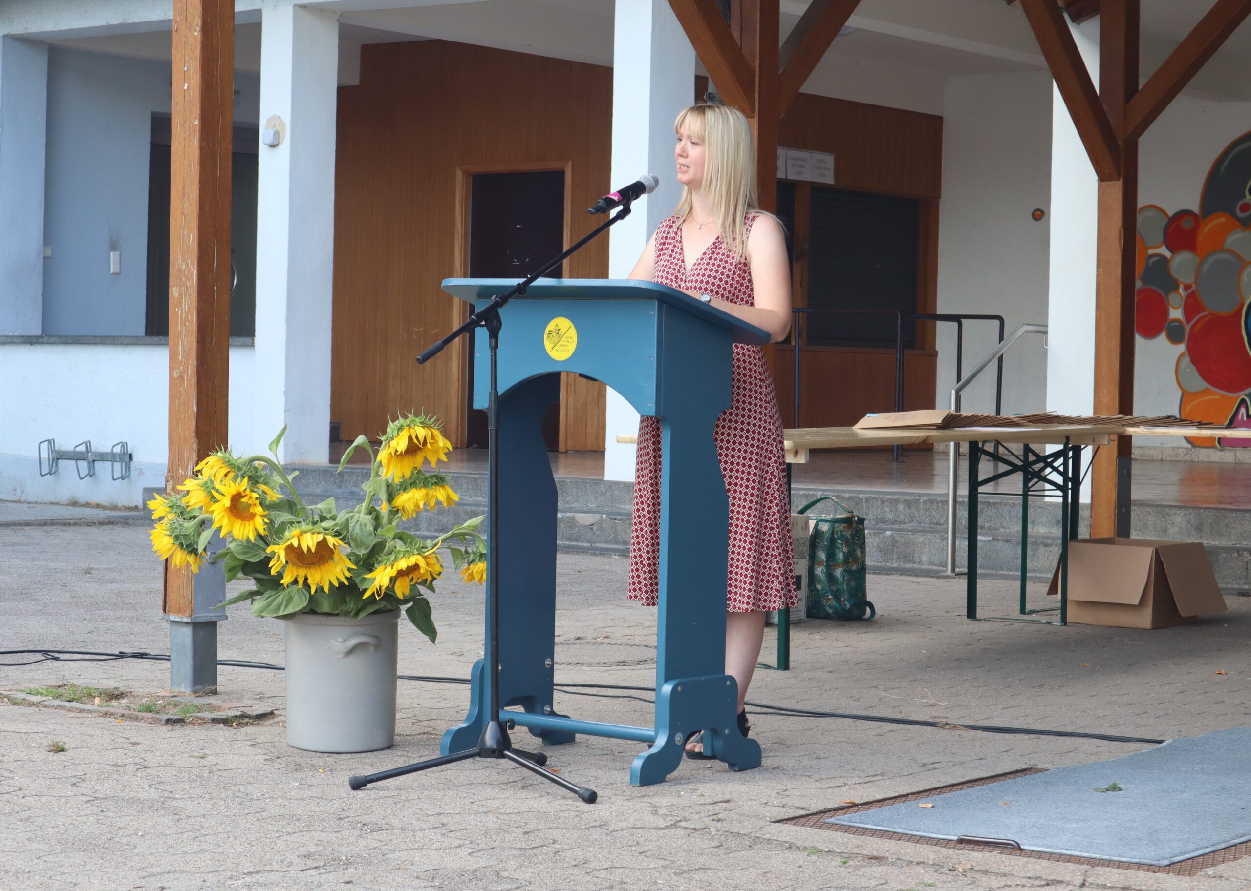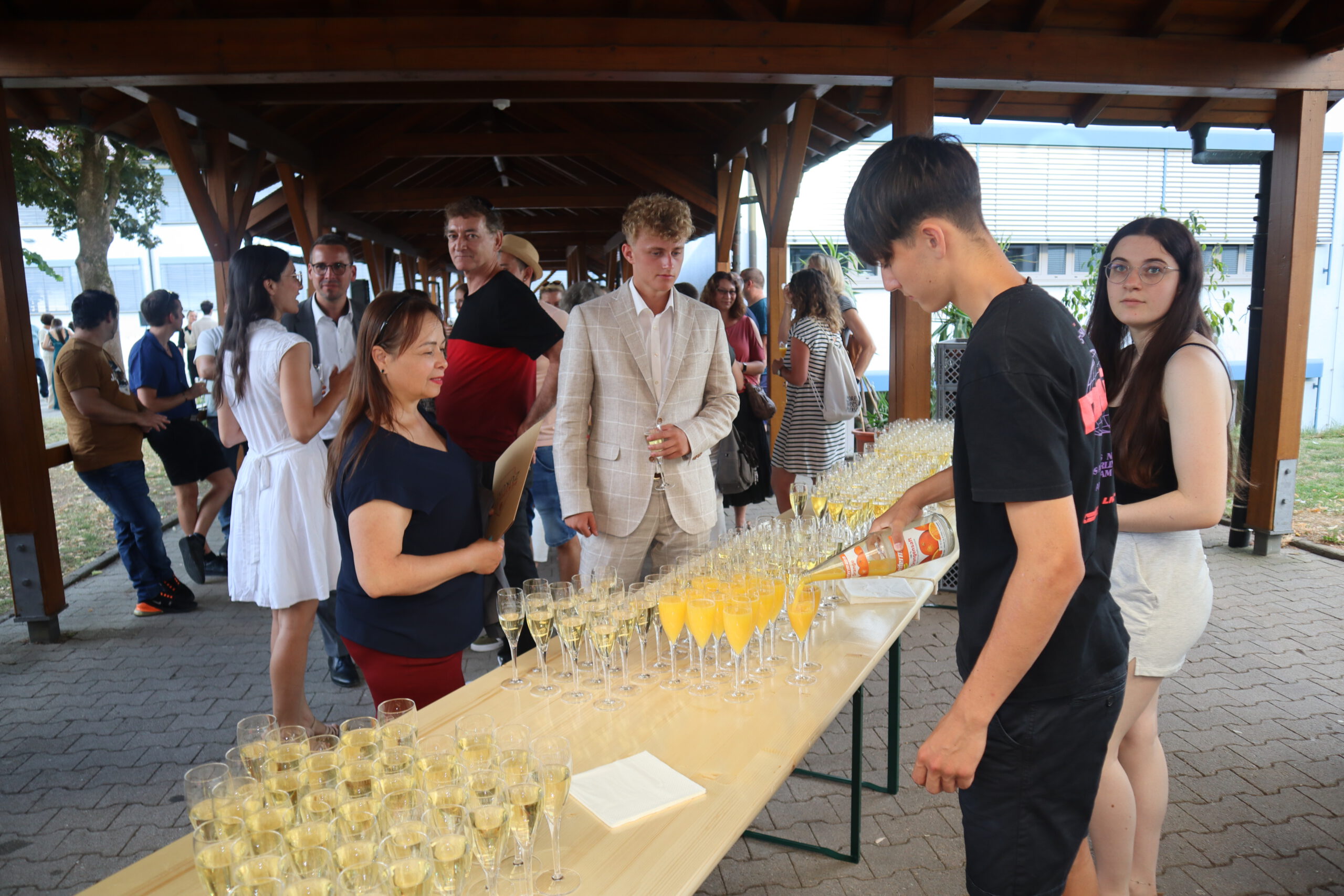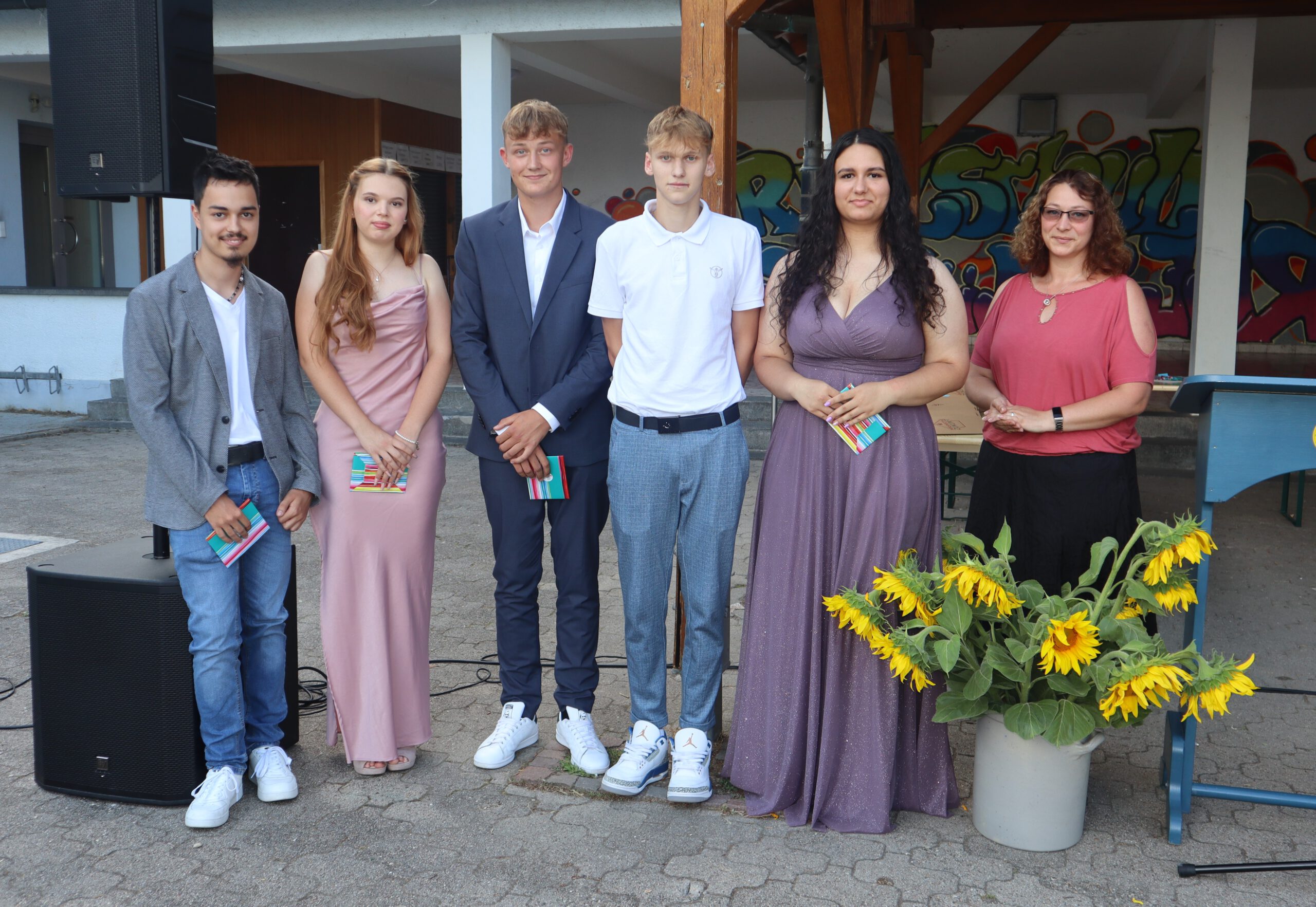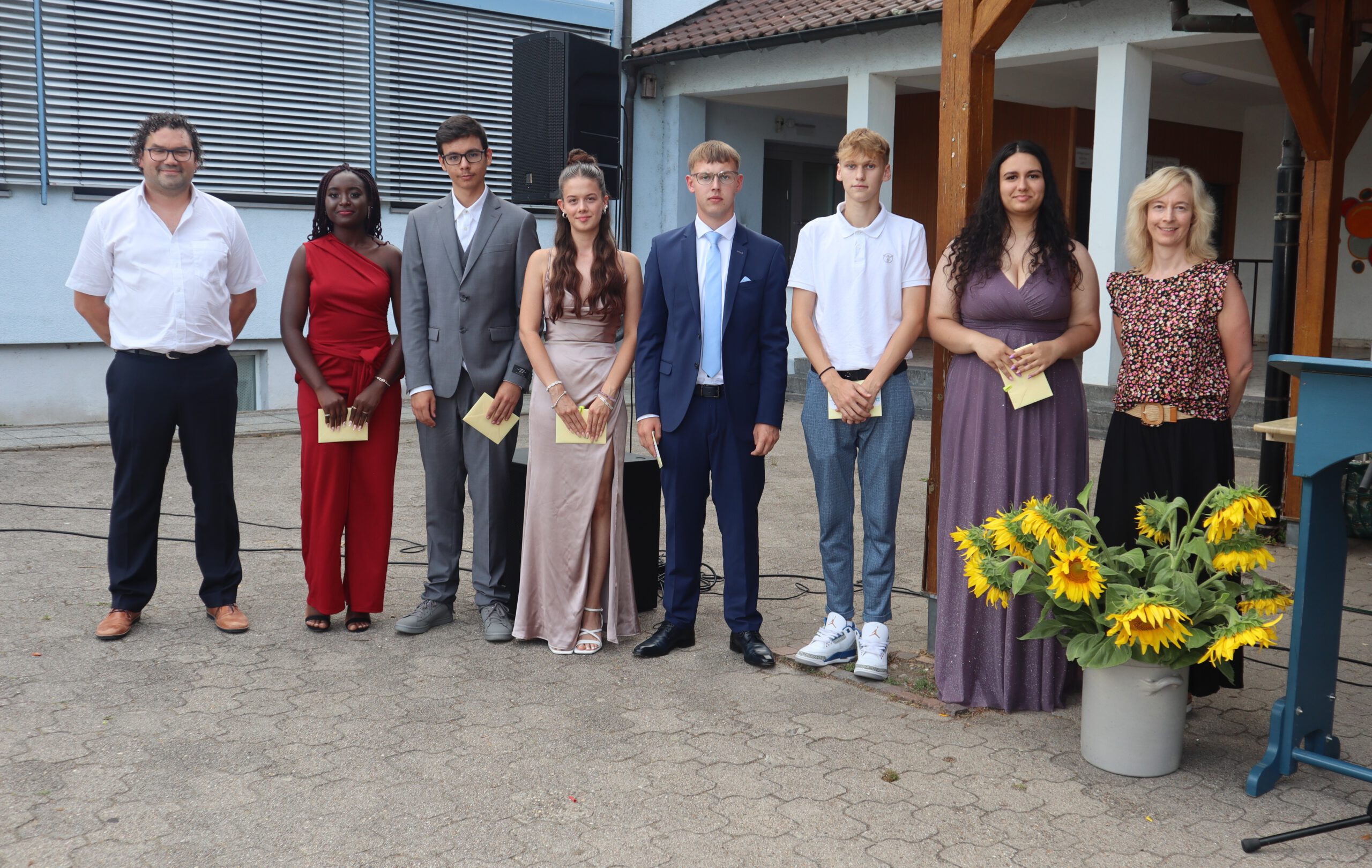 Nach den mit Anekdoten und Erinnerungen gespickten Ansprachen der drei Klassenlehrer Ralf Heiß (10a), Irina Flamm-Vorbach (10b) und Manuel Hauth (10c), erhielten die scheidenden Zehntklässler schließlich die lange ersehnten Abschlusszeugnisse. Die beiden Verbindungslehrer Michaela Bohn-Vogel und Thomas Wertal verabschiedeten Ivona Antonie, die seit diesem Schuljahr Schülersprecherin der Realschule war und ihr Amt mit viel Herzblut und Leidenschaft ausgeführt hat. Außerdem bedankten sie sich bei den Klassensprechern der Abschlussklassen für ihr Engagement für ihre Mitschüler, bevor auch Elternbeiratsvorsitzende Sandra Kautz ans Rednerpult schritt und die Mittlere-Reife-Geprüften zu ihren Schulabschlüssen beglückwünschte und den Elternvertretern der drei zehnten Klassen für ihren Einsatz dankte. Mit Reggae-Rhythmen und dem von Musiklehrer Andreas Nock selbst komponierten Song „Bessere Welt“ wurde der offizielle Teil der Abschlussfeier beschlossen und zum gemütlichen Beisammensein bei Fingerfood und Getränken übergeleitet – gefeiert wurde an diesem lauen Sommerabend noch lang.