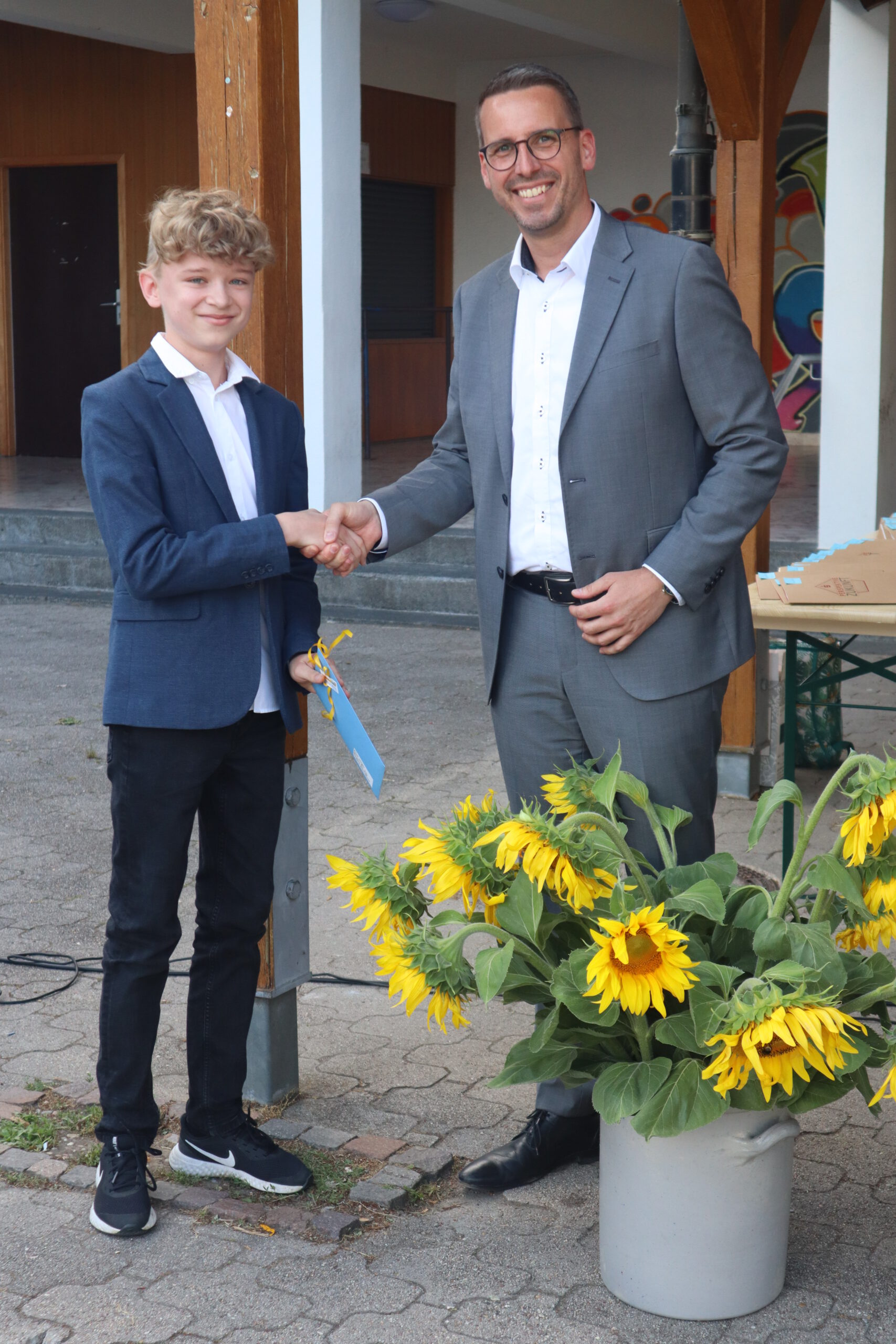 Besondere Anerkennung wurde Elias Jerger zuteil, der seinen Realschulabschluss mit dem Traumschnitt von 1,0 bestanden hat: Er erhielt von Bürgermeister Thomas Lachnicht den Preis der Gemeinde Rheinmünster. Ausgezeichnet wurden außerdem mit dem Preis des Förderkreises für besonderes soziales Engagement die scheidenden Schulsanitäter Ivona Antonie, Leni Brandt, Gloria Lekemo Dombou, Leon Plachner, Joshua Reith und Ilyas Schlömp. Die Leiterin der Schulbibliothek, Monika Kohl-Wald, bedankte sich bei fünf Mitgliedern ihres Bibliotheks-Teams (Yanis Antonie, Sina Beckmann, Gloria Lekemo Dombou, Carla Stoica und Stella Trück) für ihr Engagement.