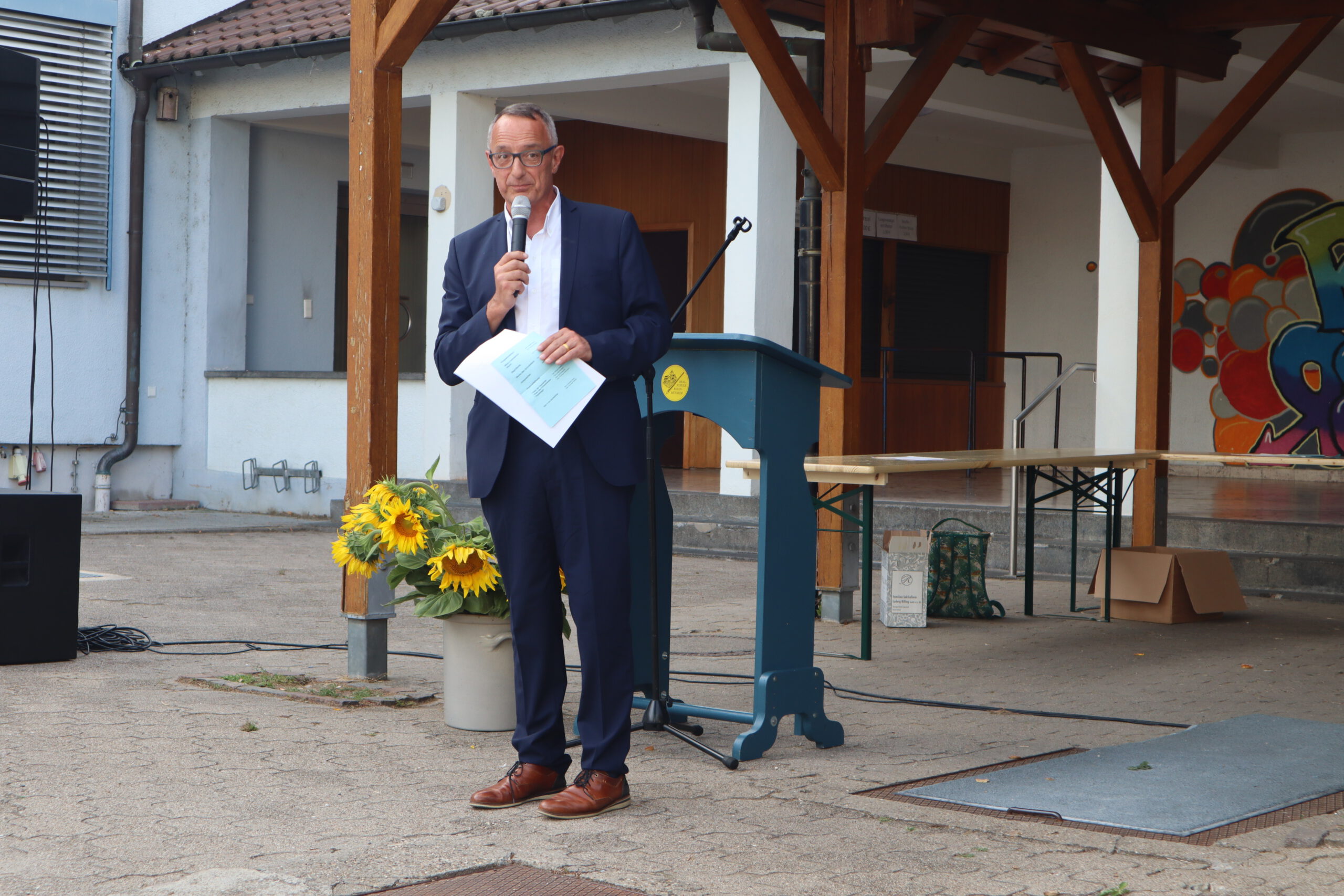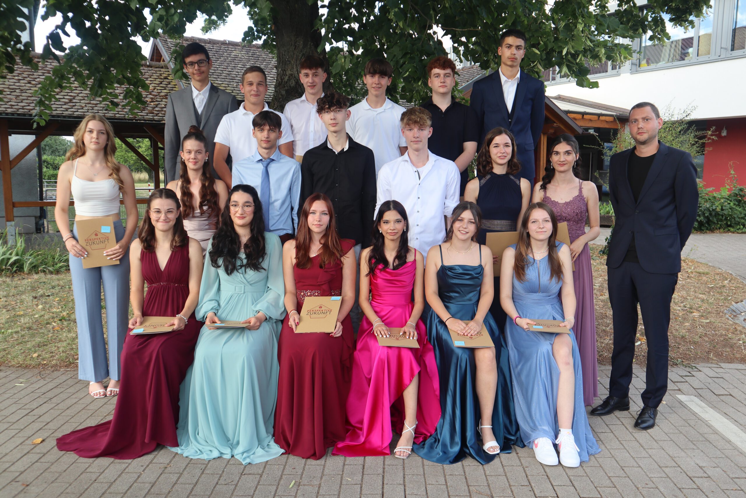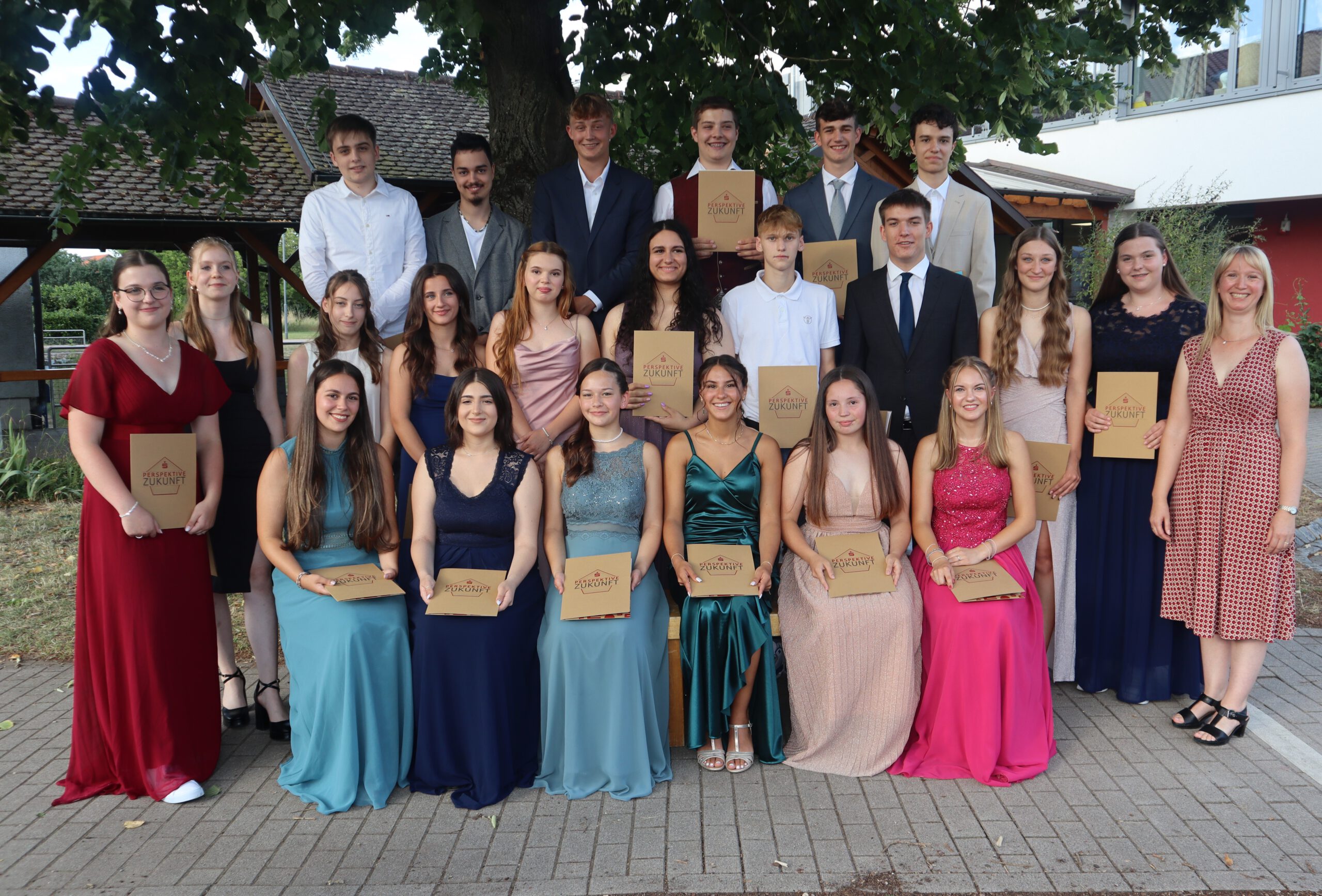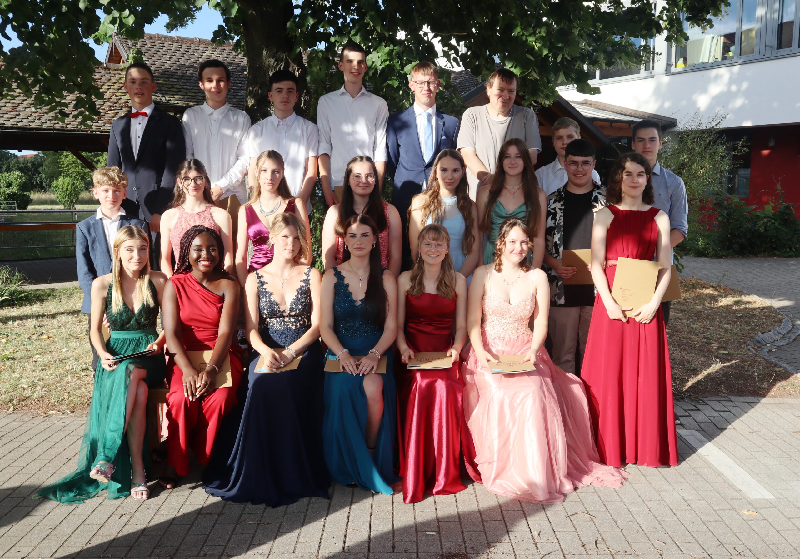Musikalisch eröffnet wurde die Feierstunde von den beiden Musiklehrern Andreas Nock und Thomas Wertal mit „What a wonderful world“. Konrektor Thomas Herrmann hatte die Aufgabe, die 62 Absolventen und ihre Familien sowie zahlreiche Ehrengäste wie Kirchen- und Gemeindevertreter, aber auch ehemalige Grundschullehrerinnen der heutigen Zehntklässler, willkommen zu heißen. Die Schülerinnen Gloria Lekemo Dombou und Ivona Antonie führten die Gäste charmant durch den Abend. „Ihr habt mit eurem Realschulabschluss einen wichtigen Meilenstein in eurem Bildungsweg erreicht und damit ein solides Fundament erarbeitet, das euch viele Zukunftsmöglichkeiten eröffnet“, wandte sich Schulleiter Rolf Schemel direkt an die Schulabgänger und gratulierte zu einem sehr guten Gesamtschnitt von 2,1. Insgesamt wurden 25 Absolventen für einen Gesamtnotendurchschnitt bis 1,9 mit einem Preis ausgezeichnet, weitere 12 erhielten für einen Gesamtschnitt bis 2,2 ein Lob. Sehr erfreut zeigte sich Schemel darüber, dass mit 21 Absolventen ein Drittel des diesjährigen Abschlussjahrganges eine berufliche Ausbildung beginnt und mit 26 Schülern ein gutes weiteres Drittel das Abitur an einem beruflichen Gymnasium anstrebt.