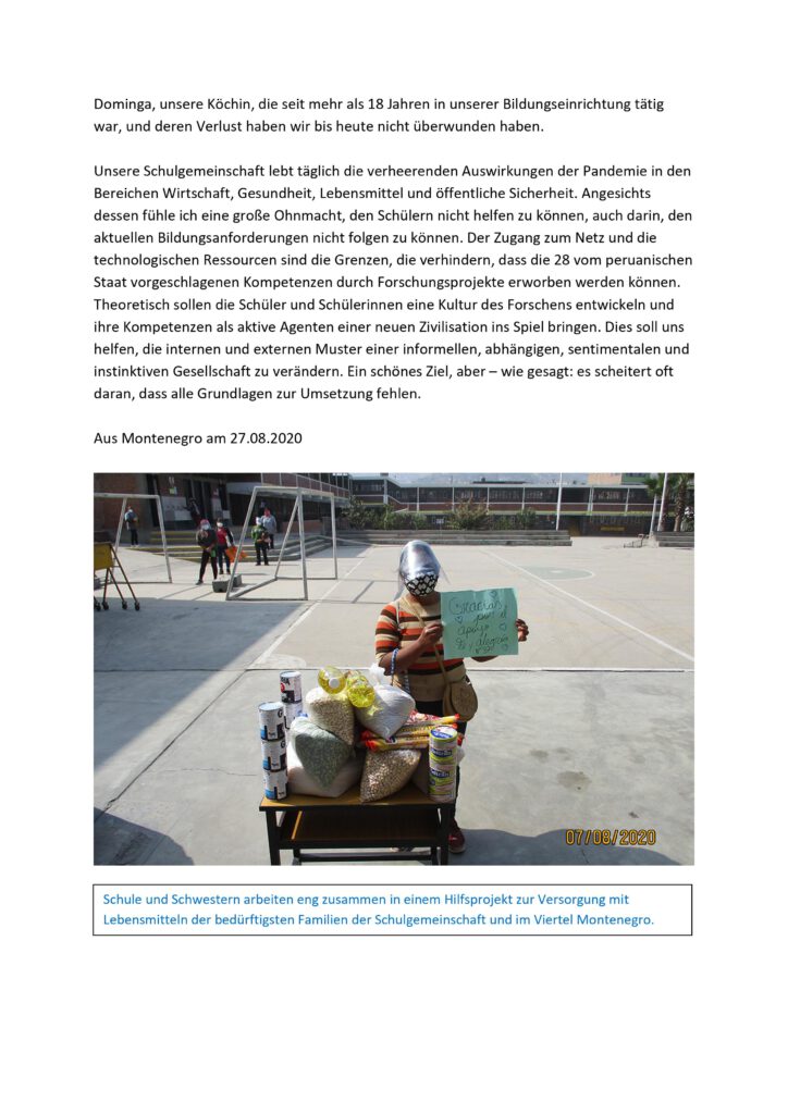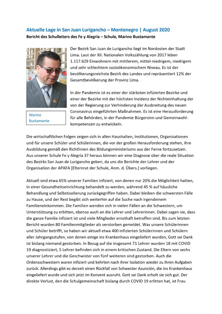 Brief des Schulleiters Marino Bustamante über die aktuelle der Corona Pandemie an unserer Partnerschule Fe y Alegría 37 in Lima