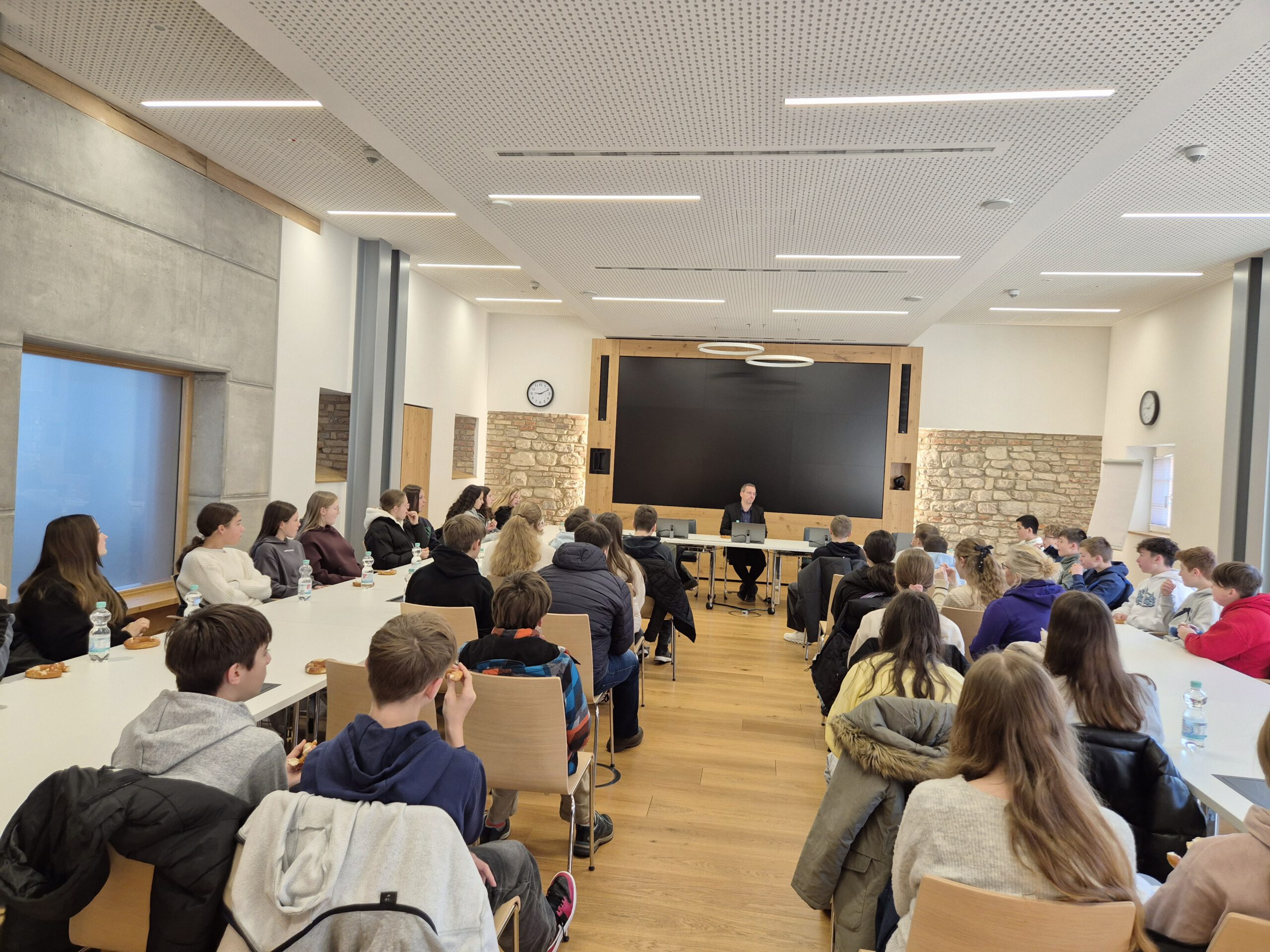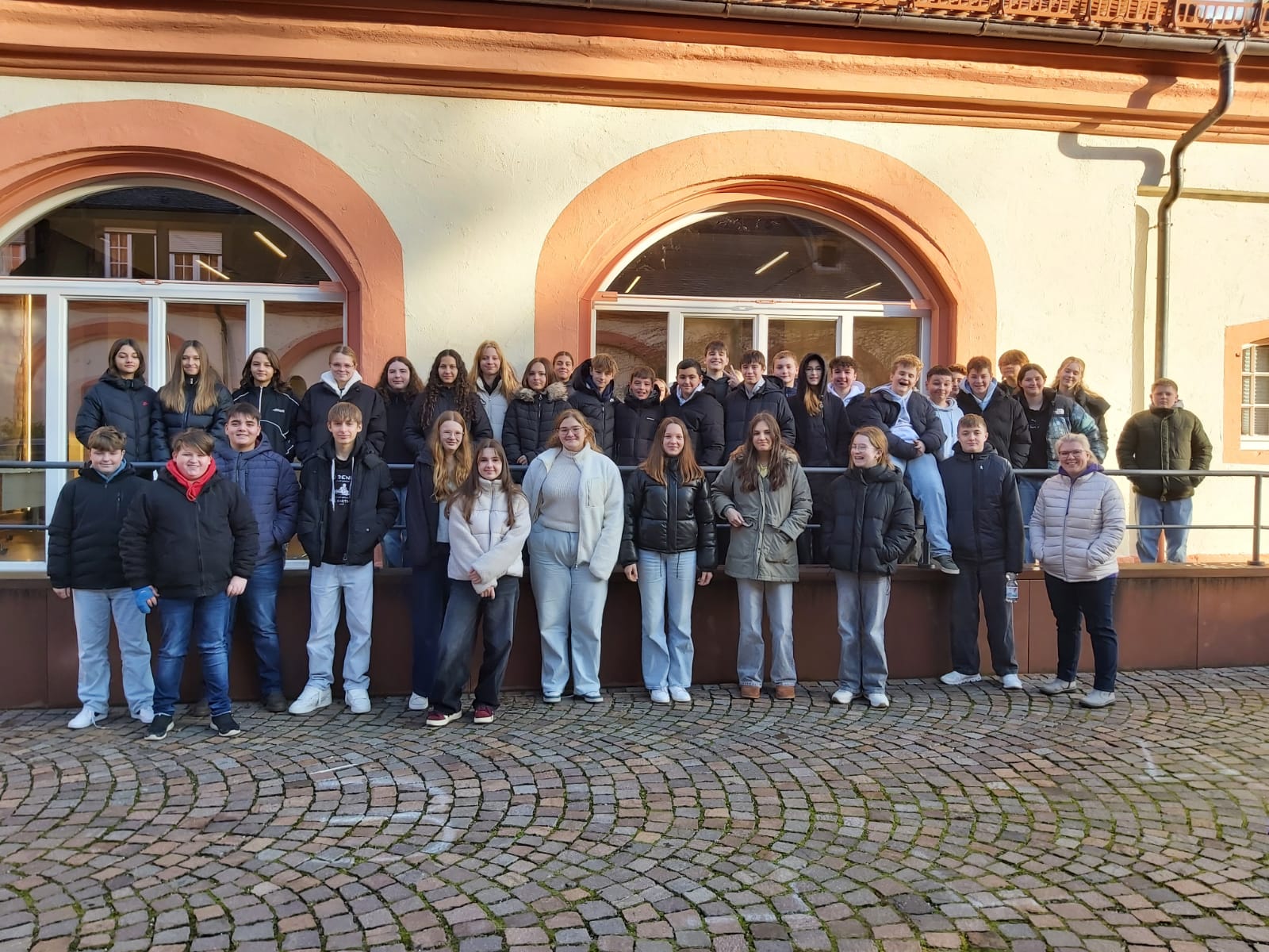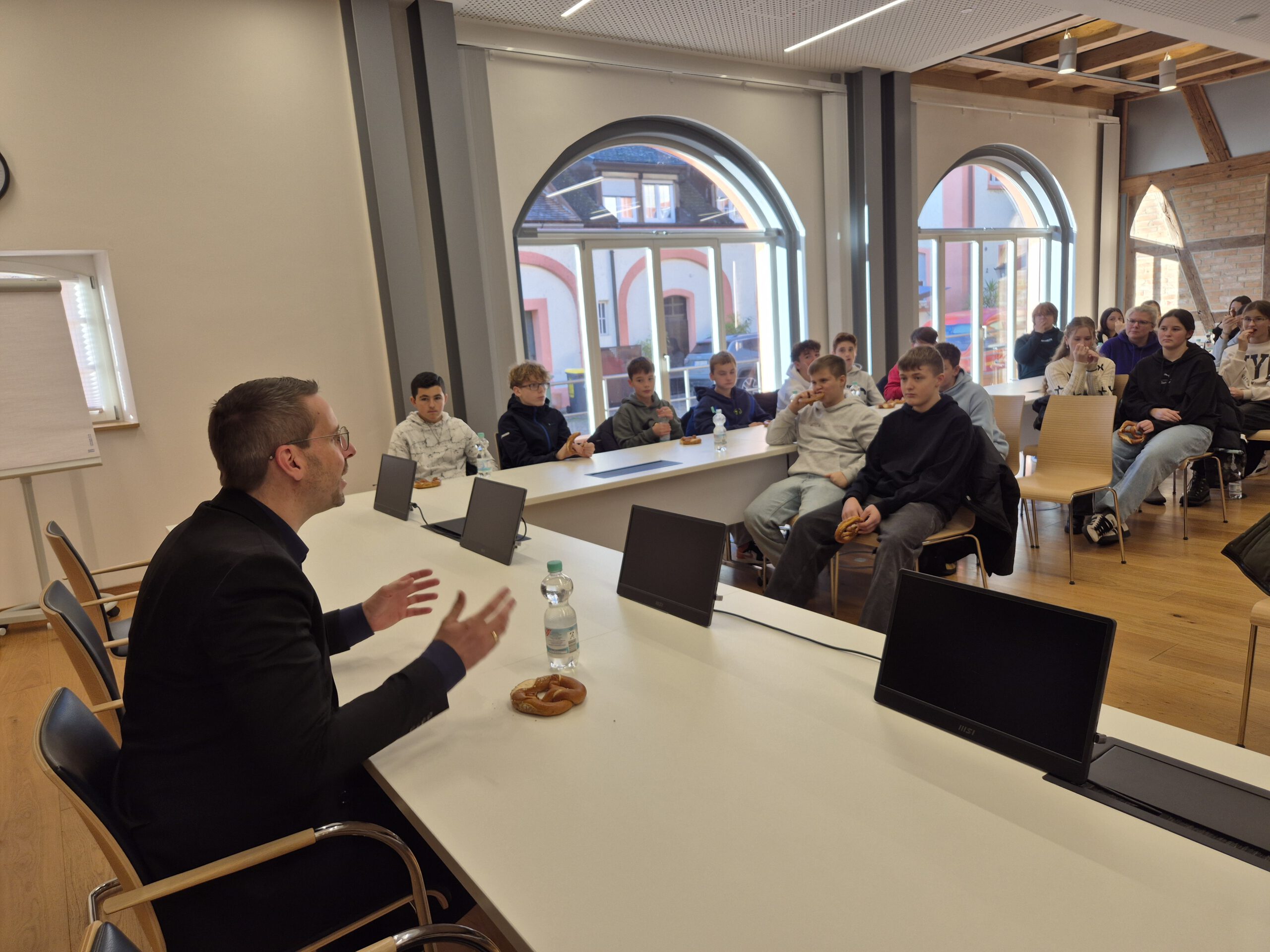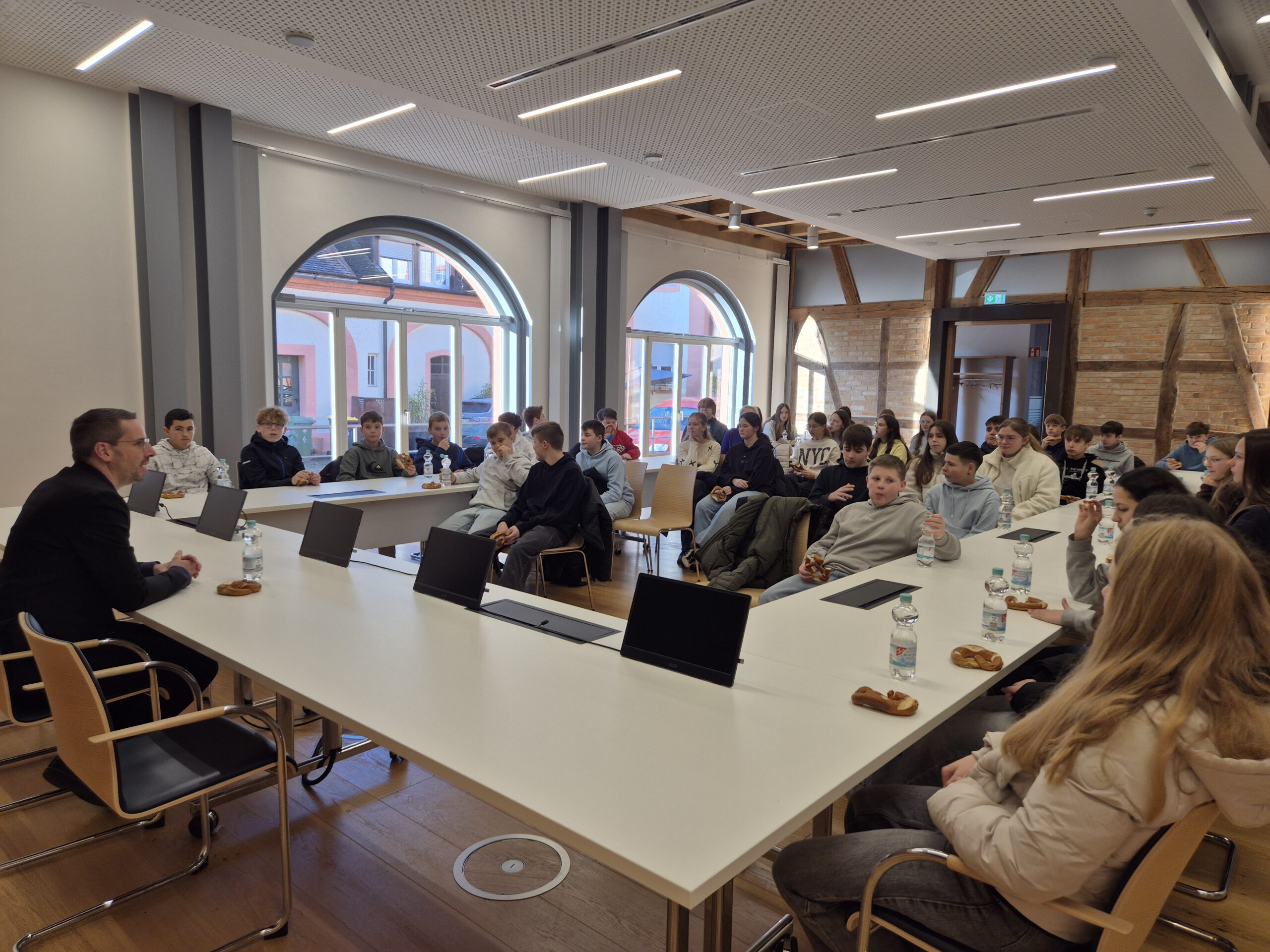 Am 1. Dezember besuchten die Klassen 8a und 8b im Rahmen des GK-Unterrichts den Bürgermeister von Rheinmünster, Herrn Thomas Lachnicht, im Rathaus in Schwarzach. Zu Beginn begrüßte Herr Lachnicht uns herzlich und gab einen kurzen Überblick über seine Aufgaben als Bürgermeister sowie über die Arbeitsweise der Gemeindeverwaltung. Im Sitzungssaal, in dem sonst der Gemeinderat tagt, beantwortete er die vielen Fragen, die wir zuvor im Gemeinschaftskundeunterricht mit Frau Edenborn vorbereitet hatten. Wir erfuhren, warum Herr Lachnicht Bürgermeister, und warum genau in Rheinmünster, werden wollte, was er an seinem Amt besonders mag, was er aber auch als schwierig empfindet und vieles mehr. Wir haben uns noch einmal die Arbeit des Gemeinderates und dessen Wichtigkeit erklären lassen. Auch unsere Schule spielt in Gemeinderatssitzungen immer wieder eine Rolle, zum Beispiel wenn es um eine mögliche Sanierung unserer Technikräume geht.