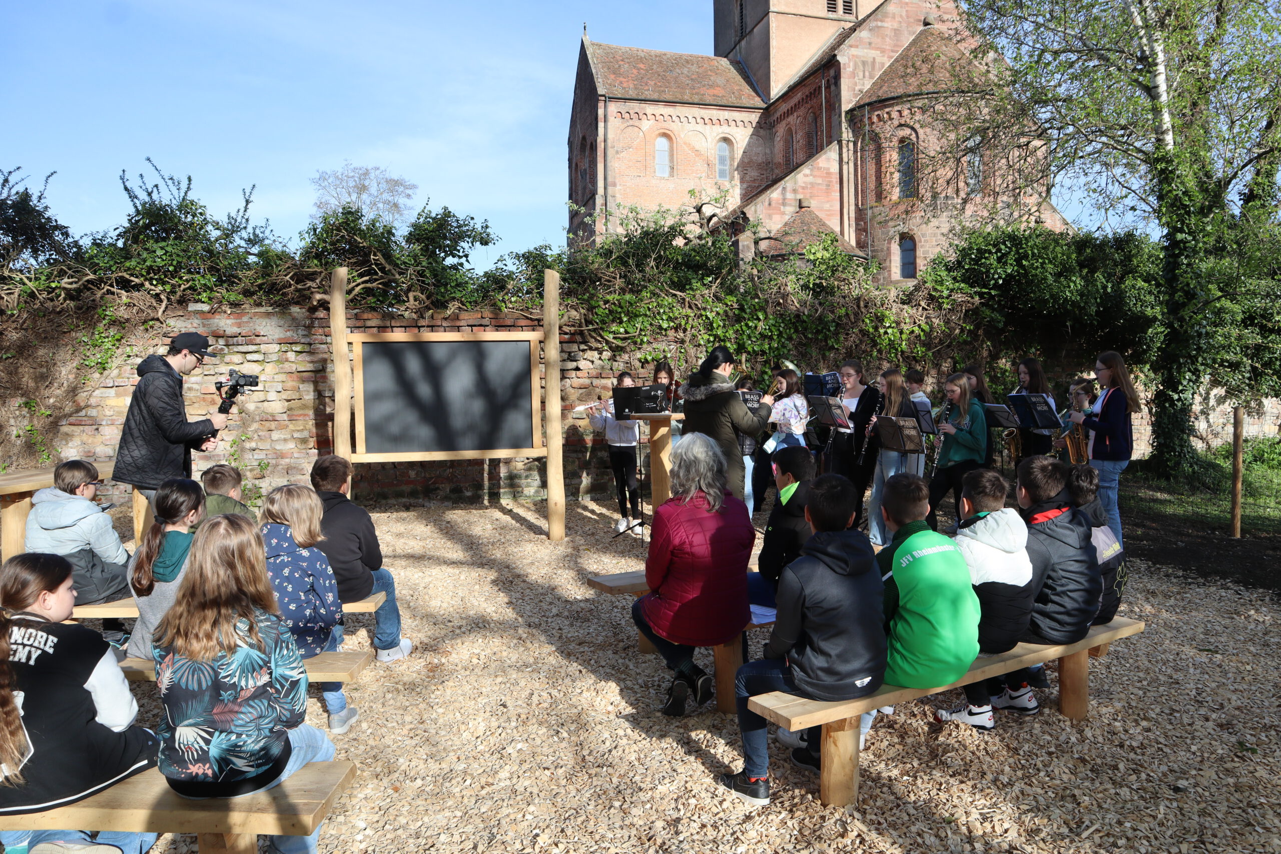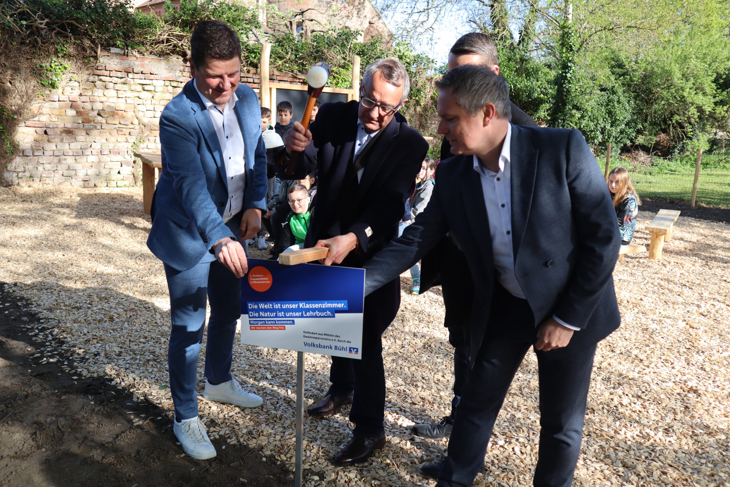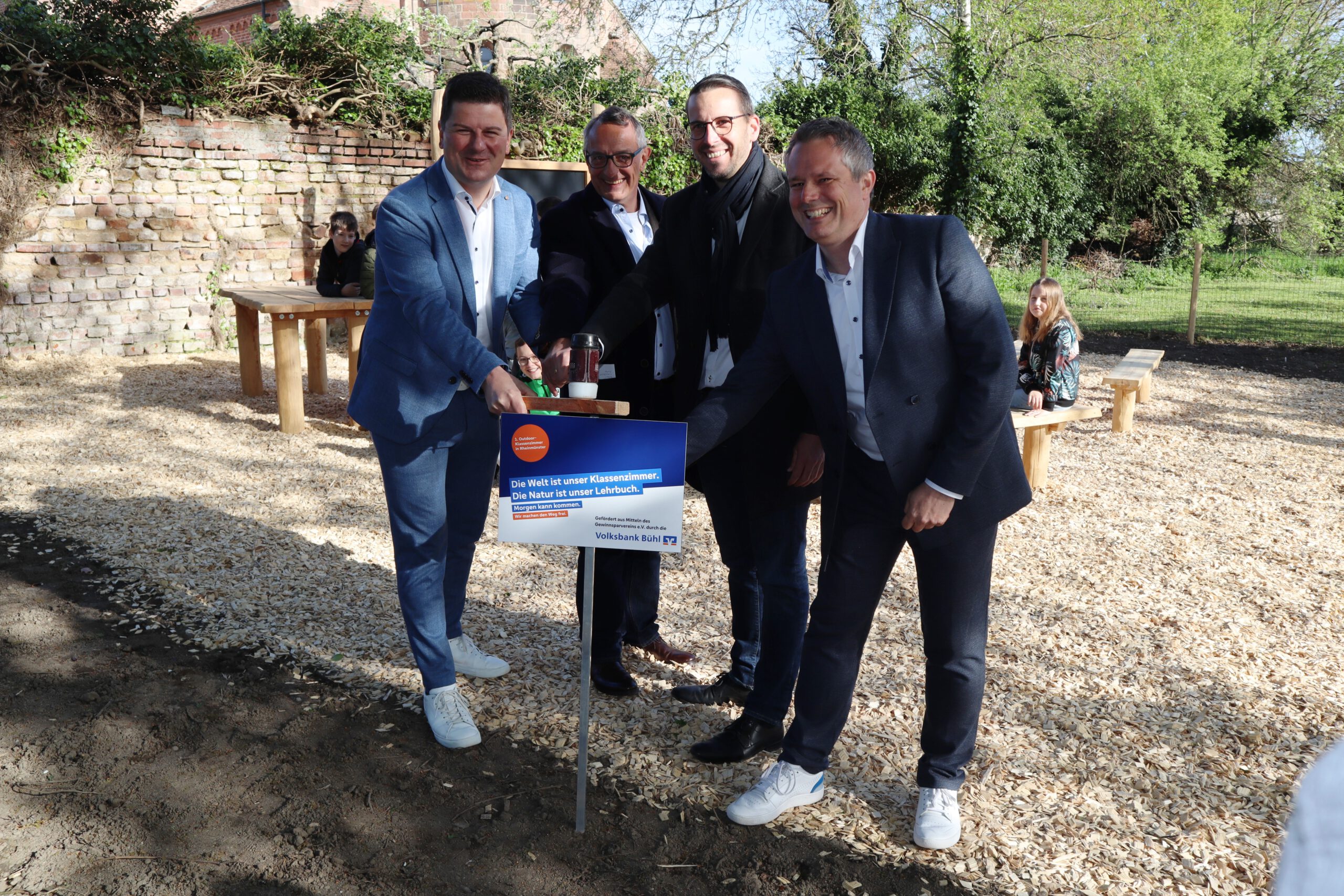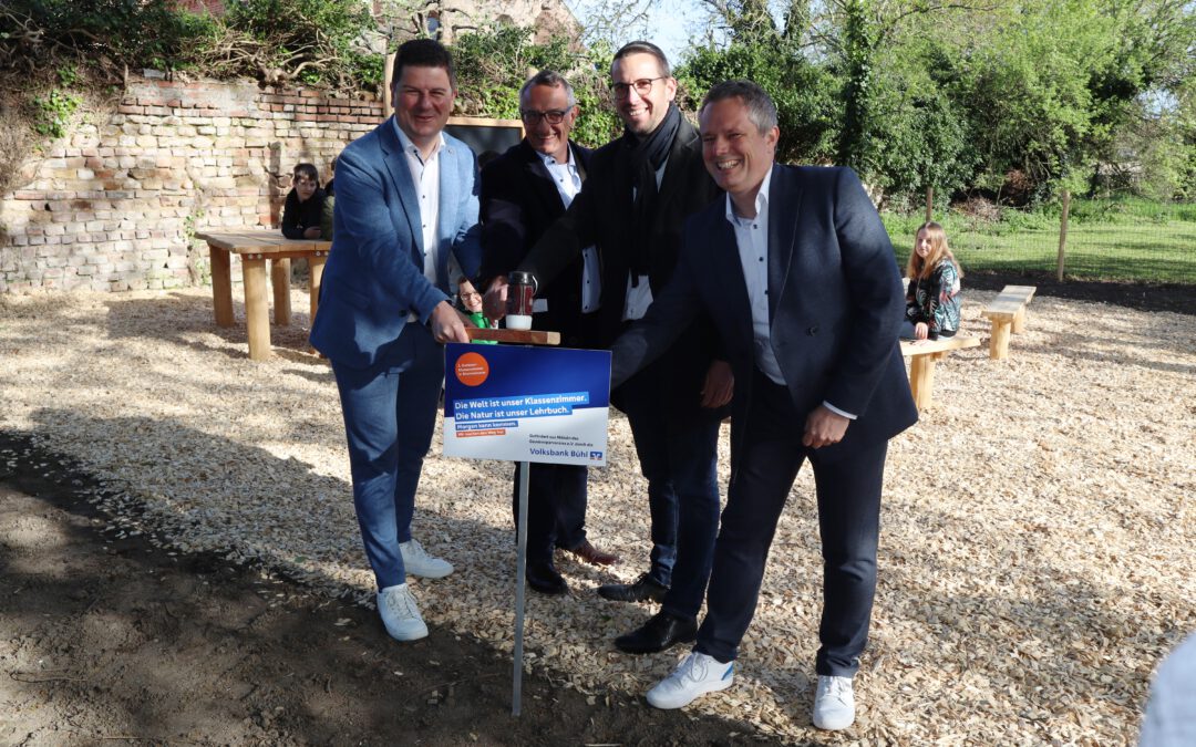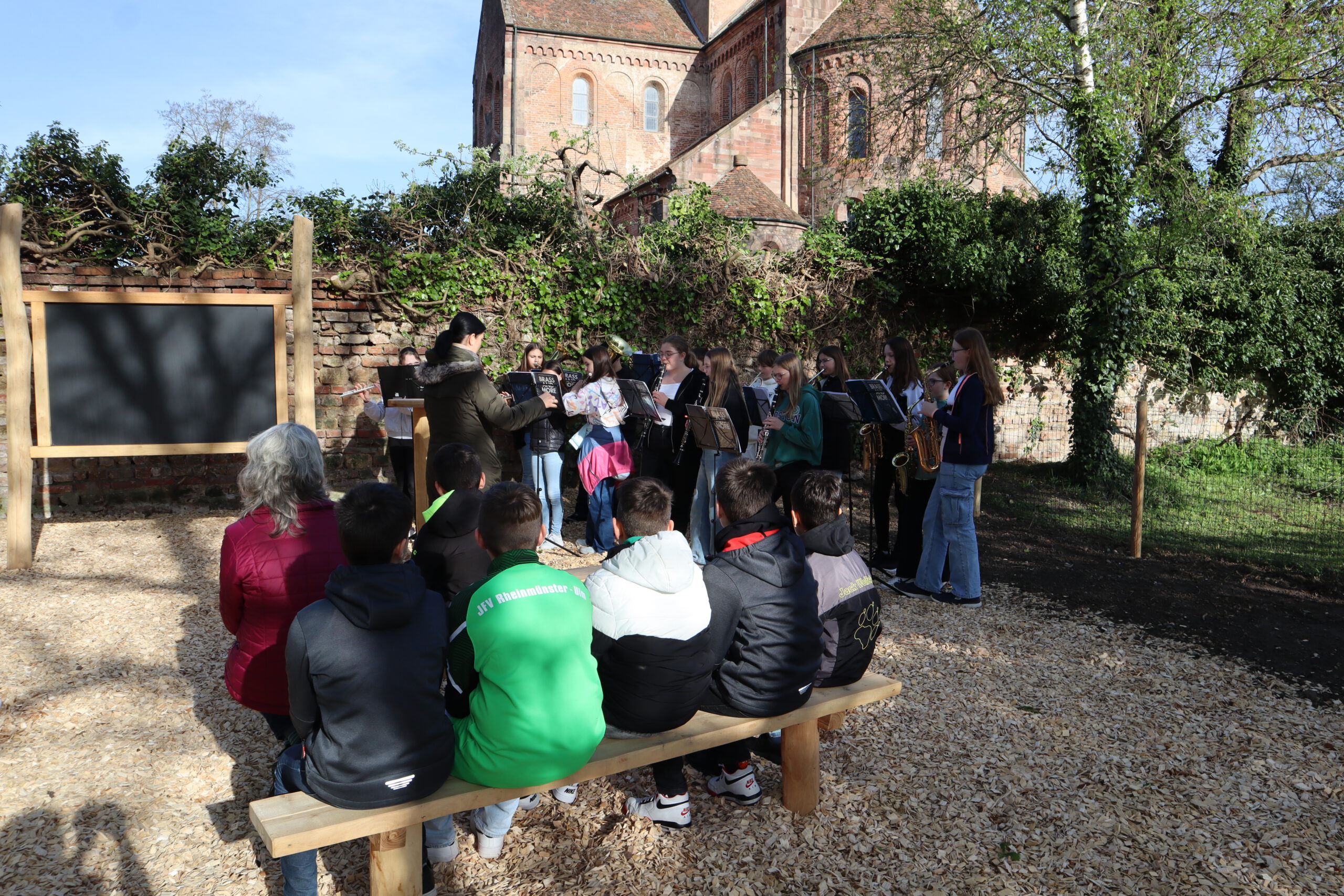 Am Mittwochmorgen kamen Hans-Jörg Meier, Andreas Berthel, Lisa Schulz und Stefanie Karcher von der Volksbank Bühl an die Realschule Rheinmünster, um das gerade fertiggestellte Freiluft-Klassenzimmer im Klostergarten feierlich an die Schüler und Lehrer der Schule zu übergeben. Begrüßt wurden sie musikalisch von der Bläserklasse 6b unter der Leitung von Cindy Huck. Rektor Rolf Schemel brachte in seiner Ansprache seine Freude darüber zum Ausdruck, nun einen solch besonderen Lernort Teil seiner Schule nennen zu können: Sechs Bänke, ein Pult, ein großer Tisch und auch eine Tafel waren in den vergangenen Tagen vom Bauhof Rheinmünster aufgebaut worden und Schemel ist sich sicher, dass der idyllische Ort an der Klostermauer, wo das Outdoor-Klassenzimmer seinen Platz gefunden hat, beim Kollegium und der Schülerschaft großen Anklang finden wird. Hans-Jörg Meier, Vorstandsmitglied der Volksbank Bühl, sprach angesichts der heutigen Feierstunde von einem „Highlight“ in seinem Terminkalender und berichtete, wie die Volksbank im vergangenen Jahr auf die Realschule zugegangen sei und die Idee zu einem Freiluft-Klassenzimmer vorgestellt hatte. Bei Rektor Rolf Schemel war das Vorhaben sofort auf Begeisterung gestoßen und so sei man Hand in Hand mit Bürgermeister Thomas Lachnicht und Bauhofleiter Ralf Brombacher die Planung und Umsetzung angegangen. Bürgermeister Lachnicht sprach von einer „inspirierenden Lernumgebung“ nicht nur für kreative Fächer wie Bildende Kunst und bedankte sich bei der Volksbank Bühl für die Finanzierung der Ausstattung und bei Bauhofleiter Ralf Brombacher für die ca. hundert geleisteten Arbeitsstunden, die nötig waren, damit der Schulunterricht hier nun zum besonderen Lernerlebnis werden kann.