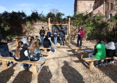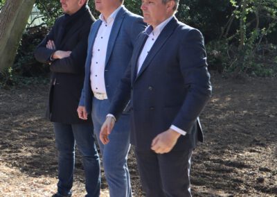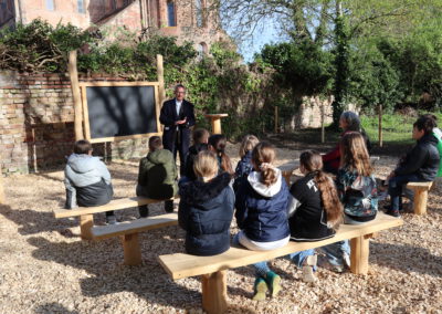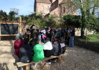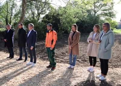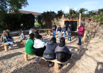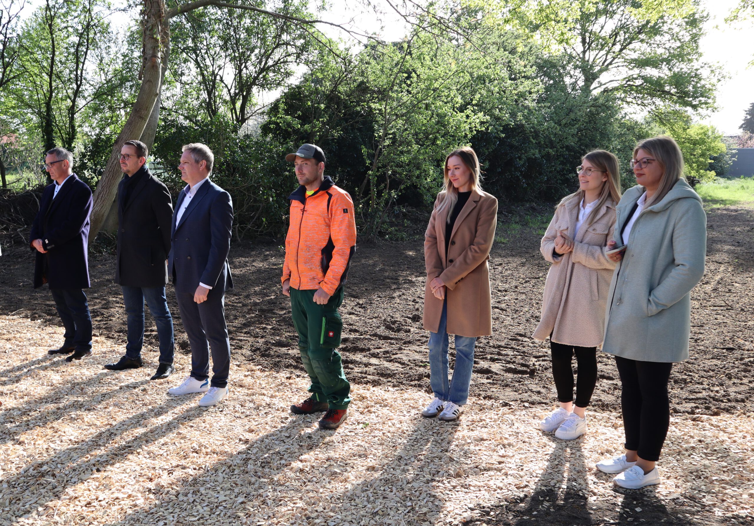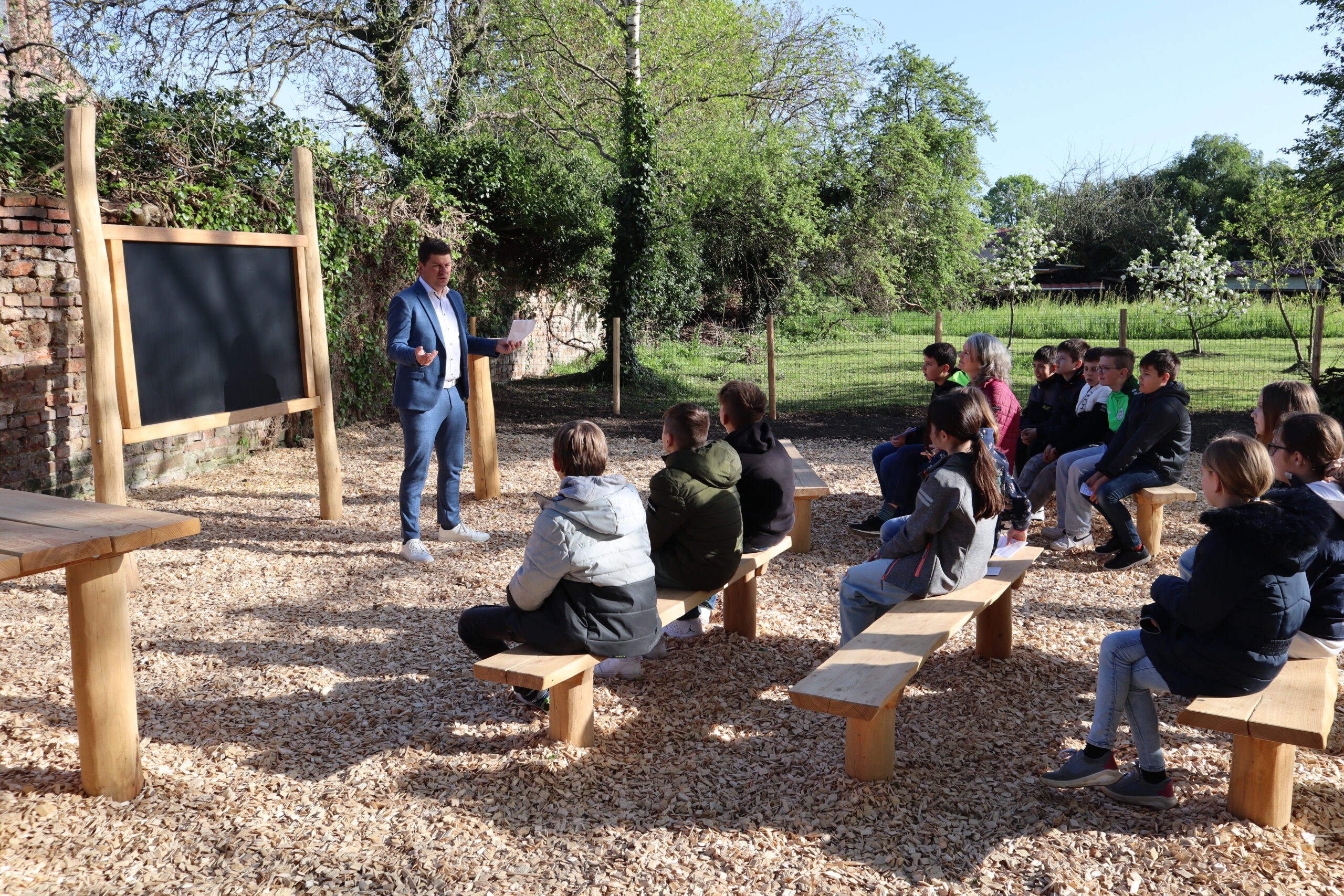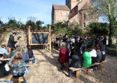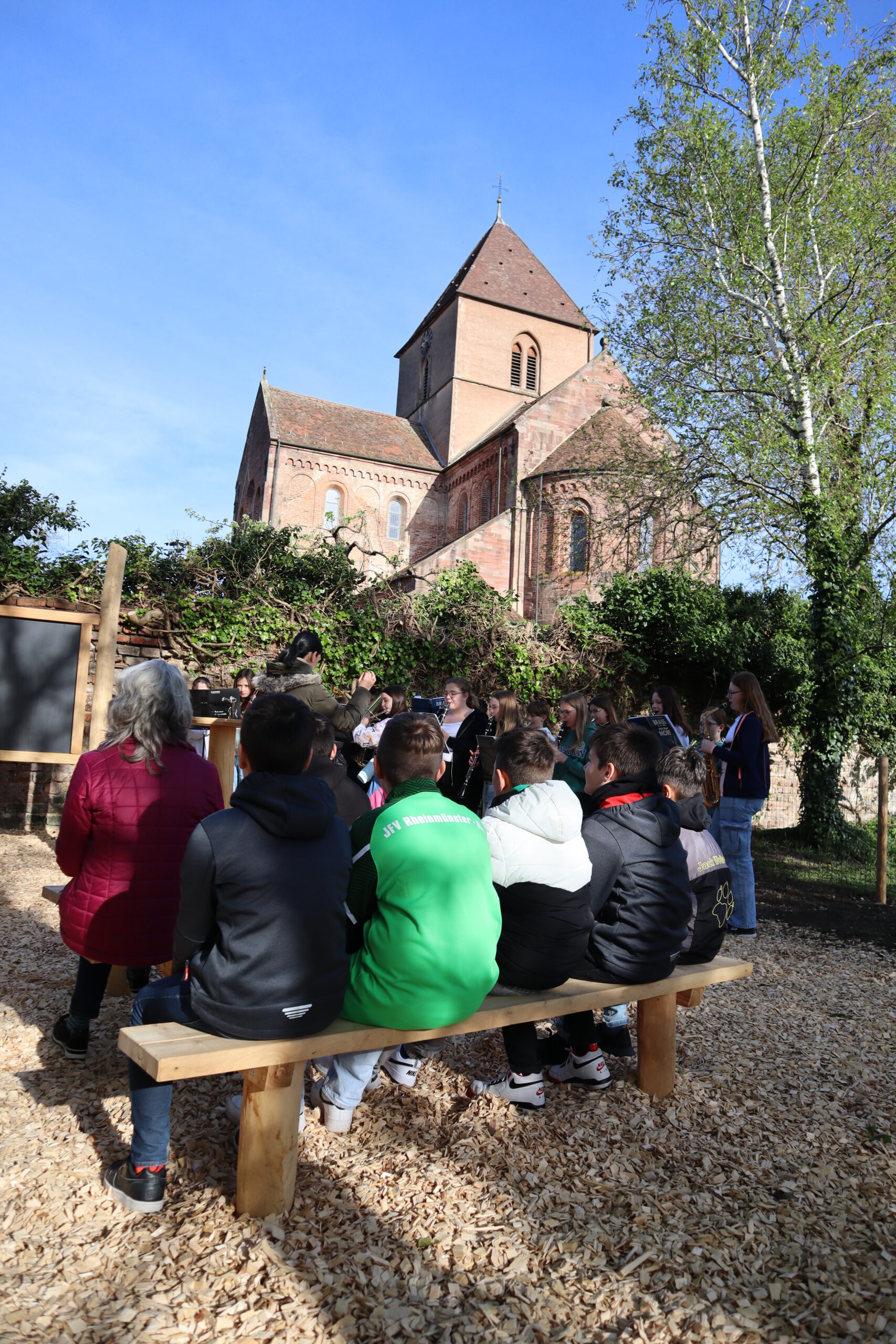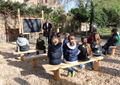 Am Mittwochmorgen kamen Hans-Jörg Meier, Andreas Berthel, Lisa Schulz und Stefanie Karcher von der Volksbank Bühl an die Realschule Rheinmünster, um das gerade fertiggestellte Freiluft-Klassenzimmer im Klostergarten feierlich an die Schüler und Lehrer der Schule zu übergeben. Begrüßt wurden sie musikalisch von der Bläserklasse 6b unter der Leitung von Cindy Huck. Rektor Rolf Schemel brachte in seiner Ansprache seine Freude darüber zum Ausdruck, nun einen solch besonderen Lernort Teil seiner Schule nennen zu können: Sechs Bänke, ein Pult, ein großer Tisch und auch eine Tafel waren in den vergangenen Tagen vom Bauhof Rheinmünster aufgebaut worden und Schemel ist sich sicher, dass der idyllische Ort an der Klostermauer, wo das Outdoor-Klassenzimmer seinen Platz gefunden hat, beim Kollegium und der Schülerschaft großen Anklang finden wird. Hans-Jörg Meier, Vorstandsmitglied der Volksbank Bühl, sprach angesichts der heutigen Feierstunde von einem „Highlight“ in seinem Terminkalender und berichtete, wie die Volksbank im vergangenen Jahr auf die Realschule zugegangen sei und die Idee zu einem Freiluft-Klassenzimmer vorgestellt hatte. Bei Rektor Rolf Schemel war das Vorhaben sofort auf Begeisterung gestoßen und so sei man Hand in Hand mit Bürgermeister Thomas Lachnicht und Bauhofleiter Ralf Brombacher die Planung und Umsetzung angegangen. Bürgermeister Lachnicht sprach von einer „inspirierenden Lernumgebung“ nicht nur für kreative Fächer wie Bildende Kunst und bedankte sich bei der Volksbank Bühl für die Finanzierung der Ausstattung und bei Bauhofleiter Ralf Brombacher für die ca. hundert geleisteten Arbeitsstunden, die nötig waren, damit der Schulunterricht hier nun zum besonderen Lernerlebnis werden kann.