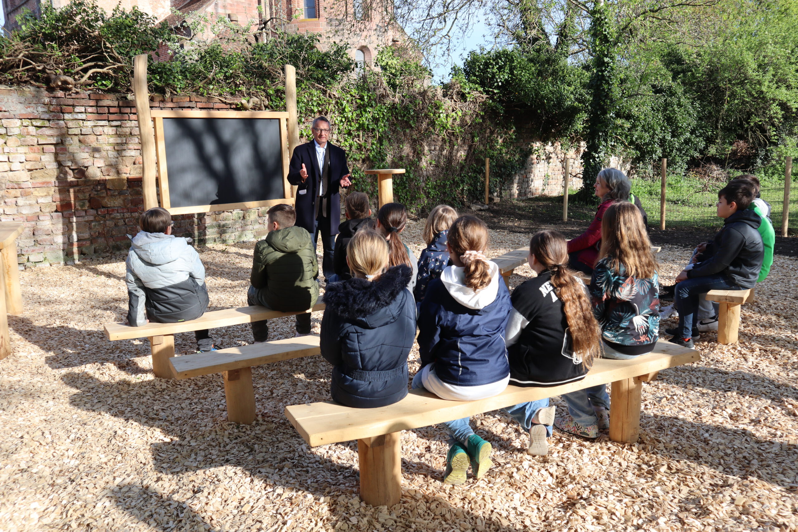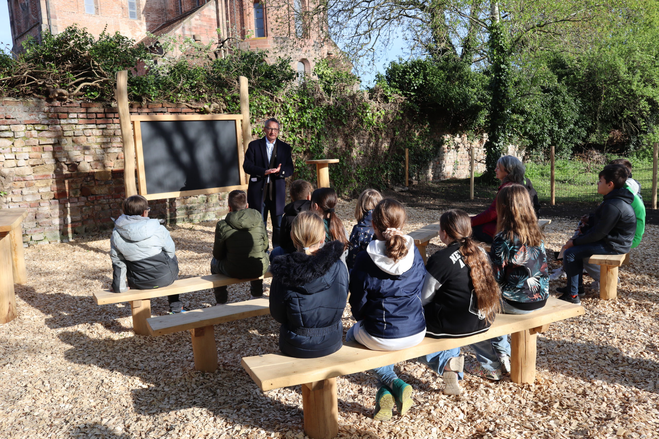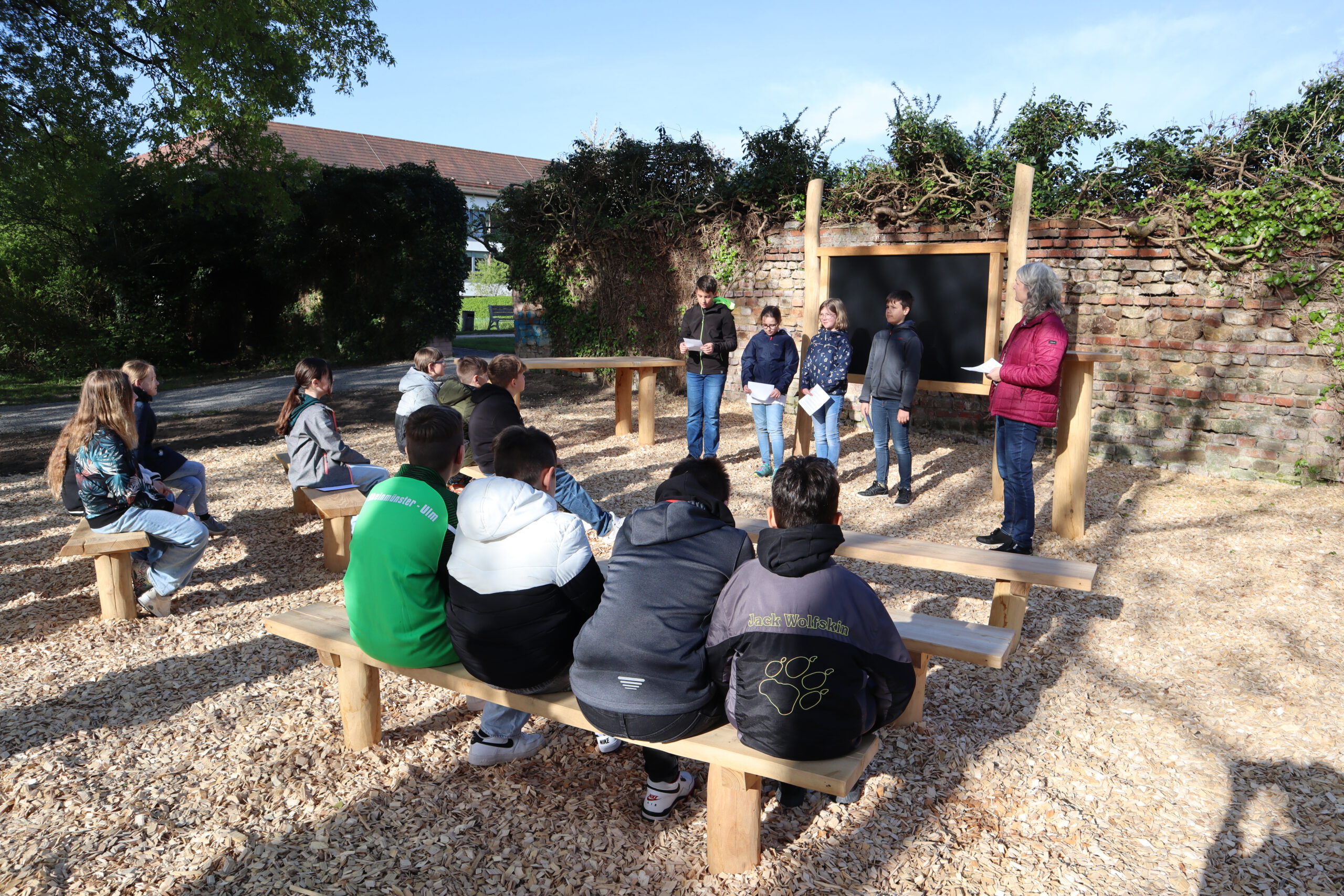 Die Temperaturen werden angenehmer, die Sonne lacht vom Himmel und die Vögel zwitschern – wer will es den Schülern da verdenken, wenn sie sich an einem langen Schulmorgen hinaus aus dem stickigen Klassenzimmer, hinein ins Grüne und an die frische Luft träumen. Unterricht und Naturerlebnis – beides sind jetzt an der Realschule Rheinmünster keine unvereinbaren Gegensätze mehr: Seit heute kann der Unterricht auch „open air“ stattfinden, und zwar im neuen Outdoor-Klassenzimmer im Schatten einer großen Eiche und mit Blick auf das Schwarzacher Münster.