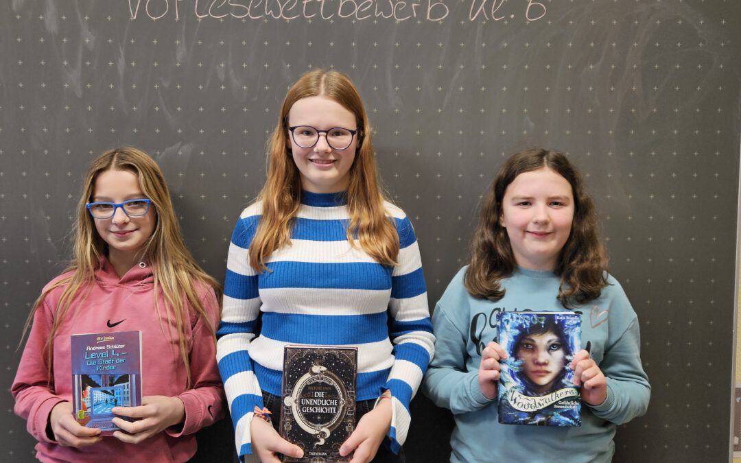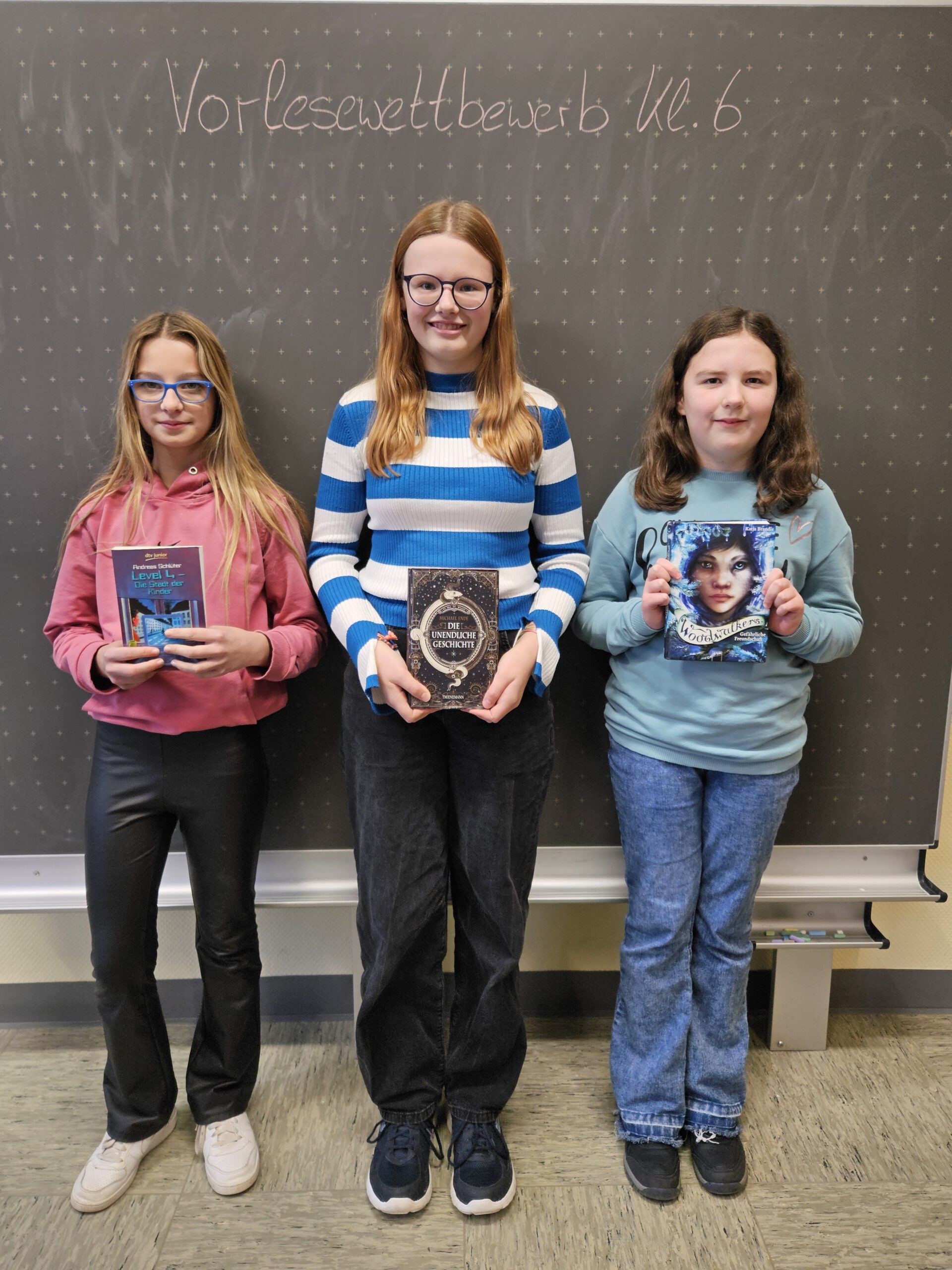 Auch in diesem Jahr nahmen alle 6. Klassen unserer Schule wieder am Vorlesewettbewerb des Börsenvereins des Deutschen Buchhandels teil. Zunächst suchte sich jede Schülerin und jeder Schüler ein Buch aus, aus dem innerhalb der Klasse eine ca. 3-minütige Textstelle vorgelesen wurde. Die Jury bestand aus den eigenen Klassenkameraden und der Deutschlehrerin. In einem Stechen wurde dann der Klassensieger mithilfe eines unbekannten Textes ermittelt, den die Besten der Klasse möglichst fehlerfrei und betont vorlasen. Dabei gewannen in der Klasse 6a Lena Pommer, in der Klasse 6b Emma Heidt und in der Klasse 6c Talya von der Hülst. Am Dienstag, 28.11. ermittelten die drei Deutschlehrerinnen Ilse Broß, Ilona Israel und Cindy Huck dann gemeinsam die diesjährige Schulsiegerin. Hierbei traten die drei Klassensiegerinnen nochmals gegeneinander an und lasen ihre vorbereitete Textstelle sowie einen unbekannten Text vor.