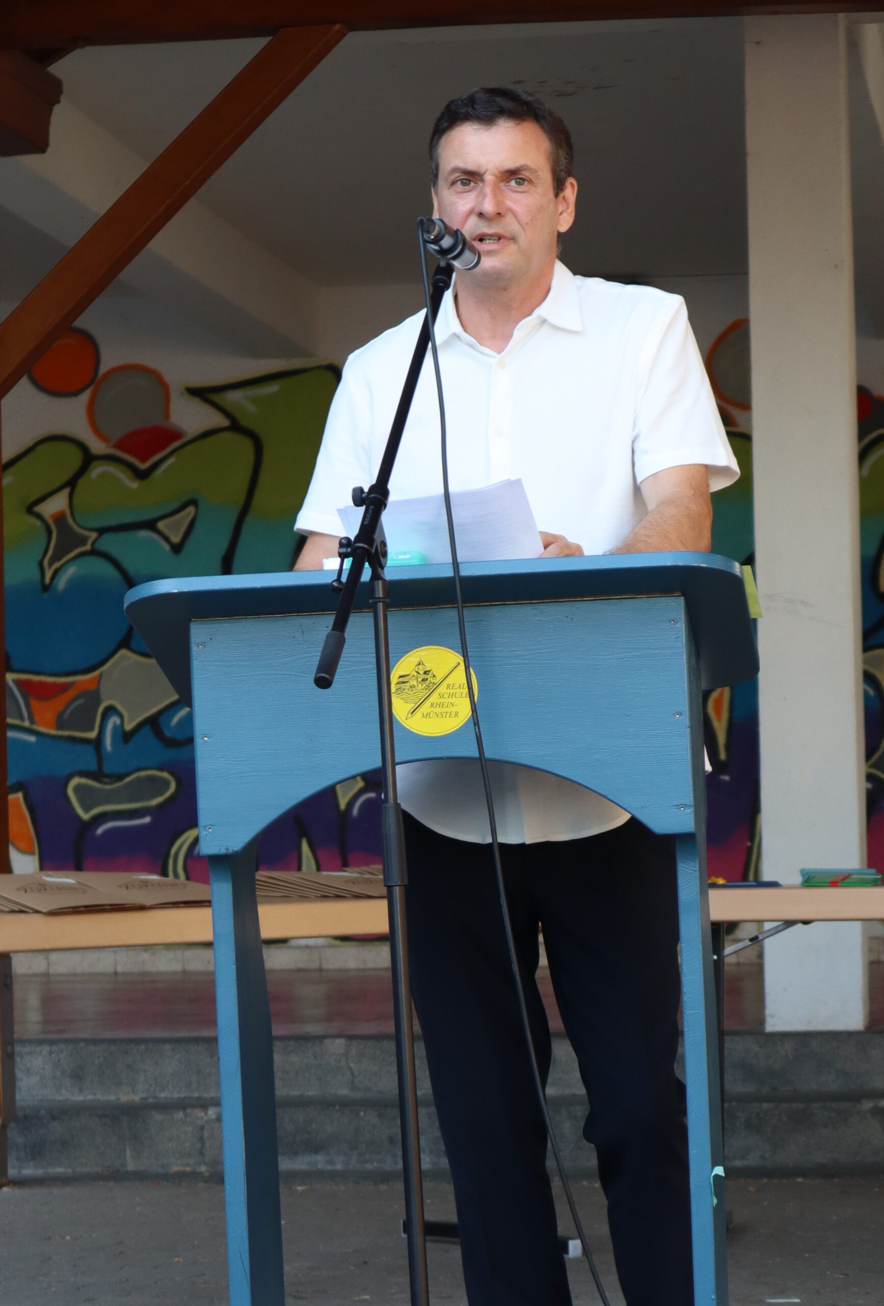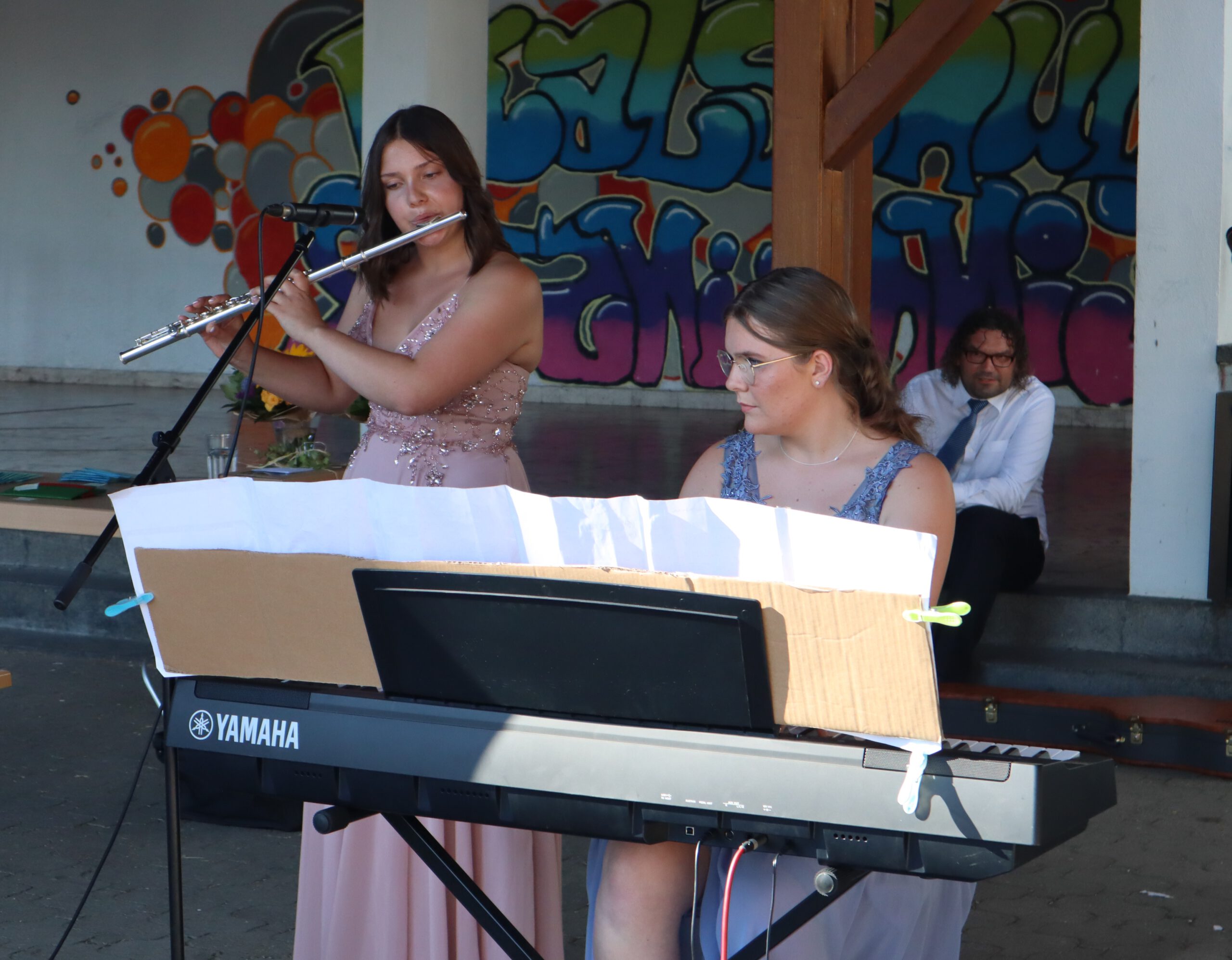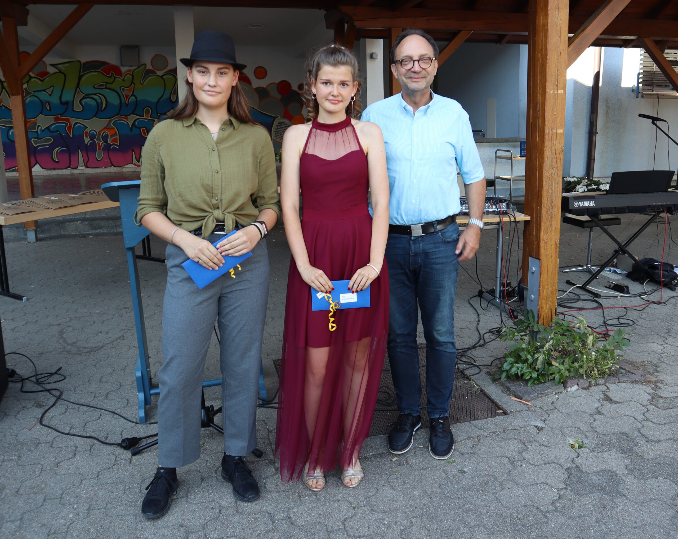 „Open Air“ im Schulhof: Bei strahlendem Sonnenschein und sommerlichen Temperaturen verabschiedete die Realschule Rheinmünster am Freitagabend 50 Absolventen des diesjährigen Mittlere-Reife-Jahrgangs sowie sieben weitere Schülerinnen und Schüler, die ihren Hauptschulabschluss nach Klassenstufe 9 erworben haben. Der Feierstunde vorausgegangen war ein liebevoll gestalteter Festgottesdienst im Schwarzacher Münster, der unter dem Motto „Die Schwingen ausbreiten und frei sein“ stand. Musikalisch eröffnet wurde die Entlassfeier im Schulhof von den beiden Absolventinnen Celina Maier am Klavier und Emélie Fritz an der Querflöte. Konrektor Thomas Herrmann oblag es, die 57 Entlass-Schüler und ihre Familien sowie zahlreiche Ehrengäste willkommen zu heißen. Rektor Rolf Schemel beglückwünschte die Absolventen der Mittleren Reife zu einem guten Gesamtnotendurchschnitt von 2,3. Schemel griff in seiner Rede das bereits im Gottesdienst verwendete Bild flügge werdender Vögel auf und verwies dabei auch auf die pandemiebedingten Widrigkeiten, denen die Schülerinnen und Schüler dieses Entlassjahrgangs in den zurückliegenden drei Schuljahren erfolgreich getrotzt hätten: „Manch einer von euch hat ordentlich Federn lassen müssen“, so Schemel, „aber ihr, die ihr heute Abend hier sitzt, habt außergewöhnliche Flexibilität und großes Durchhaltevermögen bewiesen – ihr werdet auch euren weiteren Weg erfolgreich gehen!“ Bürgermeister Helmut Pautler hatte die ehrenvolle Aufgabe, den beiden Schulbesten Kristina Merk und Zoe Stoiber, welche ihren Realschulabschluss jeweils mit einem Gesamtnotendurchschnitt von 1,0 bestanden haben, mit dem Preis der Gemeinde Rheinmünster auszuzeichnen. Er stellte in seiner Ansprache fest, dass Bildung der wichtigste Rohstoff Deutschlands sei und wandte sich an die Absolventen: „Ihr habt diesen wertvollen Rohstoff hier bekommen – macht was draus!“ Gleichzeitig sicherte er seitens der Gemeinde weiterhin große Anstrengungen dahingehend zu, dass Rheinmünster bei der Qualität und Ausstattung seiner Bildungsstätten konkurrenzfähig mit umliegenden Städten bleiben werde. Den Preis für besonderes soziales Engagement verlieh der Vorsitzende des Förderkreises, Dirk Hoffmann, an Emélie Fritz und Aaron Meier, die sich seit der sechsten Klasse durchgängig als Schulsanitäter engagiert haben. Hoffmann selbst scheidet nun nach sieben Jahren als Vorsitzender des Förderkreises aus und nutzte die Gelegenheit, seine Nachfolgerin, Antje Burkart, vorzustellen. Nach den Ansprachen der Klassenlehrer Anne Wyss (9c-G), Thomas Wertal (10a) und Manuel Hauth (10b) erhielten die scheidenden Zehntklässler die ersehnten Abschlusszeugnisse. 14 Schüler wurden für einen Gesamtnotendurchschnitt bis 1,9 mit einem Preis bedacht, weitere 7 Schüler erhielten für eine Mittlere Reife bis 2,2 ein Lob. Die Leiterin der Schulbibliothek, Monika Kohl-Wald bedankte sich bei fünf langjährigen Mitgliedern für ihr Engagement im Bibliotheks-Team. Geehrt wurden: Emely Hurrle, Kristina Merk, Aaron Meier, Laura Müller und Silvana Schnurr.