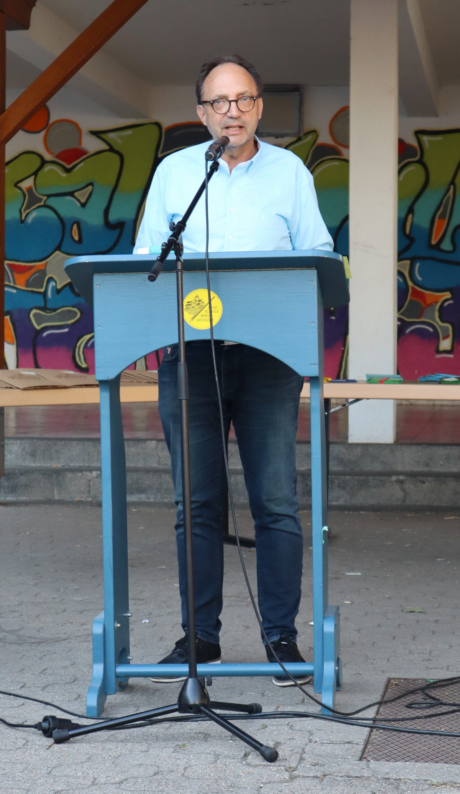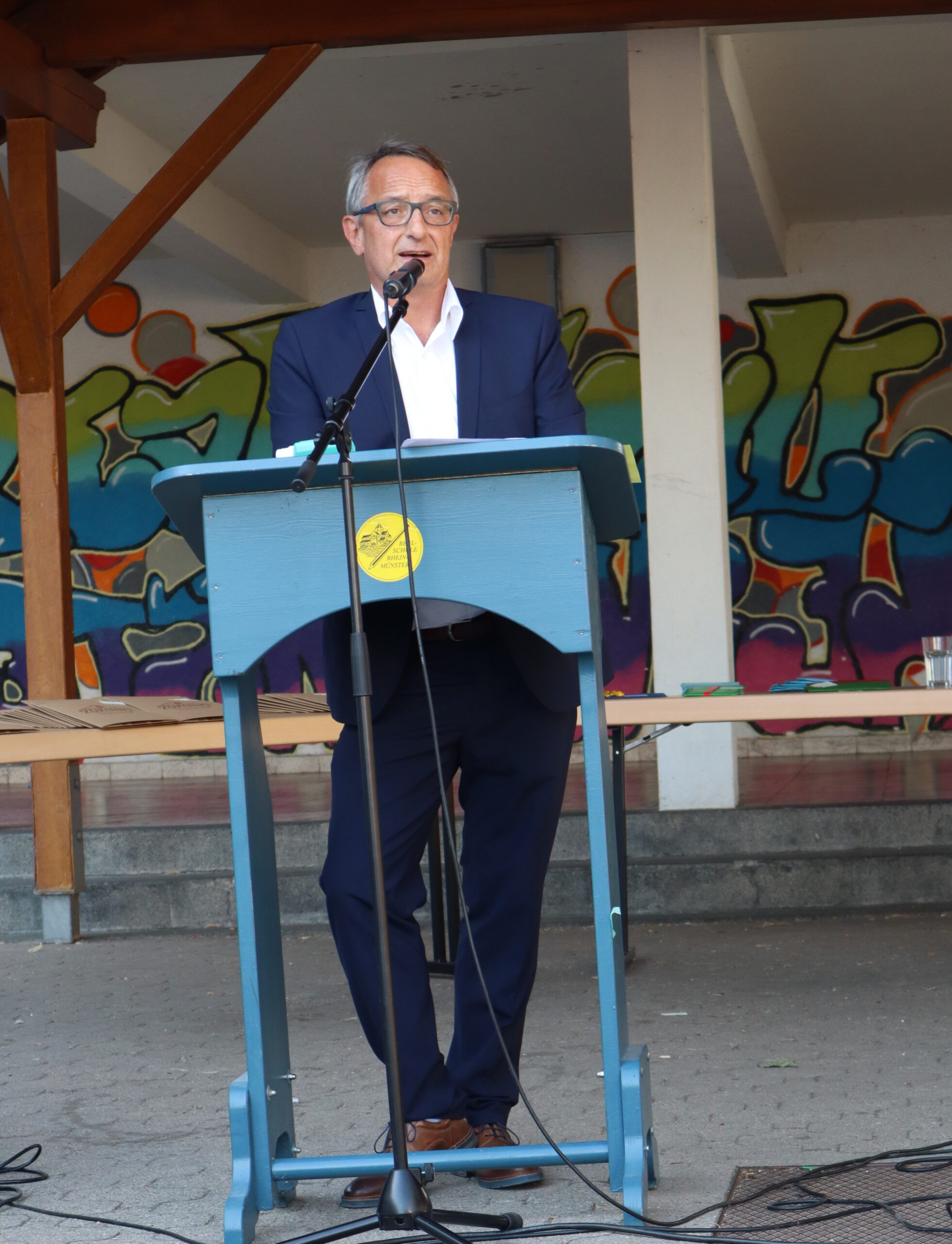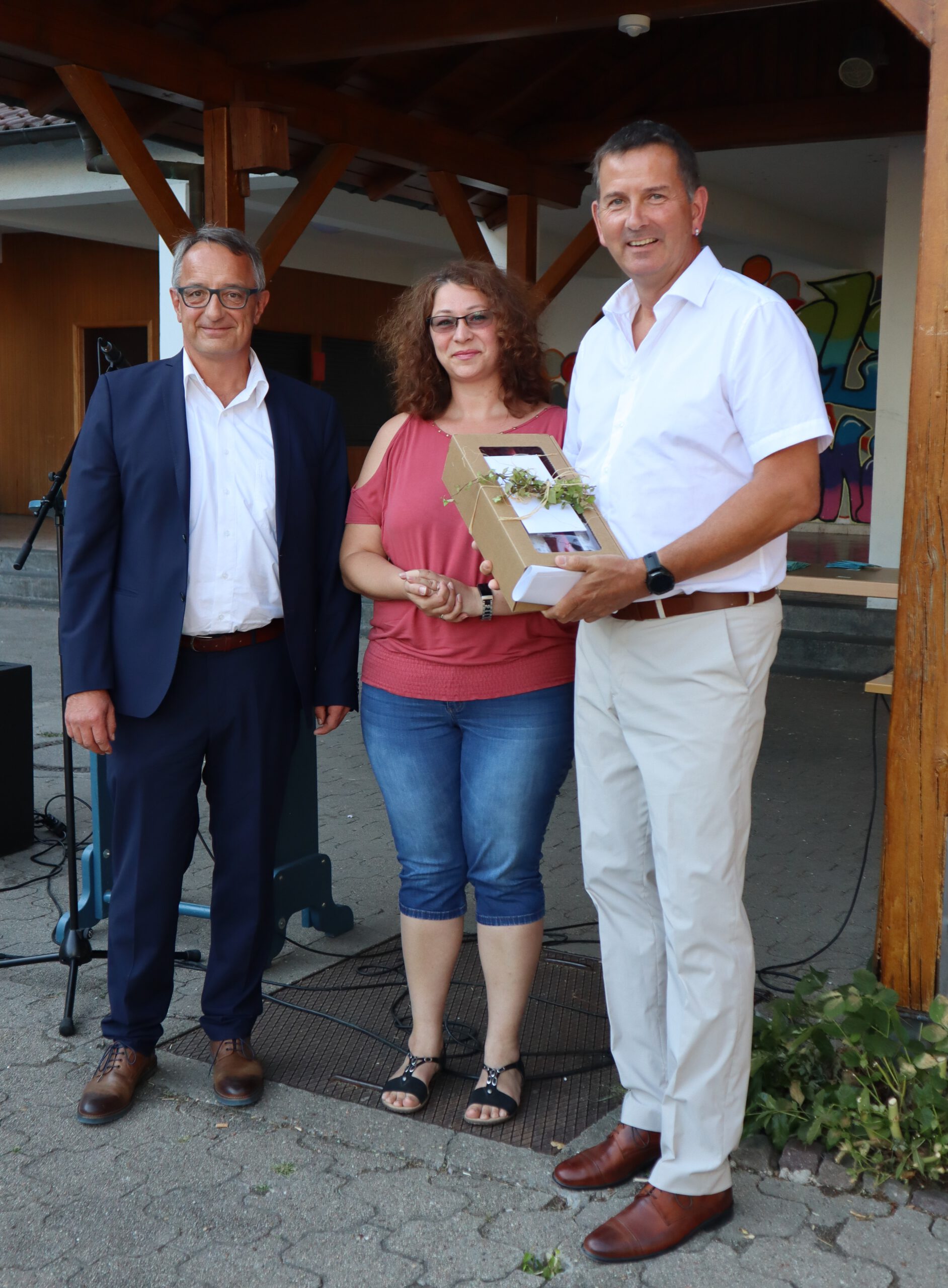 „Open Air“ im Schulhof: Bei strahlendem Sonnenschein und sommerlichen Temperaturen verabschiedete die Realschule Rheinmünster am Freitagabend 50 Absolventen des diesjährigen Mittlere-Reife-Jahrgangs sowie sieben weitere Schülerinnen und Schüler, die ihren Hauptschulabschluss nach Klassenstufe 9 erworben haben. Der Feierstunde vorausgegangen war ein liebevoll gestalteter Festgottesdienst im Schwarzacher Münster, der unter dem Motto „Die Schwingen ausbreiten und frei sein“ stand. Musikalisch eröffnet wurde die Entlassfeier im Schulhof von den beiden Absolventinnen Celina Maier am Klavier und Emélie Fritz an der Querflöte. Konrektor Thomas Herrmann oblag es, die 57 Entlass-Schüler und ihre Familien sowie zahlreiche Ehrengäste willkommen zu heißen. Rektor Rolf Schemel beglückwünschte die Absolventen der Mittleren Reife zu einem guten Gesamtnotendurchschnitt von 2,3. Schemel griff in seiner Rede das bereits im Gottesdienst verwendete Bild flügge werdender Vögel auf und verwies dabei auch auf die pandemiebedingten Widrigkeiten, denen die Schülerinnen und Schüler dieses Entlassjahrgangs in den zurückliegenden drei Schuljahren erfolgreich getrotzt hätten: „Manch einer von euch hat ordentlich Federn lassen müssen“, so Schemel, „aber ihr, die ihr heute Abend hier sitzt, habt außergewöhnliche Flexibilität und großes Durchhaltevermögen bewiesen – ihr werdet auch euren weiteren Weg erfolgreich gehen!“ Bürgermeister Helmut Pautler hatte die ehrenvolle Aufgabe, den beiden Schulbesten Kristina Merk und Zoe Stoiber, welche ihren Realschulabschluss jeweils mit einem Gesamtnotendurchschnitt von 1,0 bestanden haben, mit dem Preis der Gemeinde Rheinmünster auszuzeichnen. Er stellte in seiner Ansprache fest, dass Bildung der wichtigste Rohstoff Deutschlands sei und wandte sich an die Absolventen: „Ihr habt diesen wertvollen Rohstoff hier bekommen – macht was draus!“ Gleichzeitig sicherte er seitens der Gemeinde weiterhin große Anstrengungen dahingehend zu, dass Rheinmünster bei der Qualität und Ausstattung seiner Bildungsstätten konkurrenzfähig mit umliegenden Städten bleiben werde. Den Preis für besonderes soziales Engagement verlieh der Vorsitzende des Förderkreises, Dirk Hoffmann, an Emélie Fritz und Aaron Meier, die sich seit der sechsten Klasse durchgängig als Schulsanitäter engagiert haben. Hoffmann selbst scheidet nun nach sieben Jahren als Vorsitzender des Förderkreises aus und nutzte die Gelegenheit, seine Nachfolgerin, Antje Burkart, vorzustellen. Nach den Ansprachen der Klassenlehrer Anne Wyss (9c-G), Thomas Wertal (10a) und Manuel Hauth (10b) erhielten die scheidenden Zehntklässler die ersehnten Abschlusszeugnisse. 14 Schüler wurden für einen Gesamtnotendurchschnitt bis 1,9 mit einem Preis bedacht, weitere 7 Schüler erhielten für eine Mittlere Reife bis 2,2 ein Lob. Die Leiterin der Schulbibliothek, Monika Kohl-Wald bedankte sich bei fünf langjährigen Mitgliedern für ihr Engagement im Bibliotheks-Team. Geehrt wurden: Emely Hurrle, Kristina Merk, Aaron Meier, Laura Müller und Silvana Schnurr.